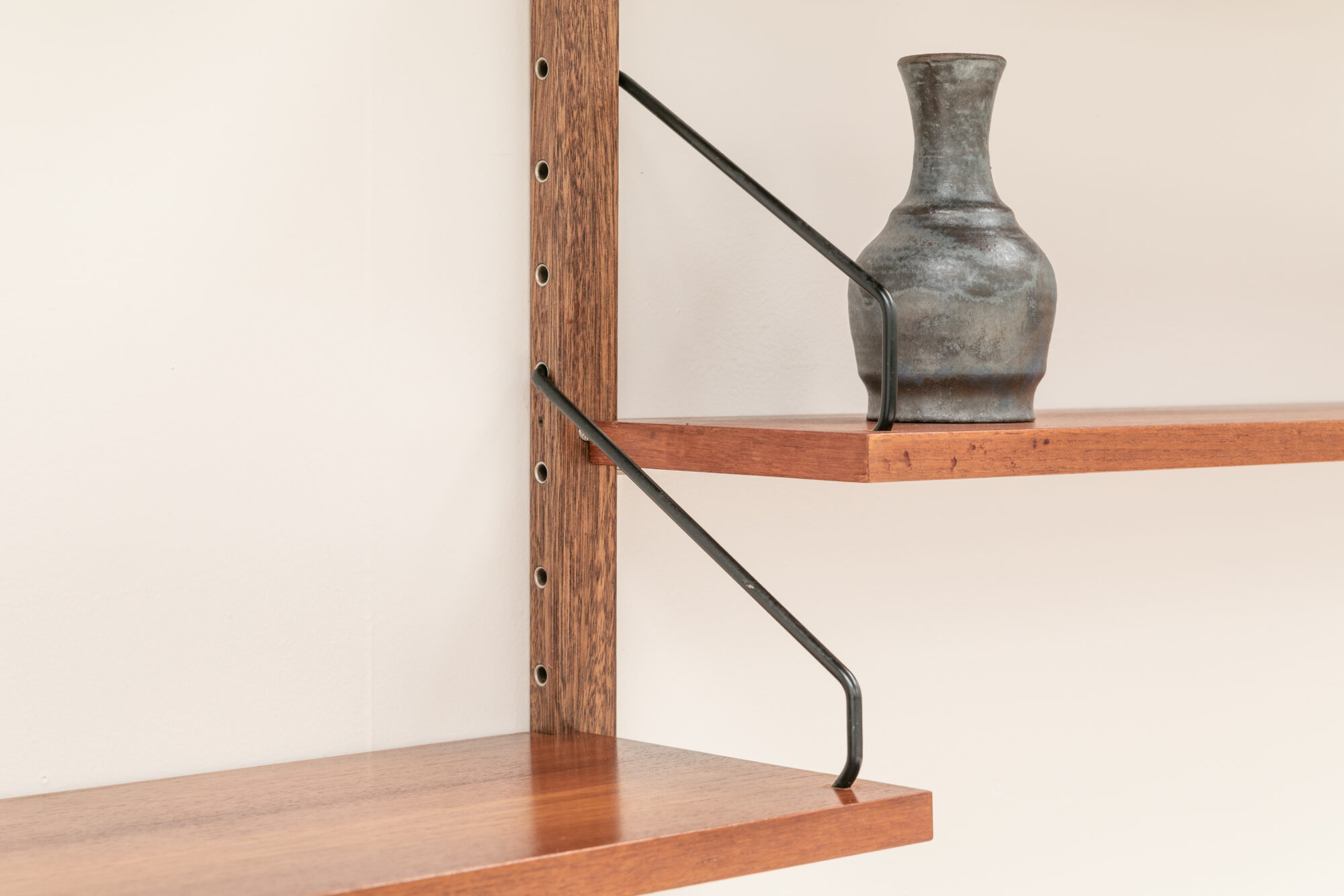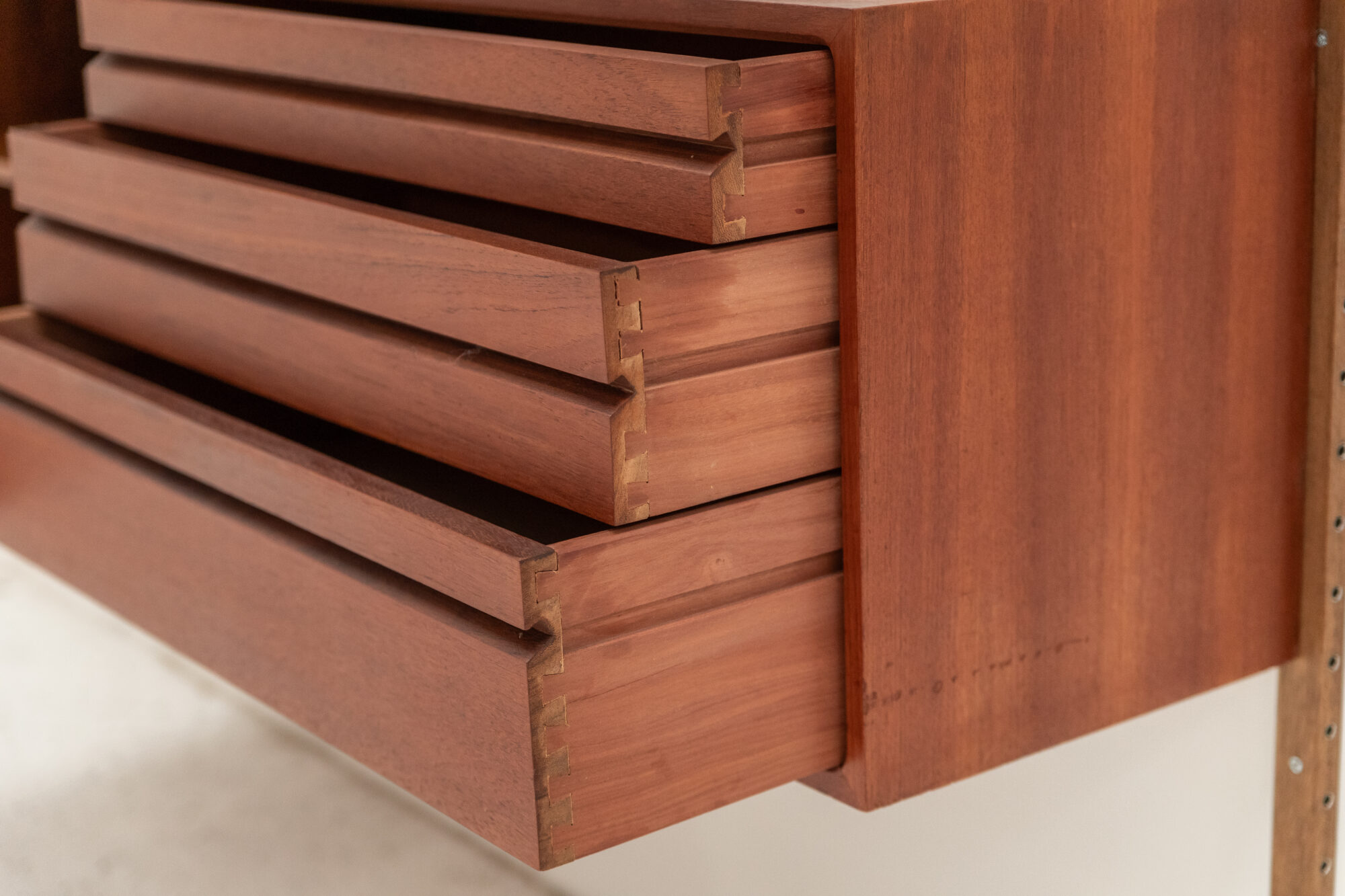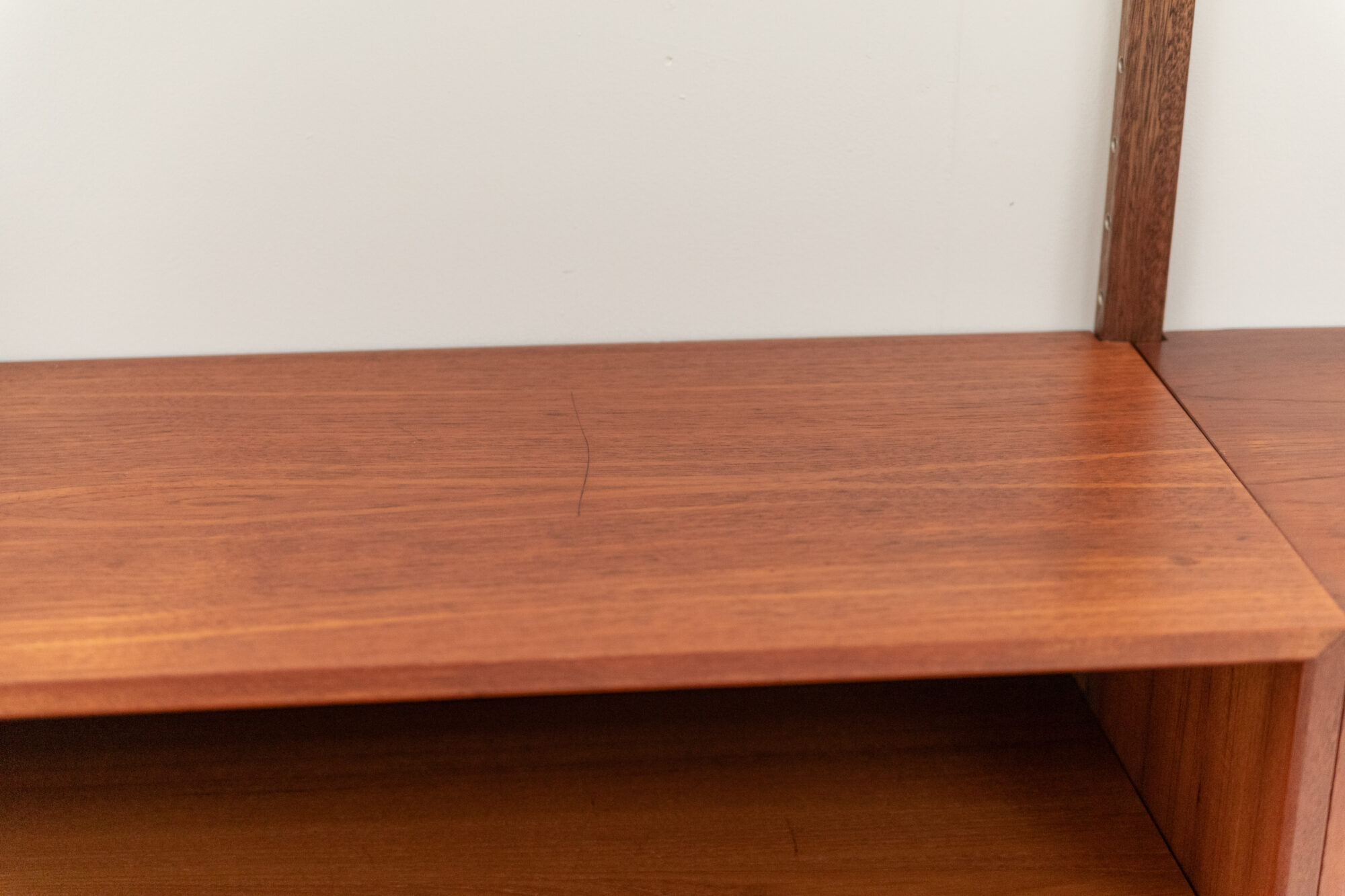 4-Bay teak wall unit, designed by Poul Cadovius and produced by Cadovius in Denmark, during the 1960’s. The system consists of five original wooden floating supports, two cabinets with a depth of 37,5 cm and height of 42 cm, a double drawer element and six shelves. One cabinet is from the luxurious Cado series, with a fold down and a key and a simple shelf inside. This cabinet has a filled up cable hole on each side, drilled by a previous owner. The other big cabinet is from the Royal series and has 3 drawers. There’s a using mark on the right hand side. The small cabinet with teak sliding doors has also a shelf inside that can be taken out. The double drawer has a small burn mark on the top. The set also includes one shelf with a depth of 30 cm and 5 shelves of 20 cm. All black metal brackets and metal shelf and cabinet supports are included in the price. The Cadovius wall units are modular so you can organise the shelves and cabinets at will or expand your system later on. Previously mentioned using marks are pictured, further in good condition.