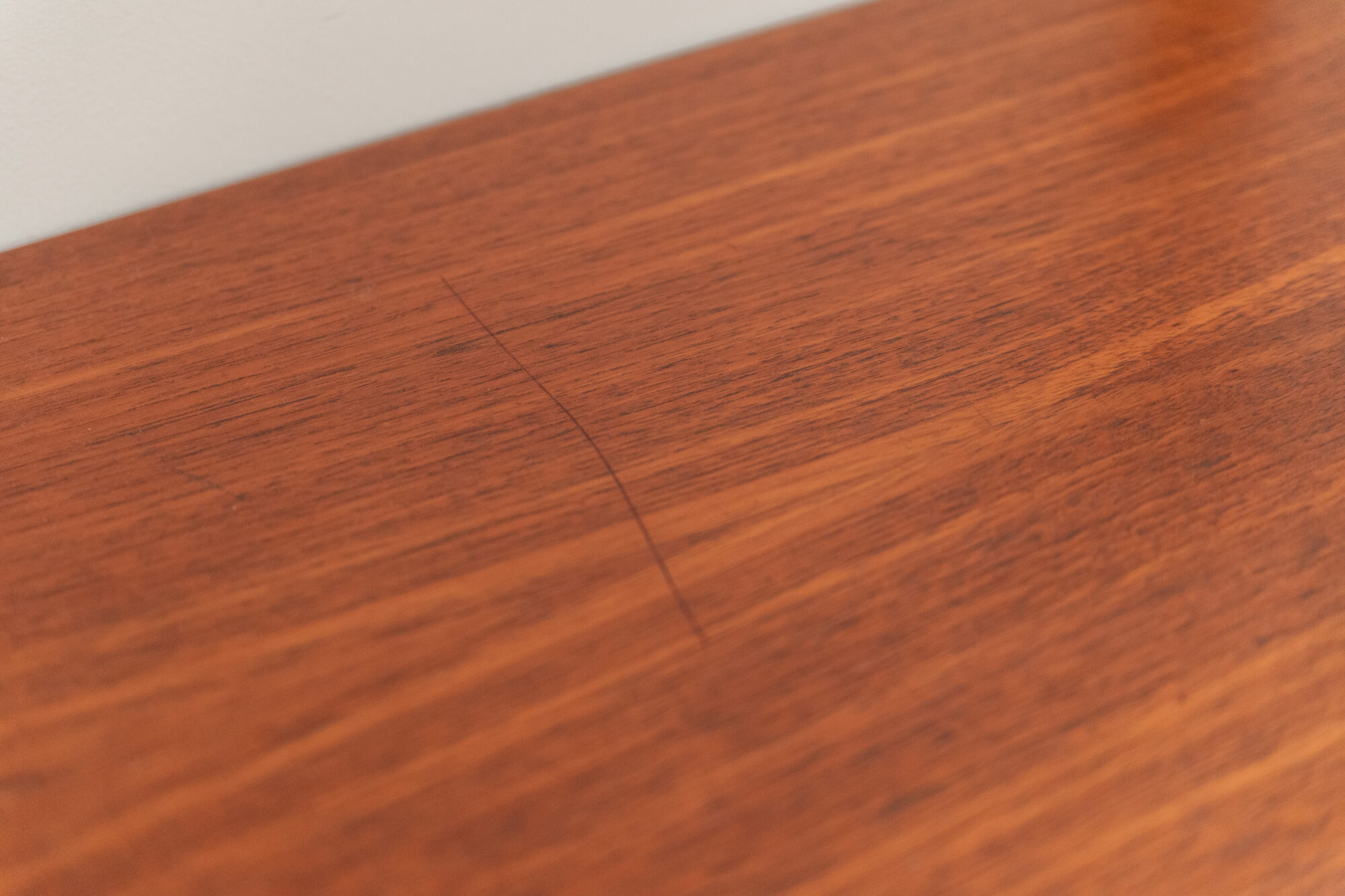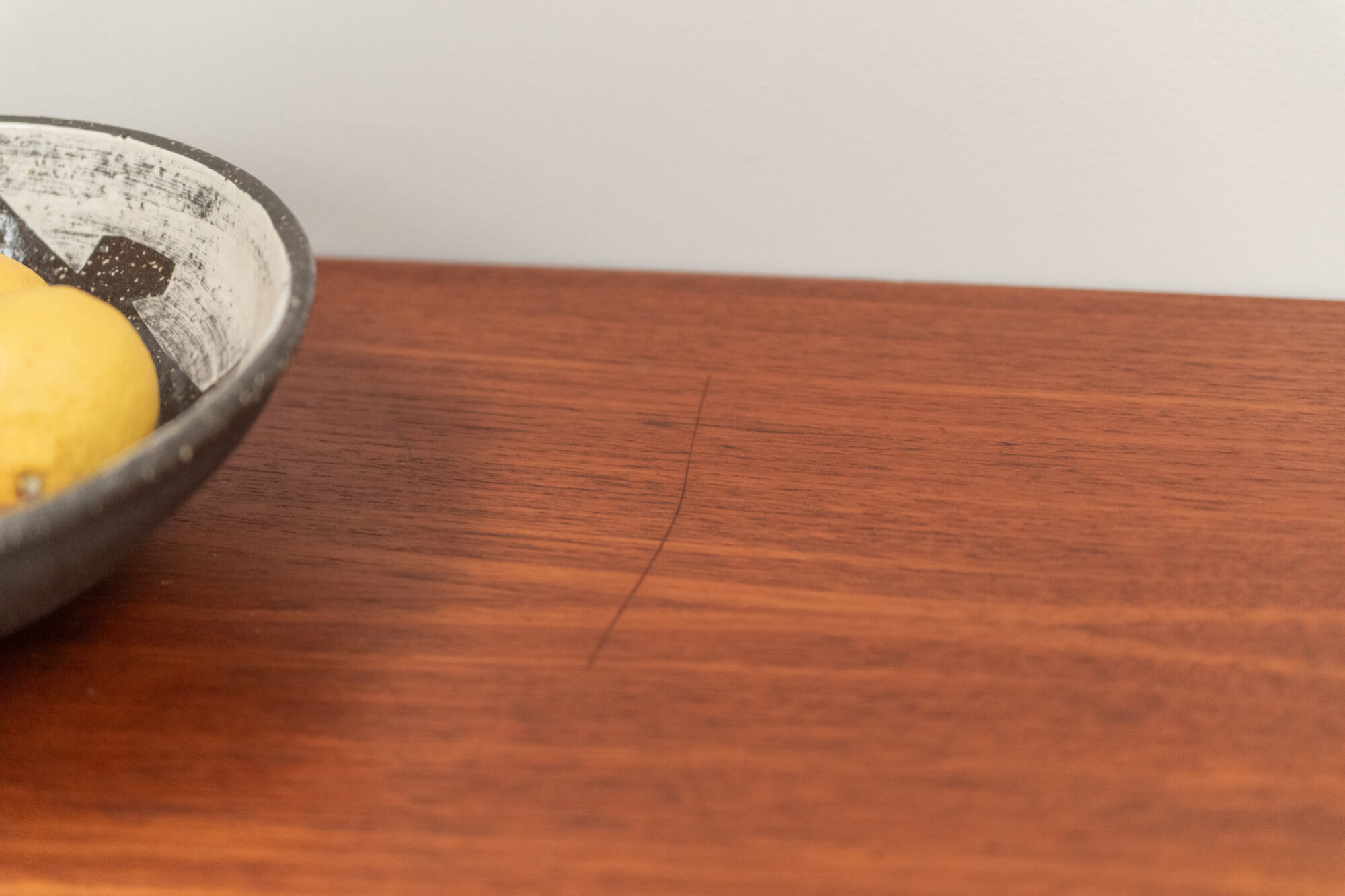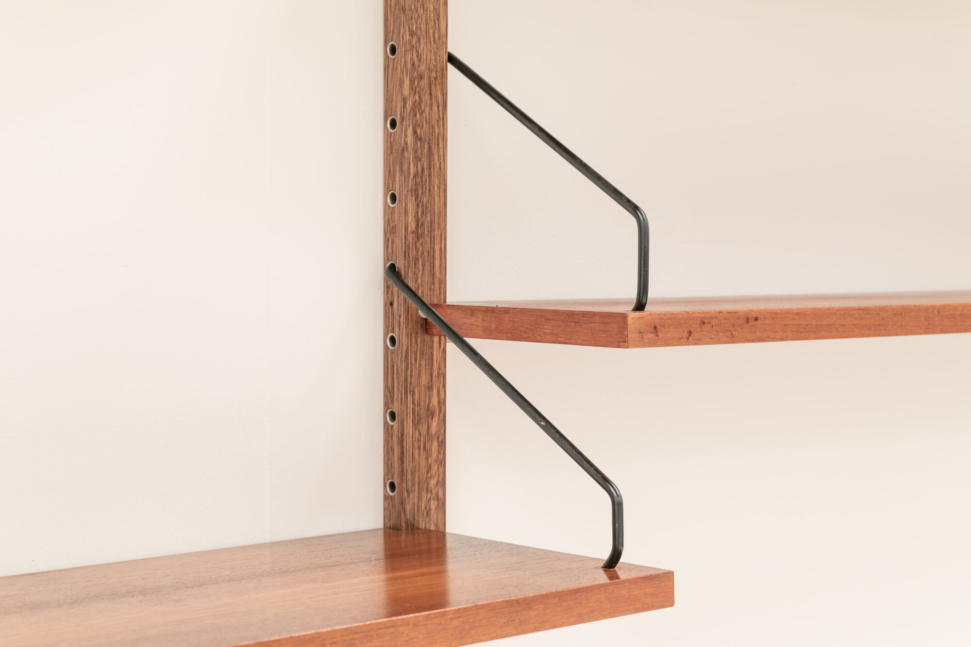 4-Bay teak wall unit, designed by Poul Cadovius and produced by Cadovius in Denmark, during the 1960’s. The system consists of five original wooden floating supports, two cabinets with a depth of 37,5 cm and height of 42 cm, a double drawer element and six shelves. One cabinet is from the luxurious Cado series, with a fold down and a key and a simple shelf inside. This cabinet has a filled up cable hole on each side, drilled by a previous owner. The other big cabinet is from the Royal series and has 3 drawers. There’s a using mark on the right hand side. The small cabinet with teak sliding doors has also a shelf inside that can be taken out. The double drawer has a small burn mark on the top. The set also includes one shelf with a depth of 30 cm and 5 shelves of 20 cm. All black metal brackets and metal shelf and cabinet supports are included in the price. The Cadovius wall units are modular so you can organise the shelves and cabinets at will or expand your system later on. Previously mentioned using marks are pictured, further in good condition.