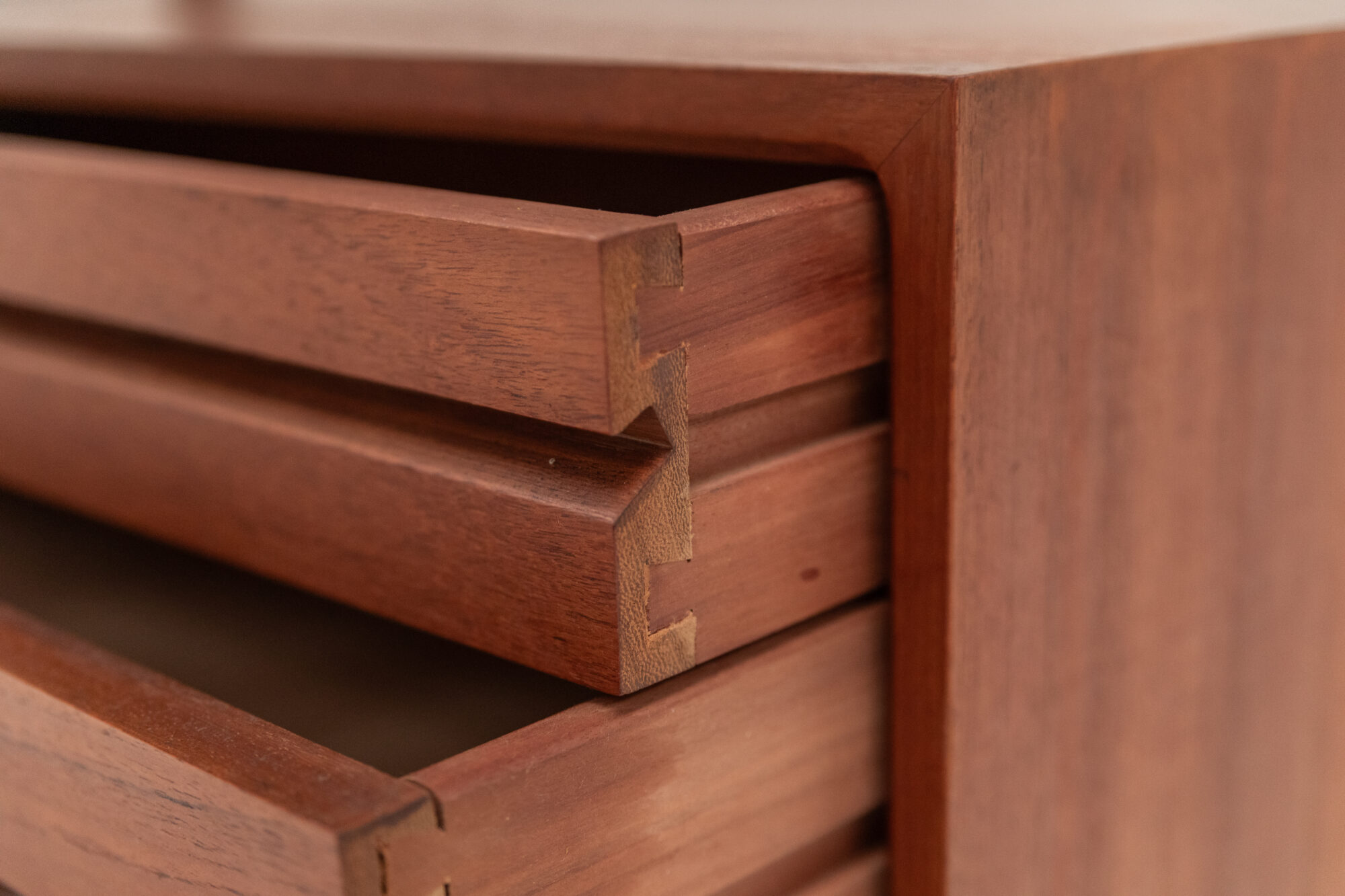 In the 1960’s Cadovius came up with another line of wall units: the Cado System, with wooden corners supporting the shelves in stead of metal brackets. Since 1967 this luxurious line was produced in Cadovius own ‘Cado’ factory that he took over from France and Son. Although this was one of the first teak production facilities of industrial size in Denmark with over 300 employees, Cado became a household design name and the company worked with some of the country’s most famous designers like Arne Vodder, Grete Jalk and Finn Juhl.