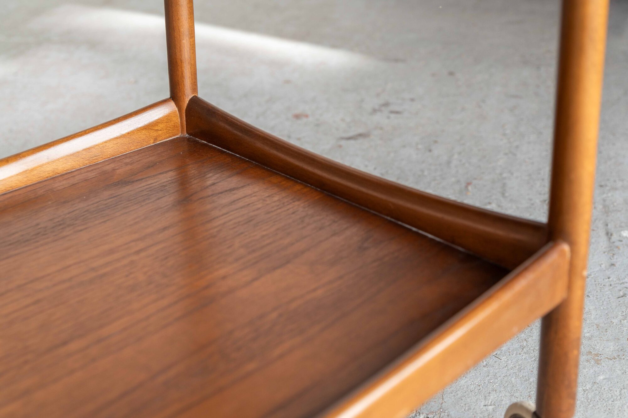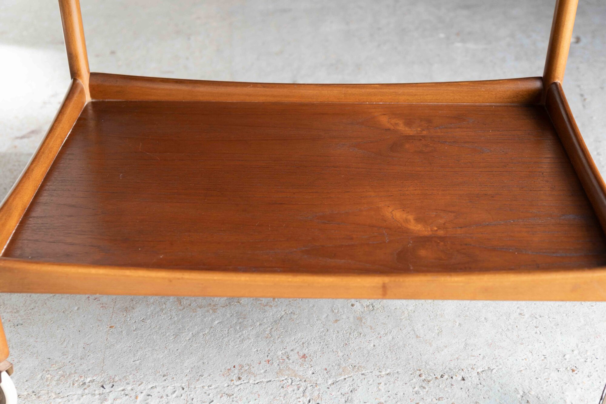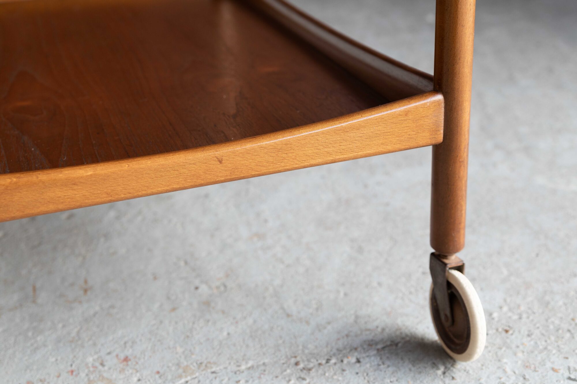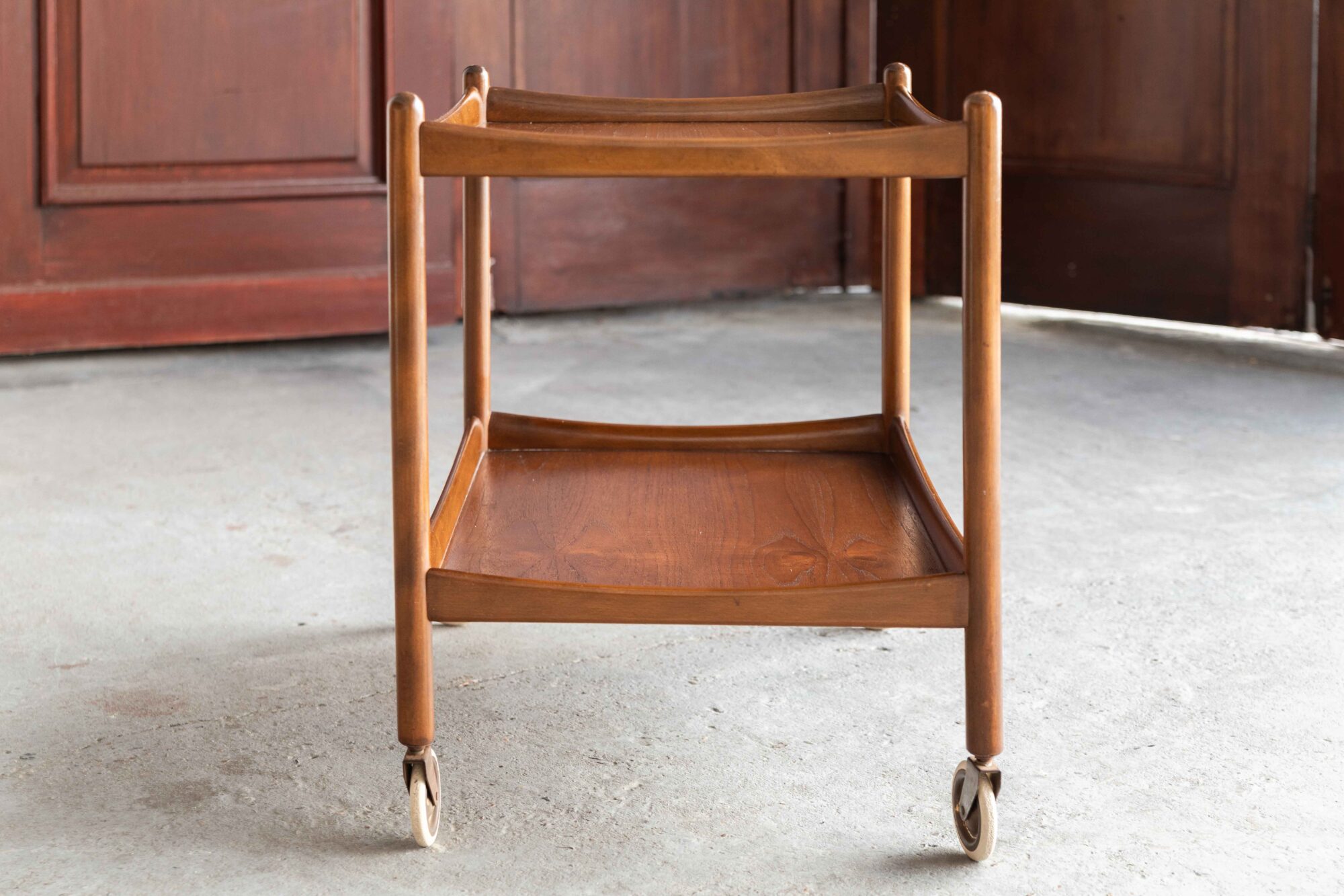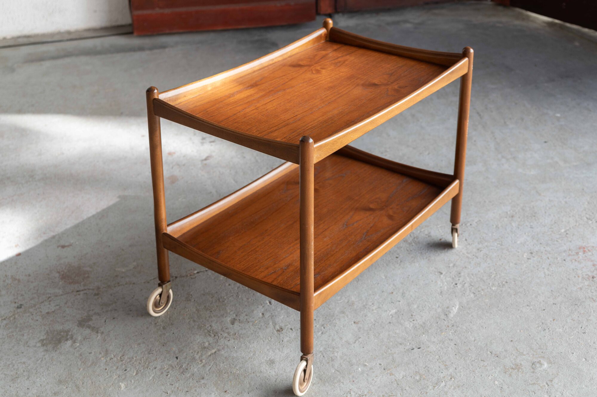 Elegant bar cart, designed by Poul Volther rand produced by Gemla Mobler in Sweden in the 1960’s. This teak trolley has two tiers to carry a lot of bottles, glasses or a tea pot and cups, ideal for a tea party or a cocktail evening! The wood shows a nice grain. In very good condition, as shown in the pictures.