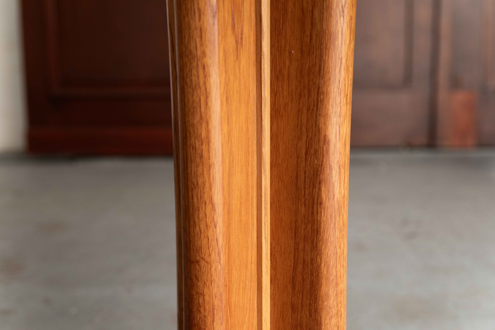 This dining table was designed and produced by Dyrlund in Denmark in the 1960’s. It’s a versatile piece that can be used as a round table for 4 or extended with one or two extra leaves of 50 cm each in case you have extra guests. The style is reminiscent to tables by Niels Bach and Niels Moller. The quality is high, hence the beautiful wengé inlays on the round edges, the sturdy metal support rails underneath and the hexagon shaped edges in solid teak wood, protecting the veneer tops. The tension clasps underneath the top hold the extra leaves together tightly. There’s a few superficial scratches in the varnish and a small chip missing on the inside of one of the solid, blonde teak legs, further in very good condition.