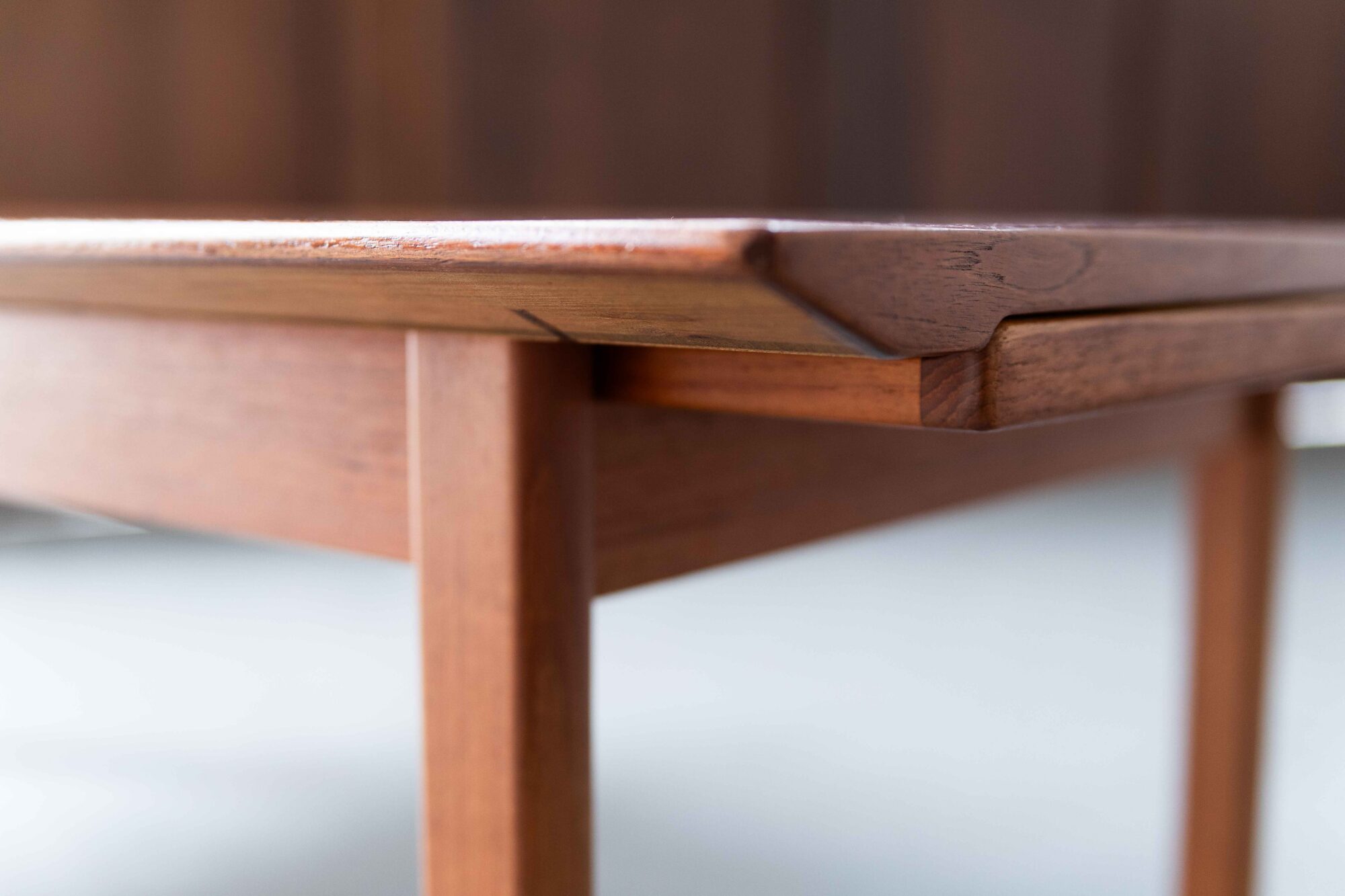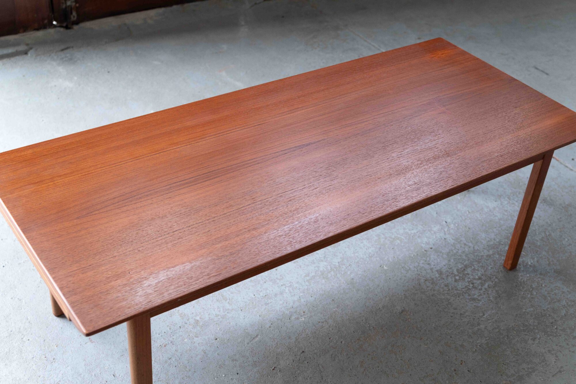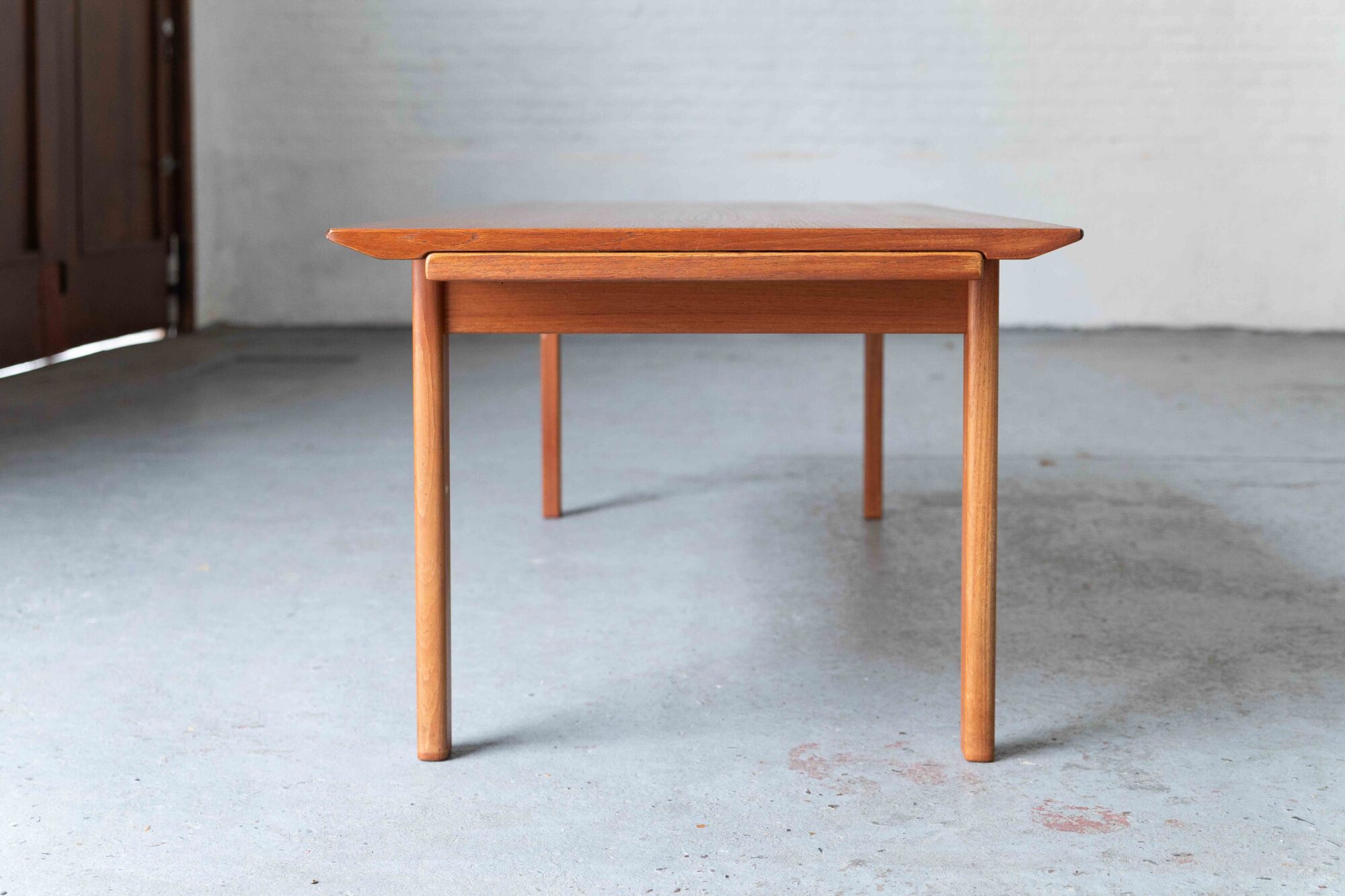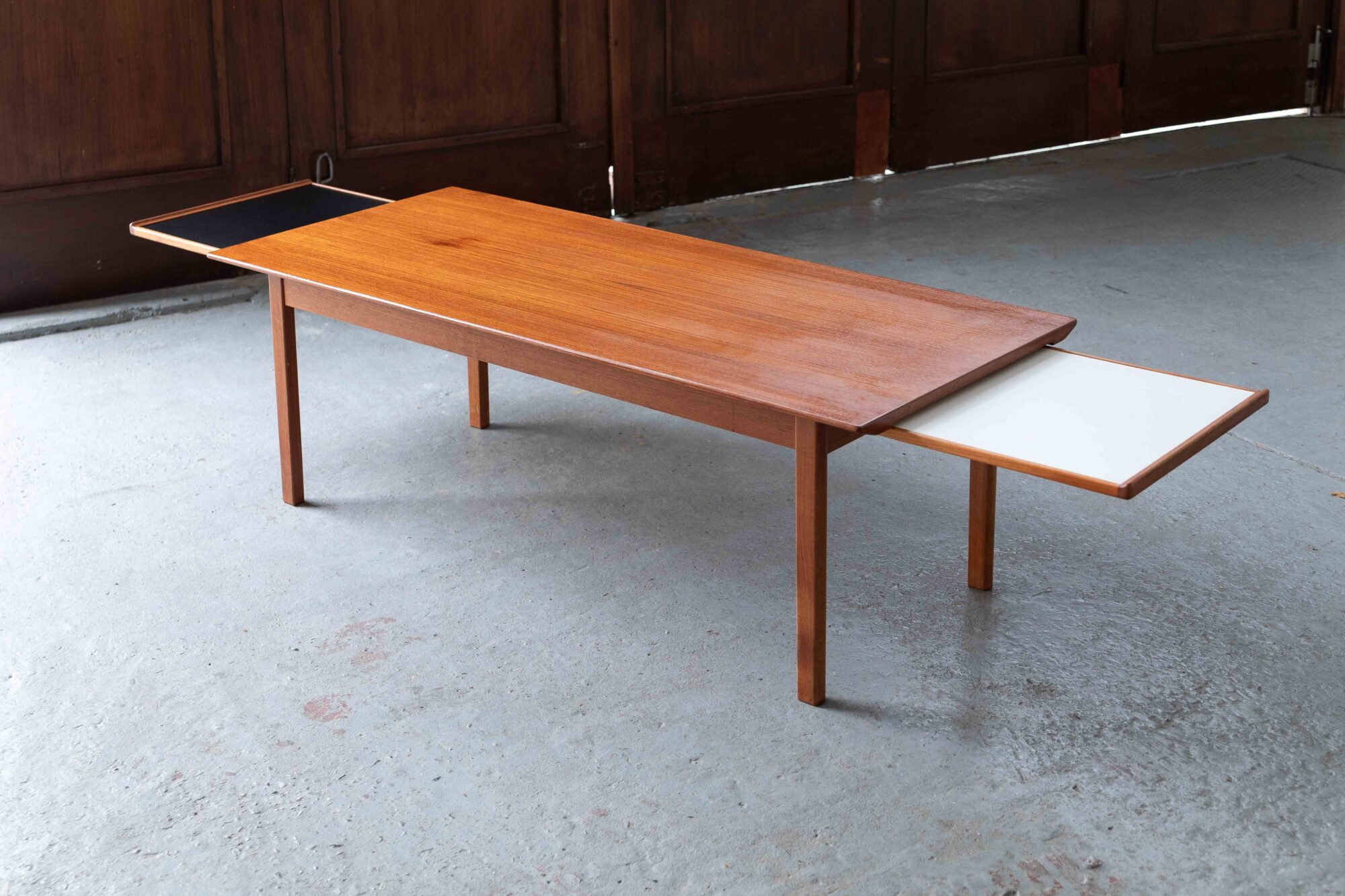 Teak xl coffee table, designed by Edvard & Tove Kindt-Larsen and produced in Denmark by Ab Seffle Möbelfabrik in the 1960’s. This big rectangular coffee table can be extended to a total lenght of 224 cm with a retractable leaf, on both sides, one laminated in white, the other in black. In very good, restored condition. Varnish on the top was renewed in our own workshop.