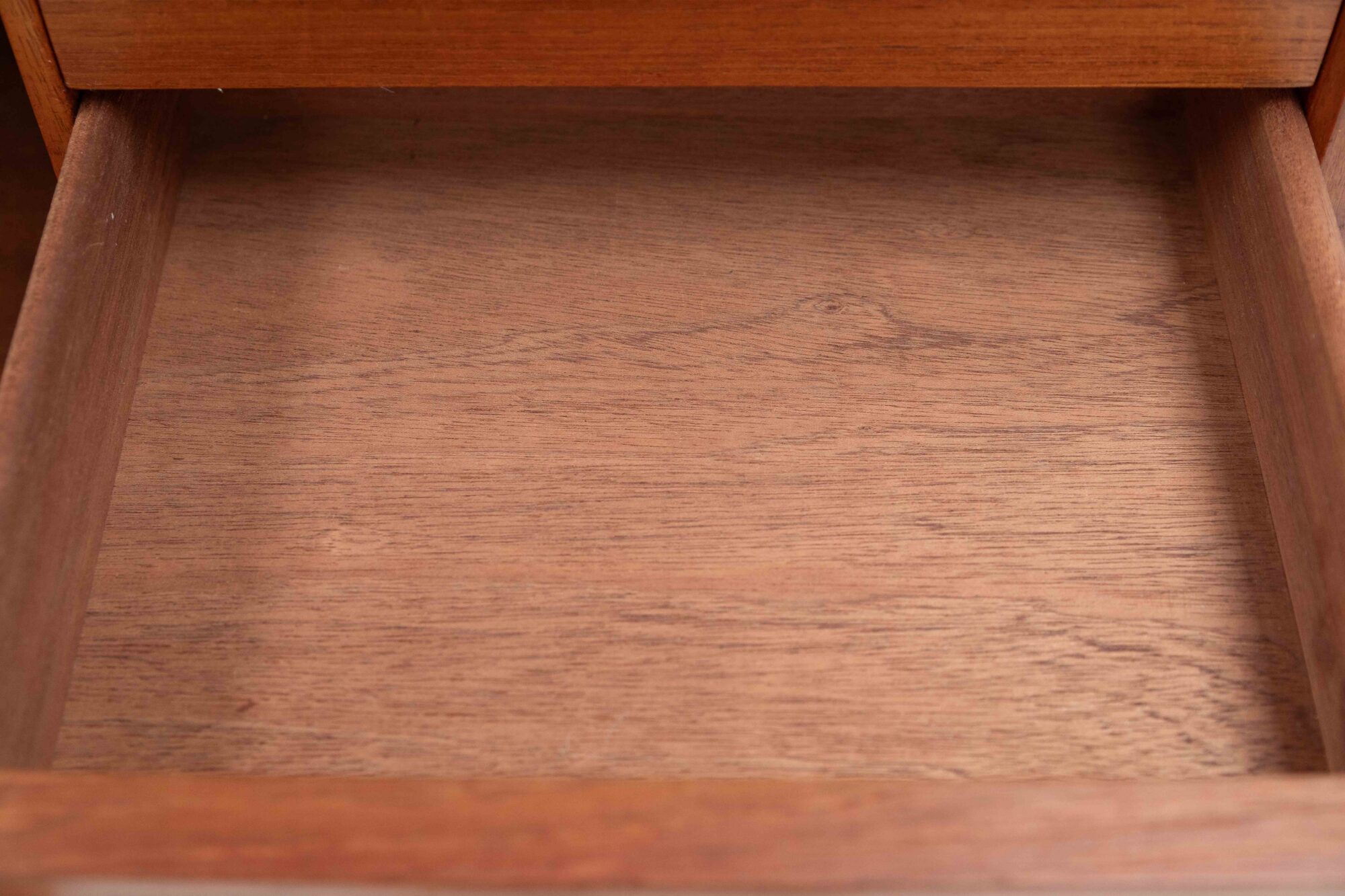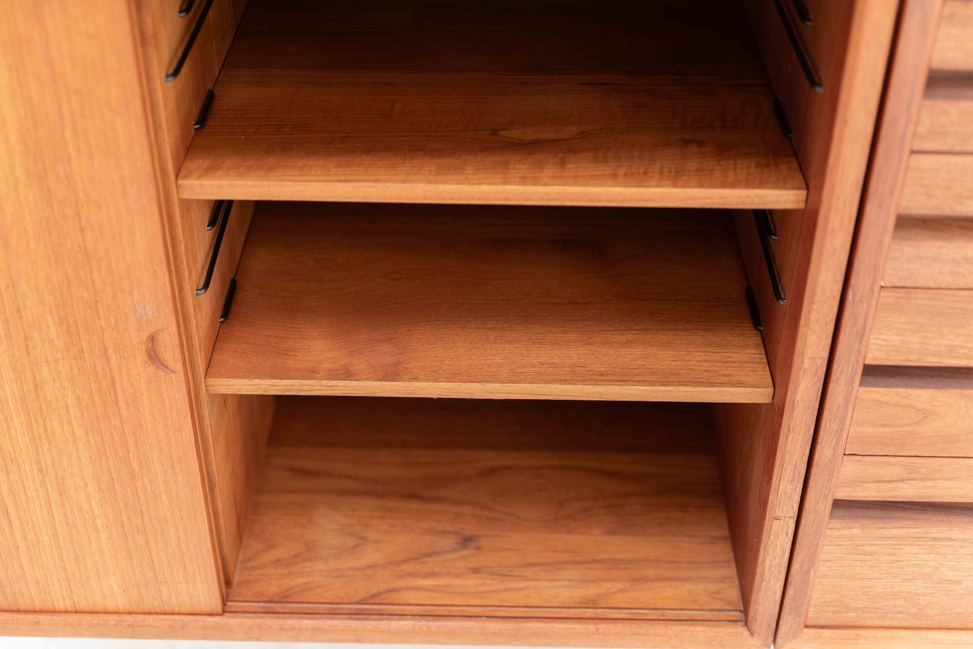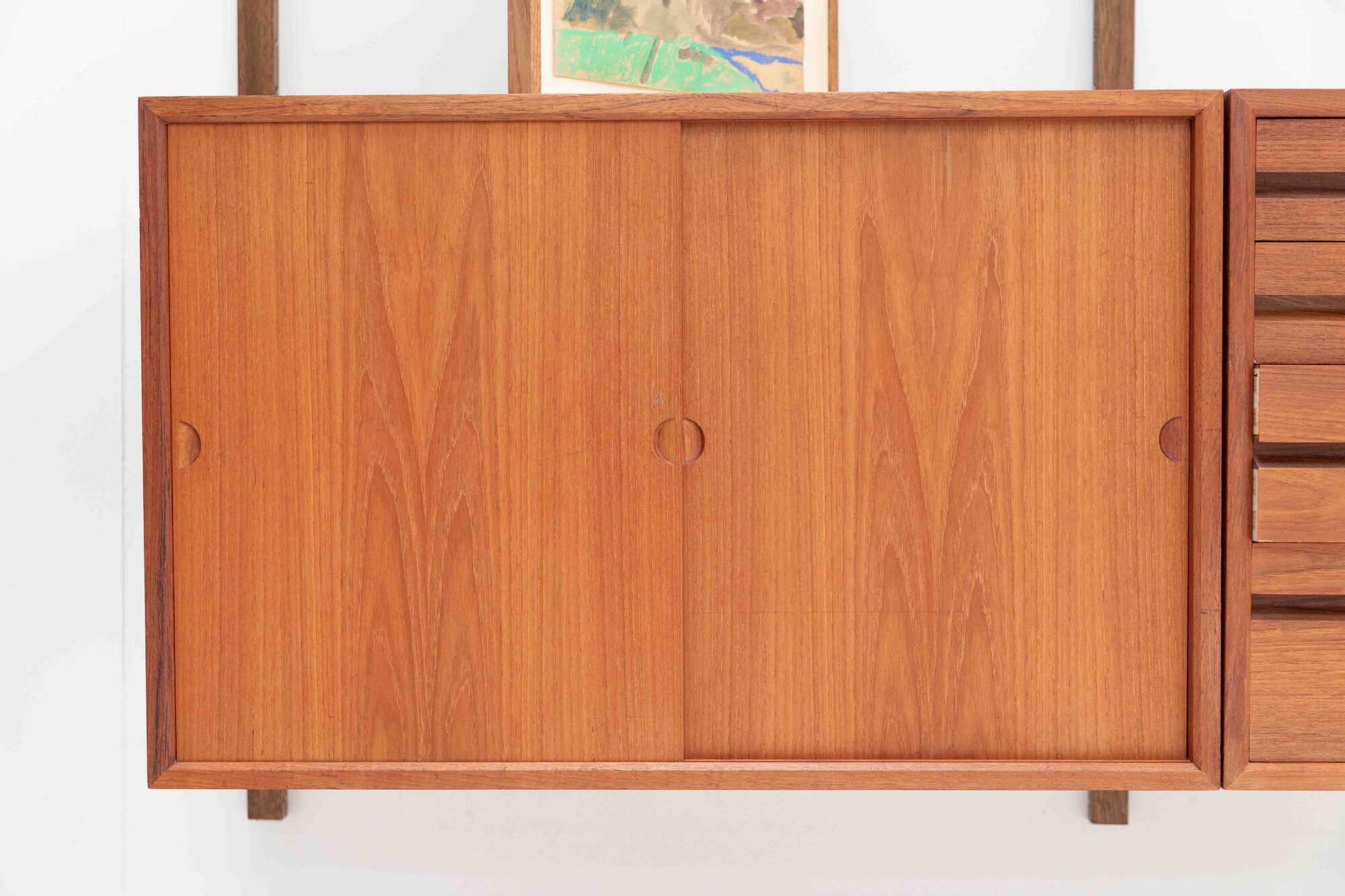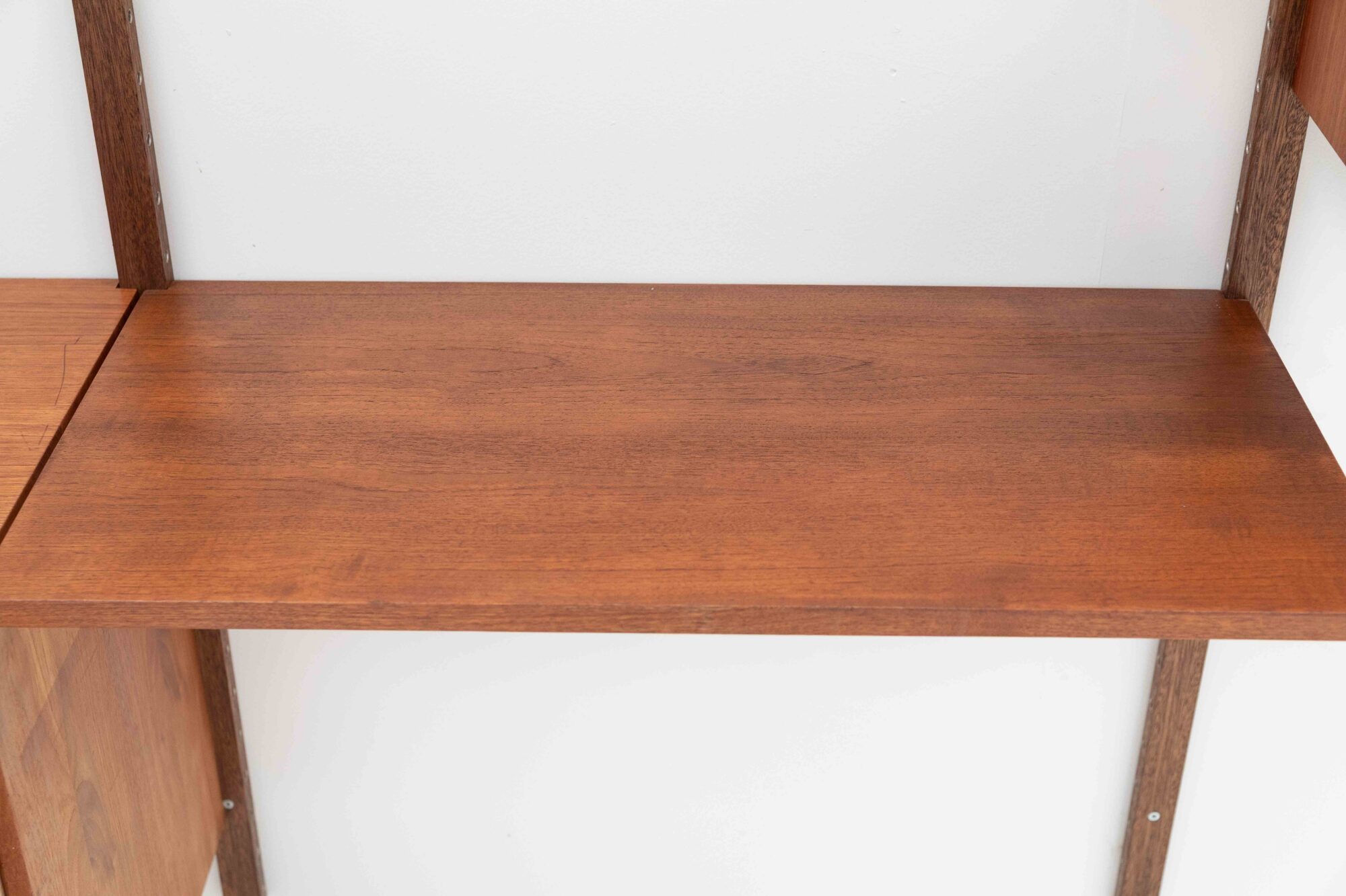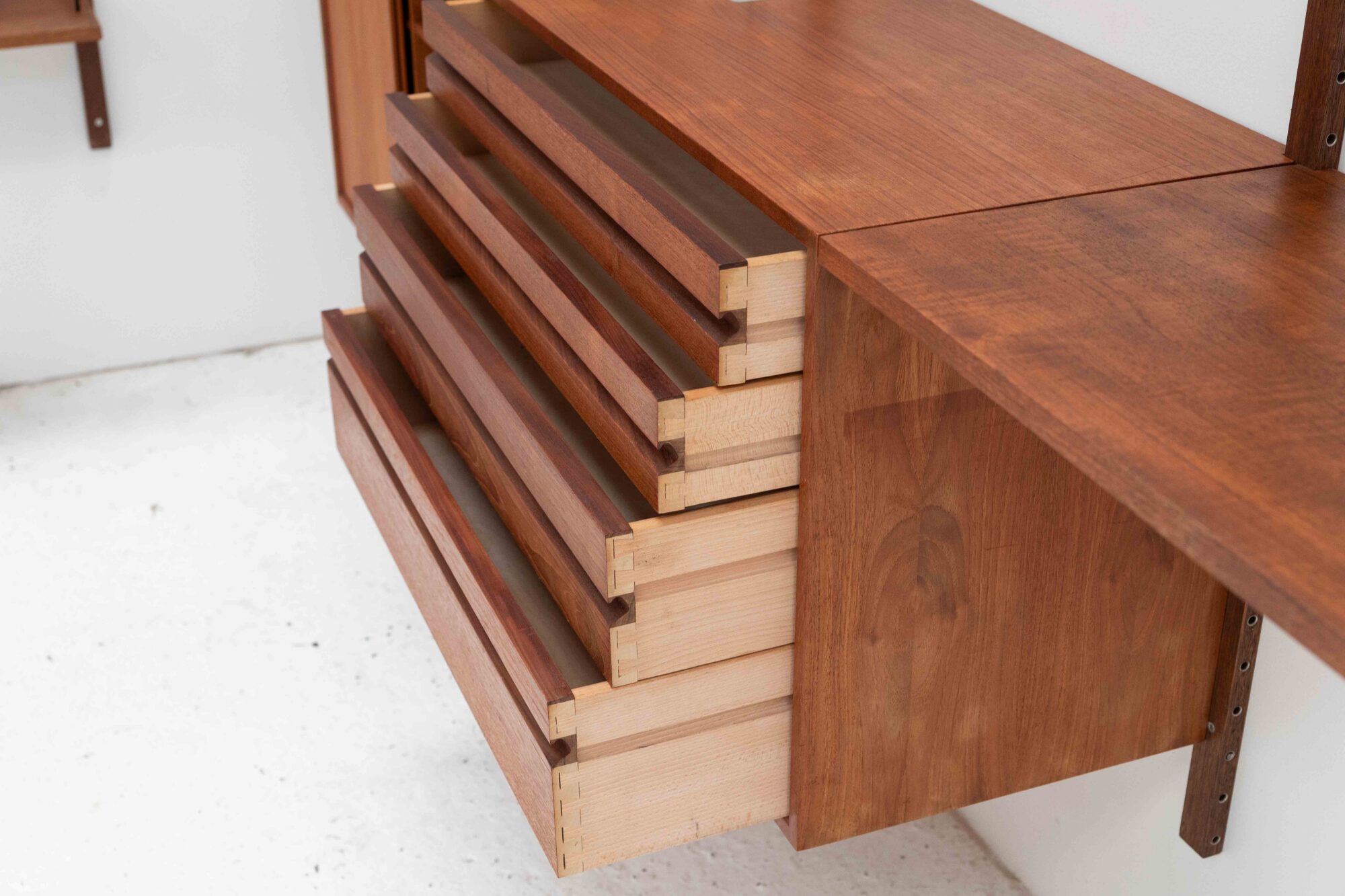 4-Bay teak wall unit, designed by Poul Cadovius and produced by Cadovius in Denmark, during the 1960’s. This Cado series system consists of five wooden floating supports, a, a big sliding doors credenza with a depth of 40 cm, a height of 51 cm, a four drawer cabinet of the same size, a desk shelf of 40 cm, a storage cabinet with a fold down door and 2 neat little drawers. There’s also 8 shelves of 20 cm of depth included, just as the black metal hooks. In very good condition. The pictured artworks books and deco are not included in the price.