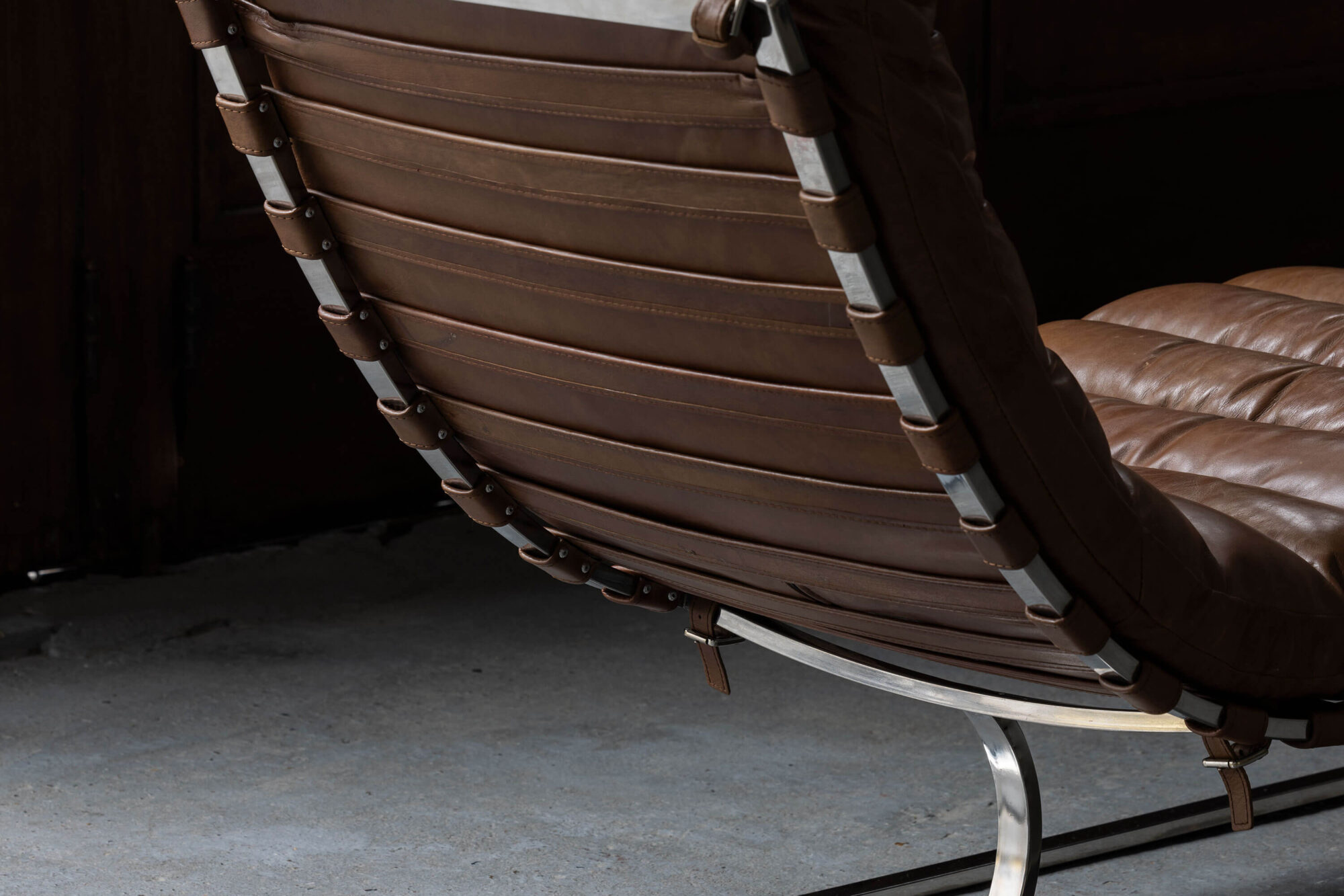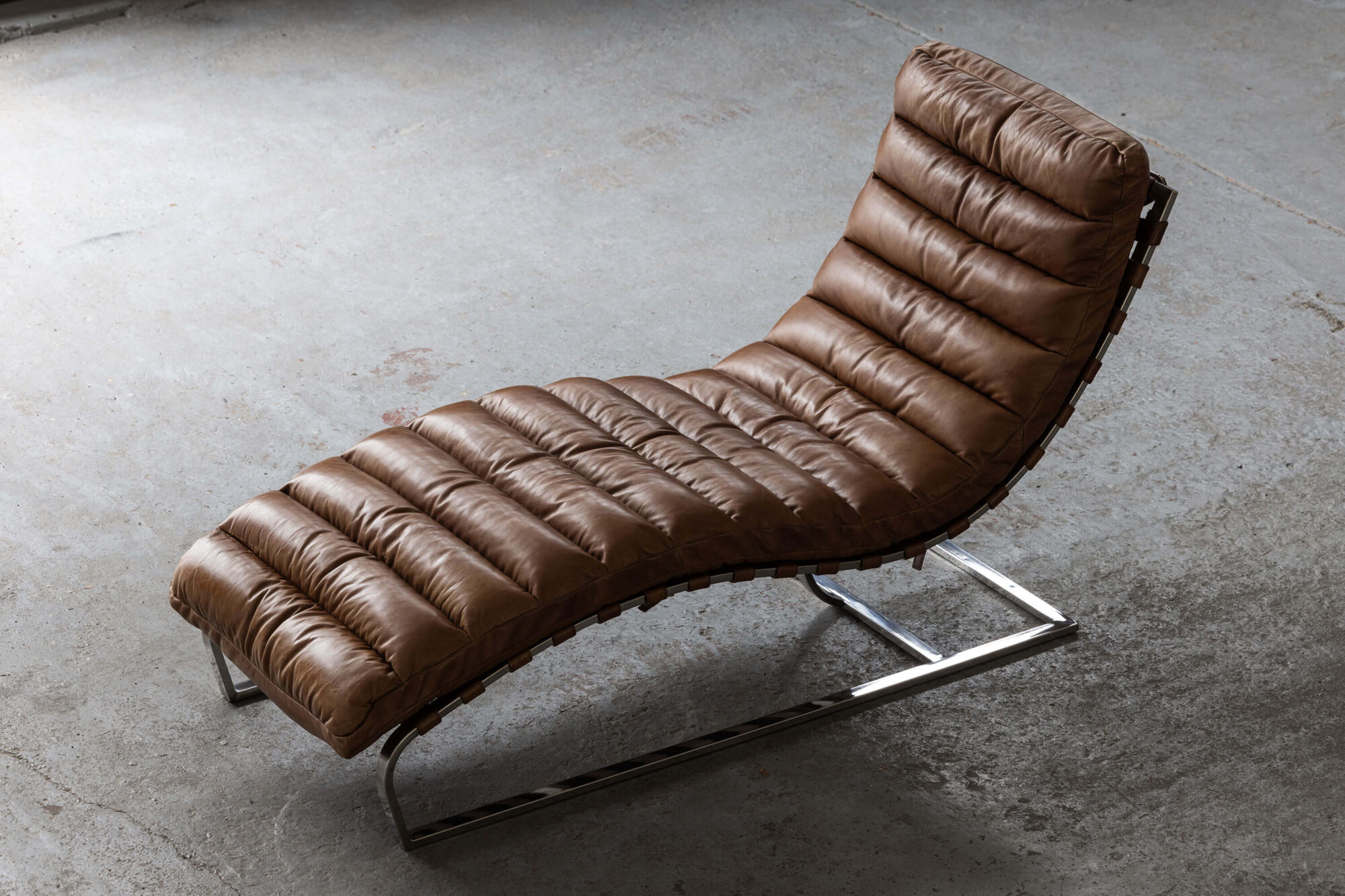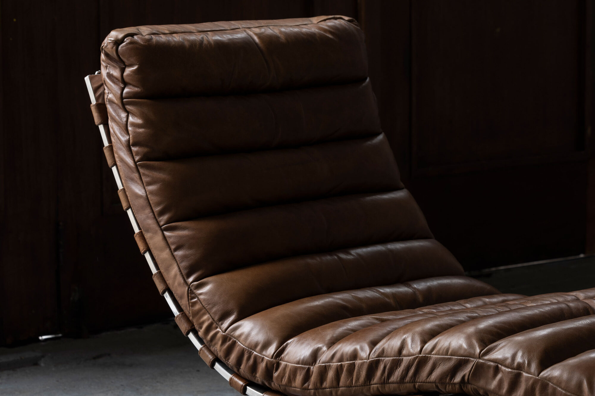 The Oviedo Lounge Chair by Timothy Oulton is a re-edition of an MR Lounge chair by Mies van der Rohe produced by Flamant in the UK. This Bauhaus styled chair, with its unique, curved cantilever frame supporting a Brazilian leather cushion, is a real eye-catcher. Very comfortable and supportive at the same time. There’s a few lighter stains on the leather at the bottom of the chair, but further in very good condition as shown in the pictures.