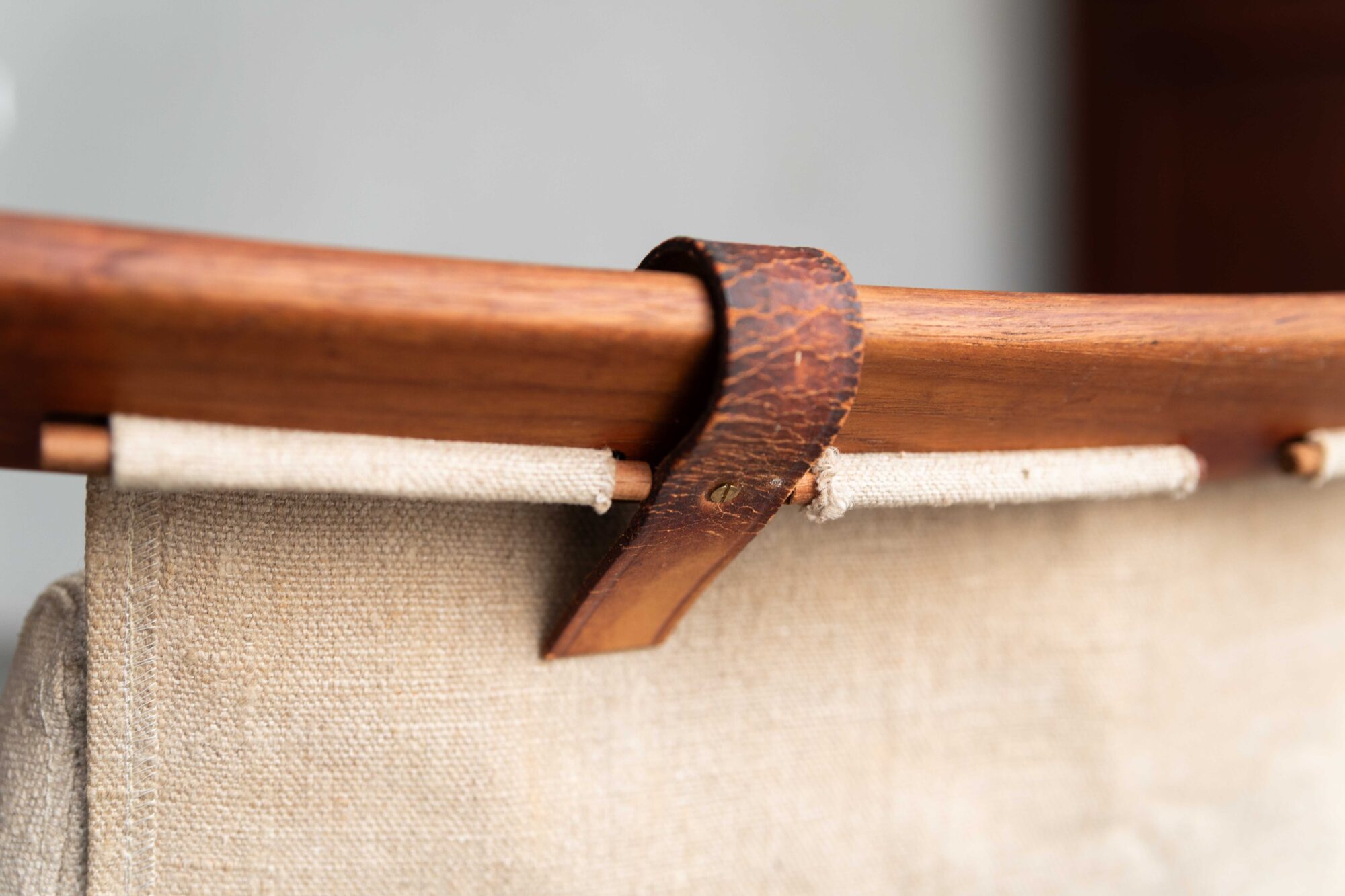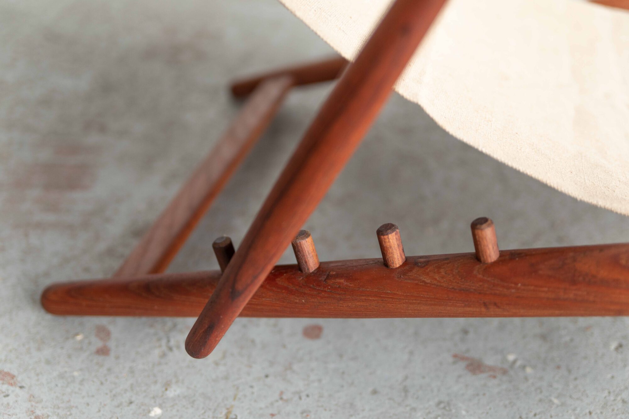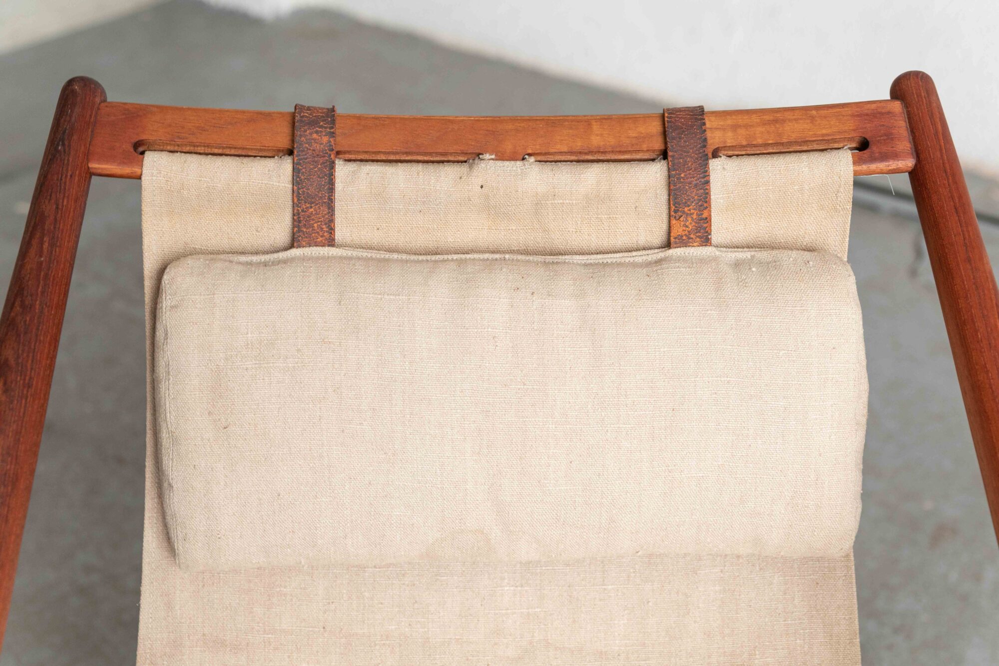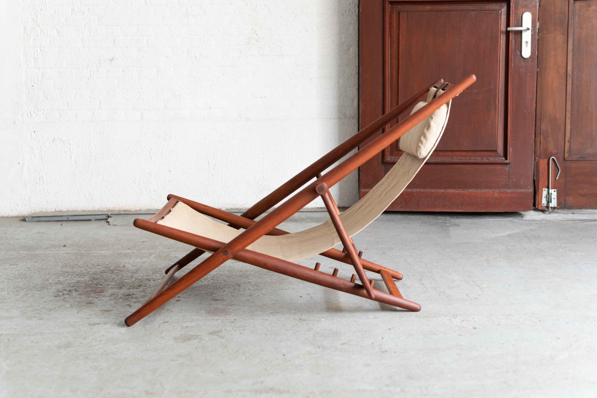Terrace lounge chair ‘H55’ designed in 1954 by Bjorn Hulten and produced by Berga Form in Sweden. Its refined elegance still looks quite modern. Thanks to its adjustability, relaxed fabric seat and neck pillow, the H55 provides good seating comfort while enjoying the sunshine.The frame of the easy chair is made of beautiful, teakwood in this earlier and slightly bigger version. The newer versions got a metal rod holding the backrest in stead of a teak one.The H55 can be folded easily for inside storage. The natural canvas and leather straps are not waterproof so the chair has to be stored inside. A few small stains on the canvas and the leather looks a bit crackled, further in very good, original condition. We have a similar, newer version of the H55 available as well.