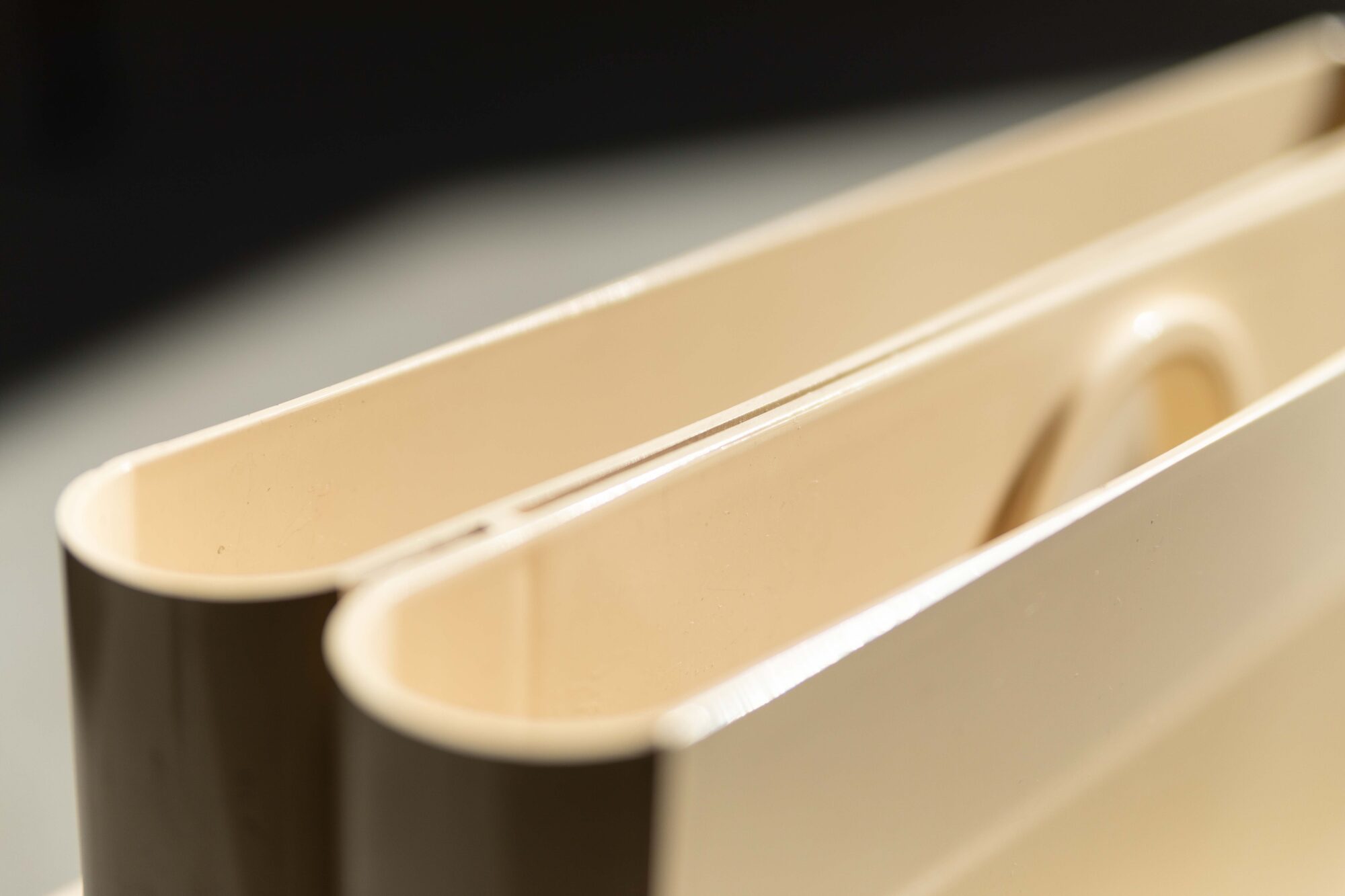 Magazine holder, designed by Giotto Stoppino for Kartell in Italy during the 1970’s. This cream white ABS plastic newspaper stand is a design classic. This is the 4 slot version. There’s one small crack in the surface, but further in good condition. Maker’s label by Kartell underneath.