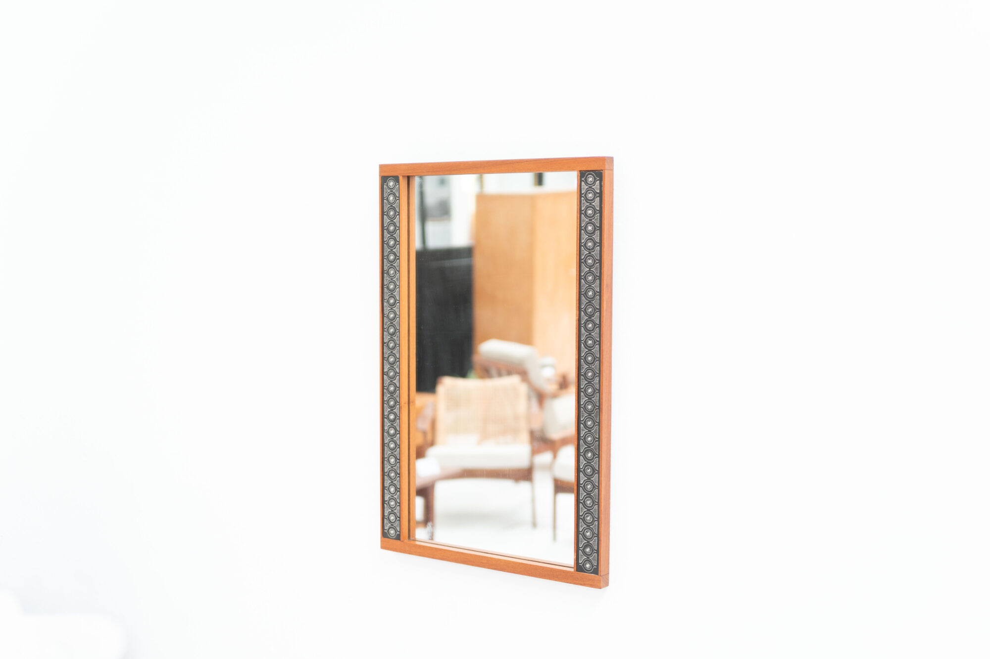 A rare teak wall mirror, designed by Hans-Agne Jakobsson and made in Åhus, Sweden in the 1950s. Labelled on the back. A very simple rectangular mirror with teak frame from the early years of Jakobsson’s own work. The elegant frame is nicely made, and decorated to both long sides with paper inlay in black and white. This form of paper-based decoration is found on other Jakobsson designs of his Åhus years. The piece is in good overall condition, with minor signs of wear from age and use. The glass is in very good condition. The frame has only light marks and shows a very nice patina.