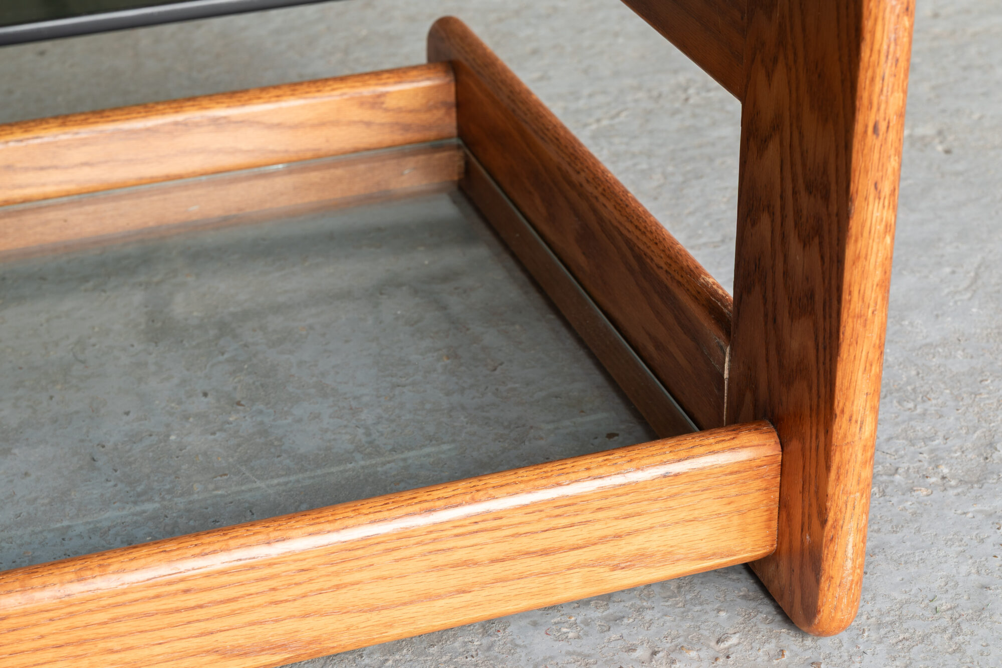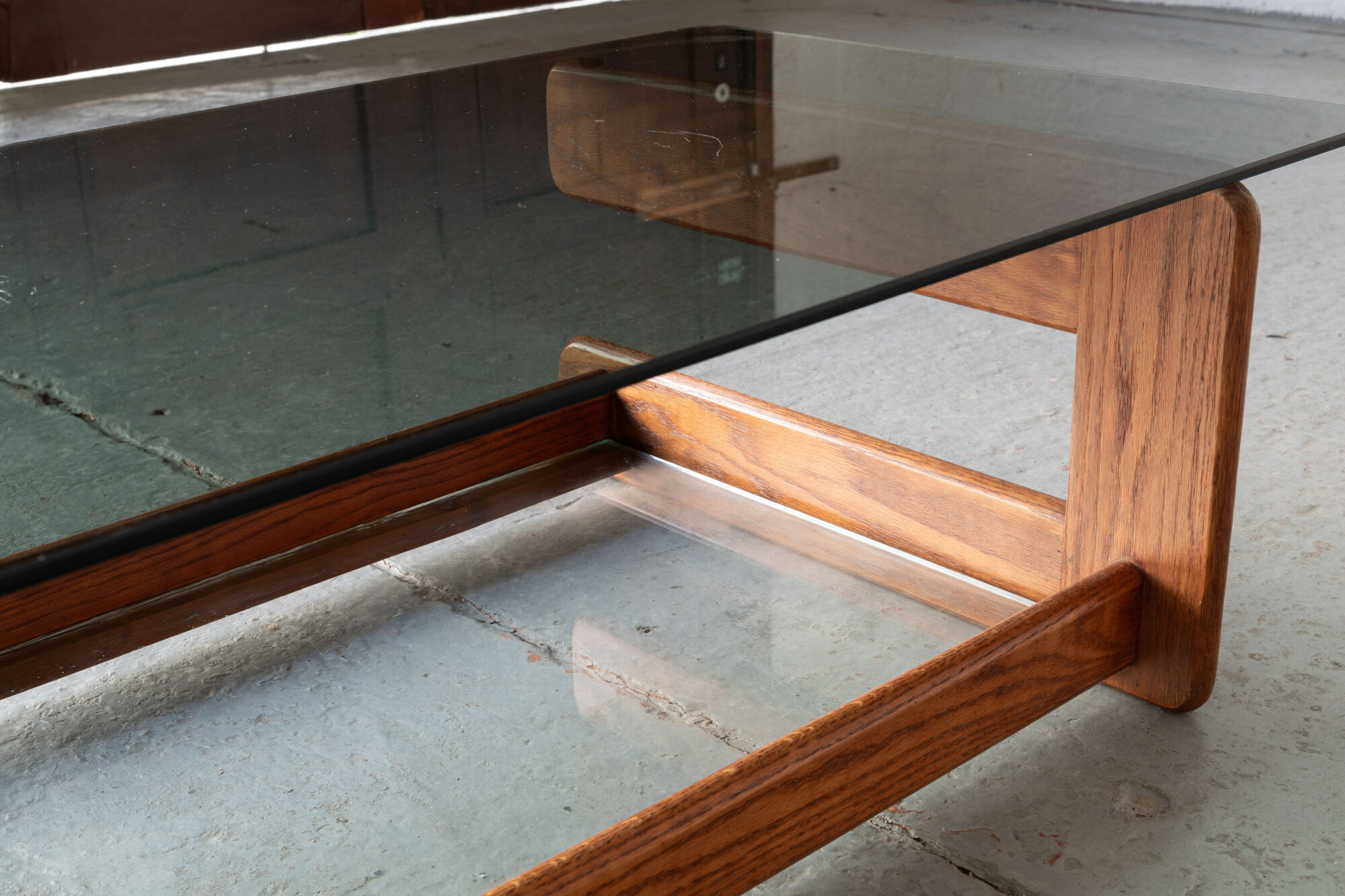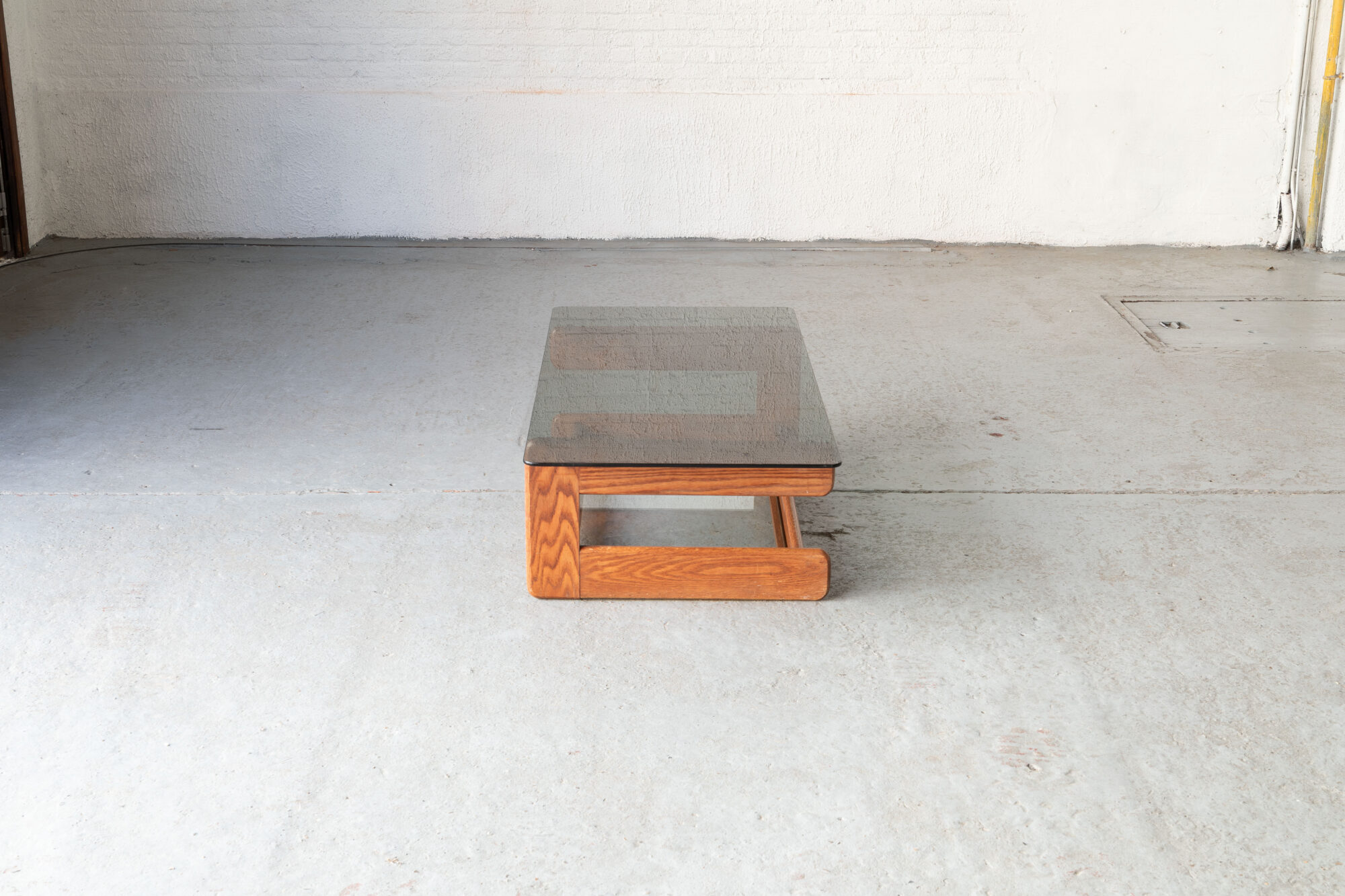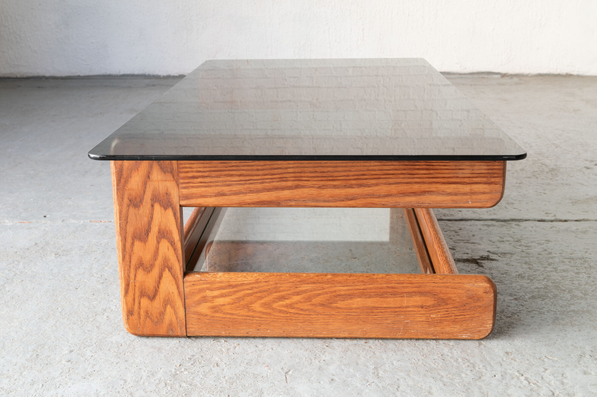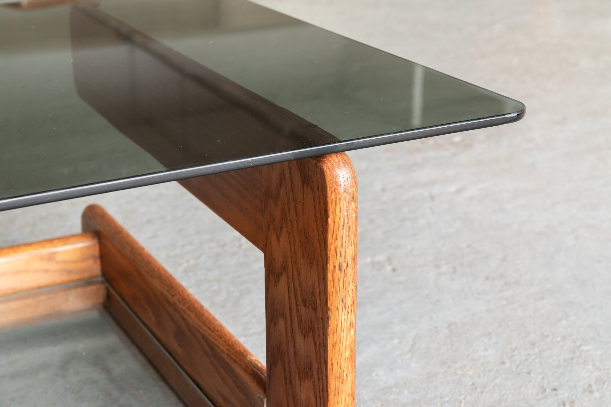Nicely constructed coffee table that was designed and produced in Germany during the 1970’s. The sculptural pinewood frame carries a smoked glass top and a clear glass plate for newspapers or magazines underneath. Some using marks on the wood and scratches on the smoked glass, as shown in the pictures. Overall in decent condition.