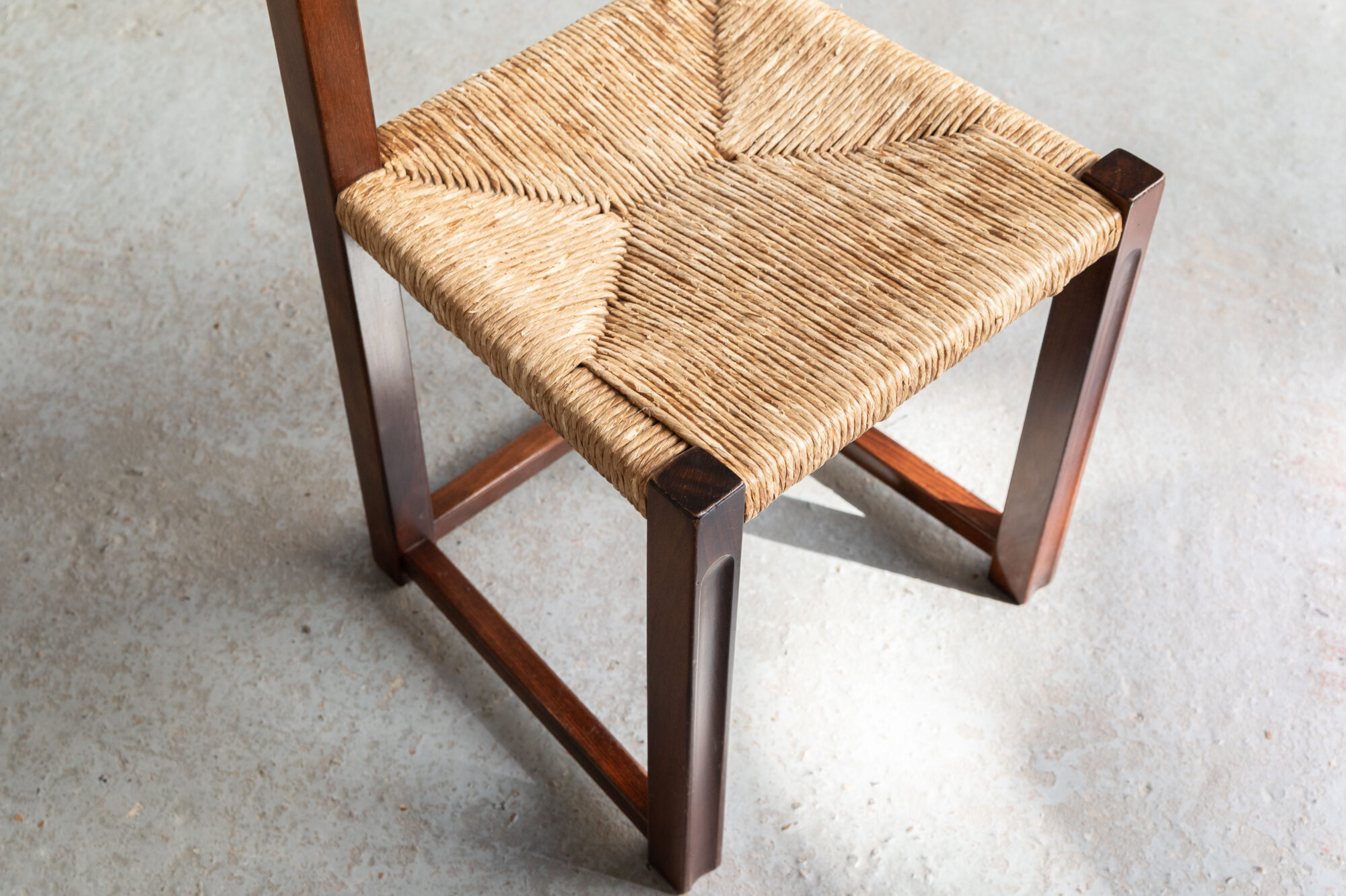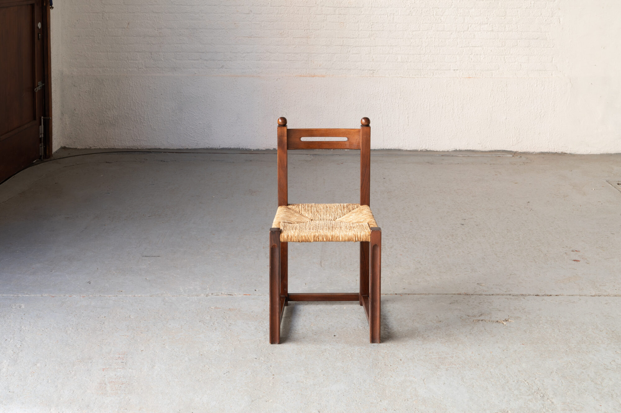 Rare set of 12 brutalist dining chairs designed and produced in France during the 1970’s. The straight frames are balanced by a quirky ball end on top of the backrest. The rush seatings have using marks, but they are not loose anywhere. The stained solid wooden frames have all been checked on stability. Overall in good condition.