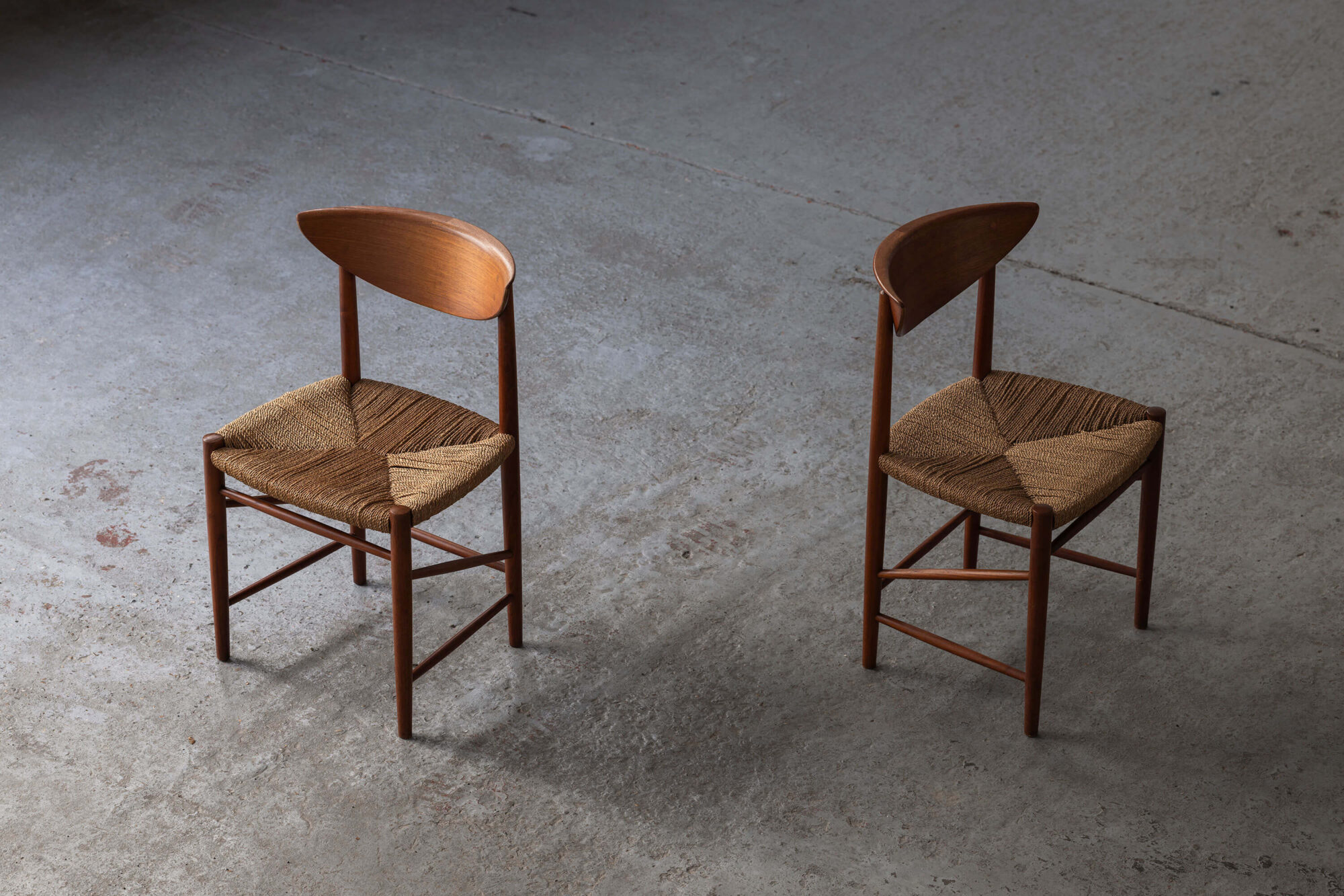 Set of 2 side chairs ‘model 316’, designed by Peter Hvidt and Orla Molgaard Nielsen for Søborg Møbelfabrik in Denmark in the 1950’s. The solid teak wooden frame and original cord seatings have a very nice patina. One of the chairs had a repair on the backrest, as shown in the pictures, but both are in very good condition. Can be sold separately, the one with repaired backrest for 425 euro, the other at 475 euro.