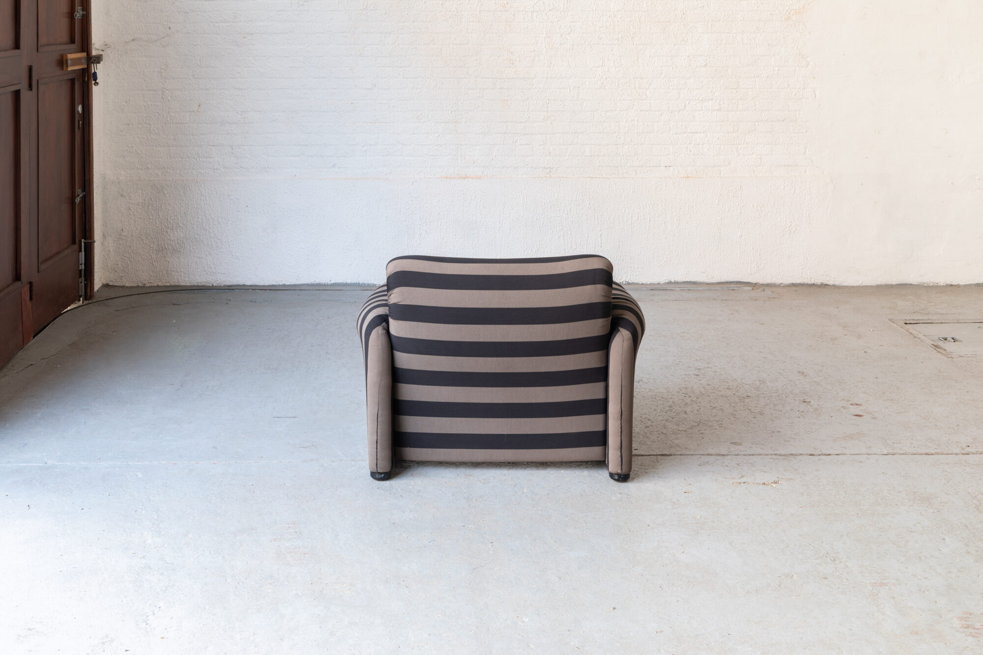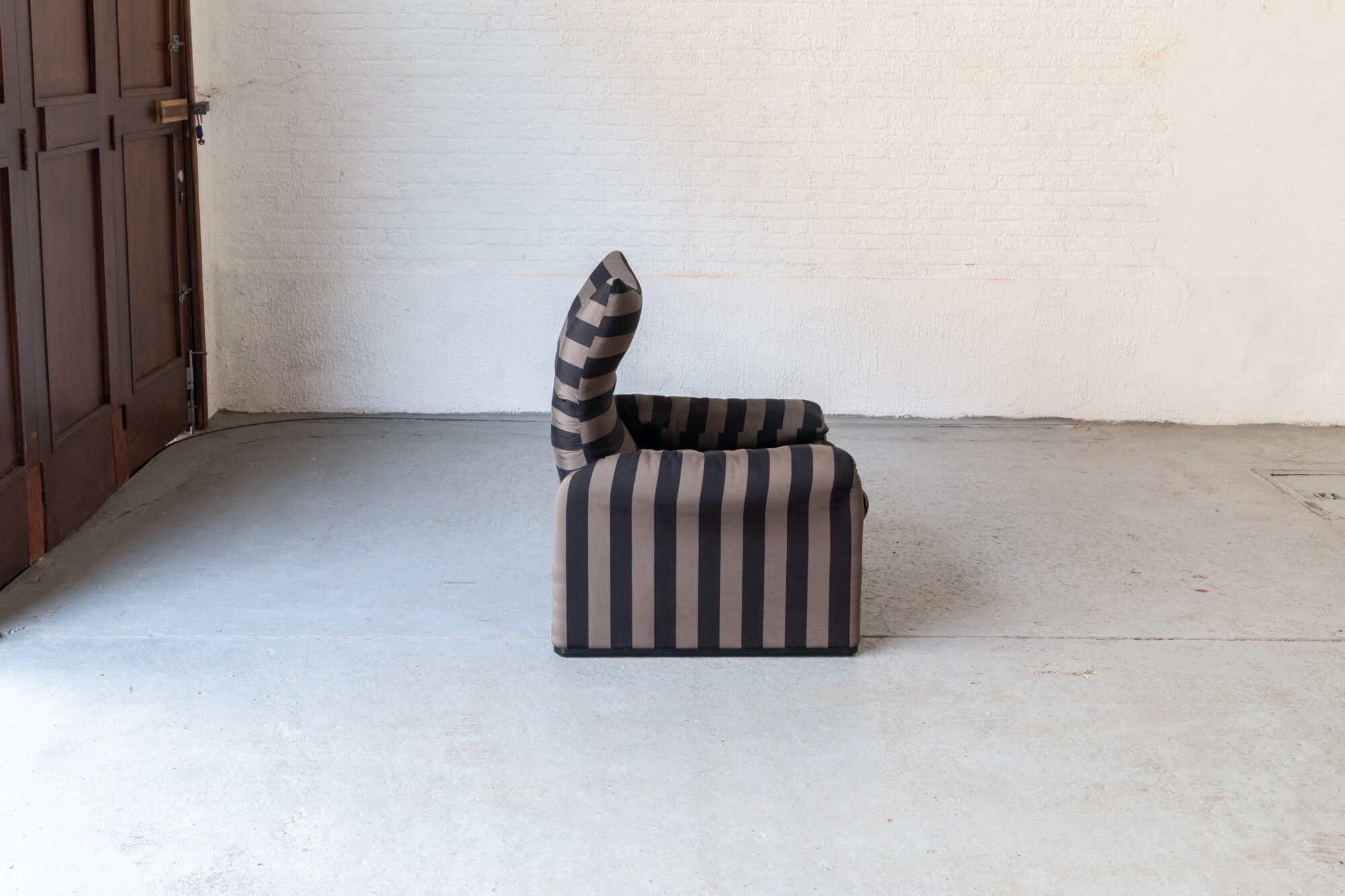 This set of 2 Maralunga easy chairs was designed by Vico Magistretti in 1973 and produced by Cassina in Italy. Magistretti made both a functional and stylish design with the Maralunga series. Thanks to an ingenious bycicle chain system, the headrest can be put straight up or folded down, making it a very comfortable chair for reading, sitting and lounging. Magistrettic claimed inspiration for the foldable backrest came from a pack of cigarettes that folds open the same way. The structure is steel, the bases are in black plastic and they are padded in polyurethane foam, comfortable and durable. This material is finished off with dacron fiberfill and polyester wadding to ensure the seats adapt to a person’s body. The cover of this set was re-upholstered in wide gray and black stripes. A few small spots on the fabric, further in very good condition. The Maralunga is still a design classic to date, no wonder Magistretti was honoured with the Compaso d’Oro for this piece.