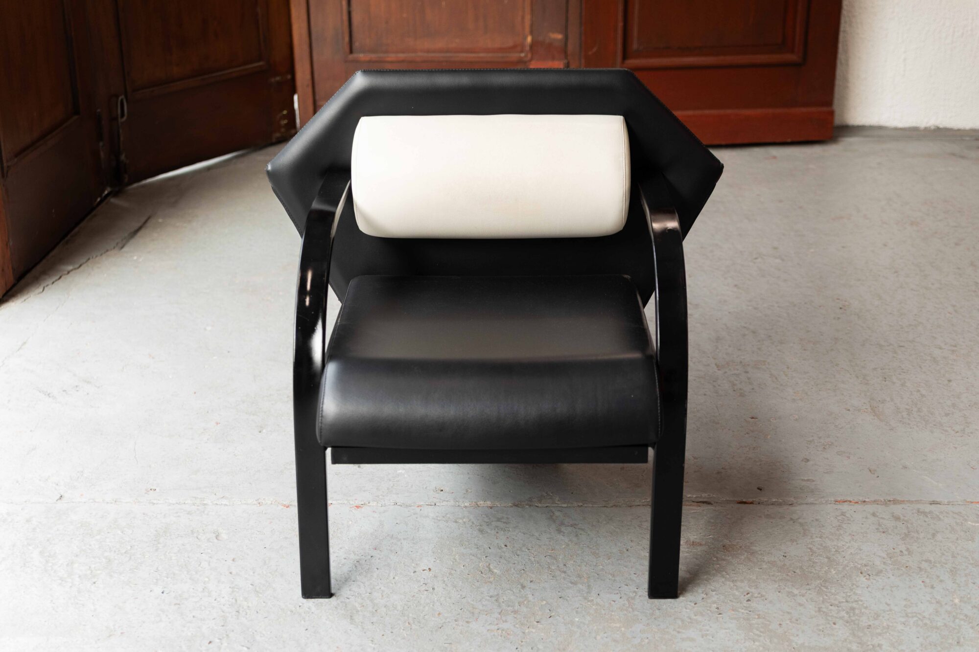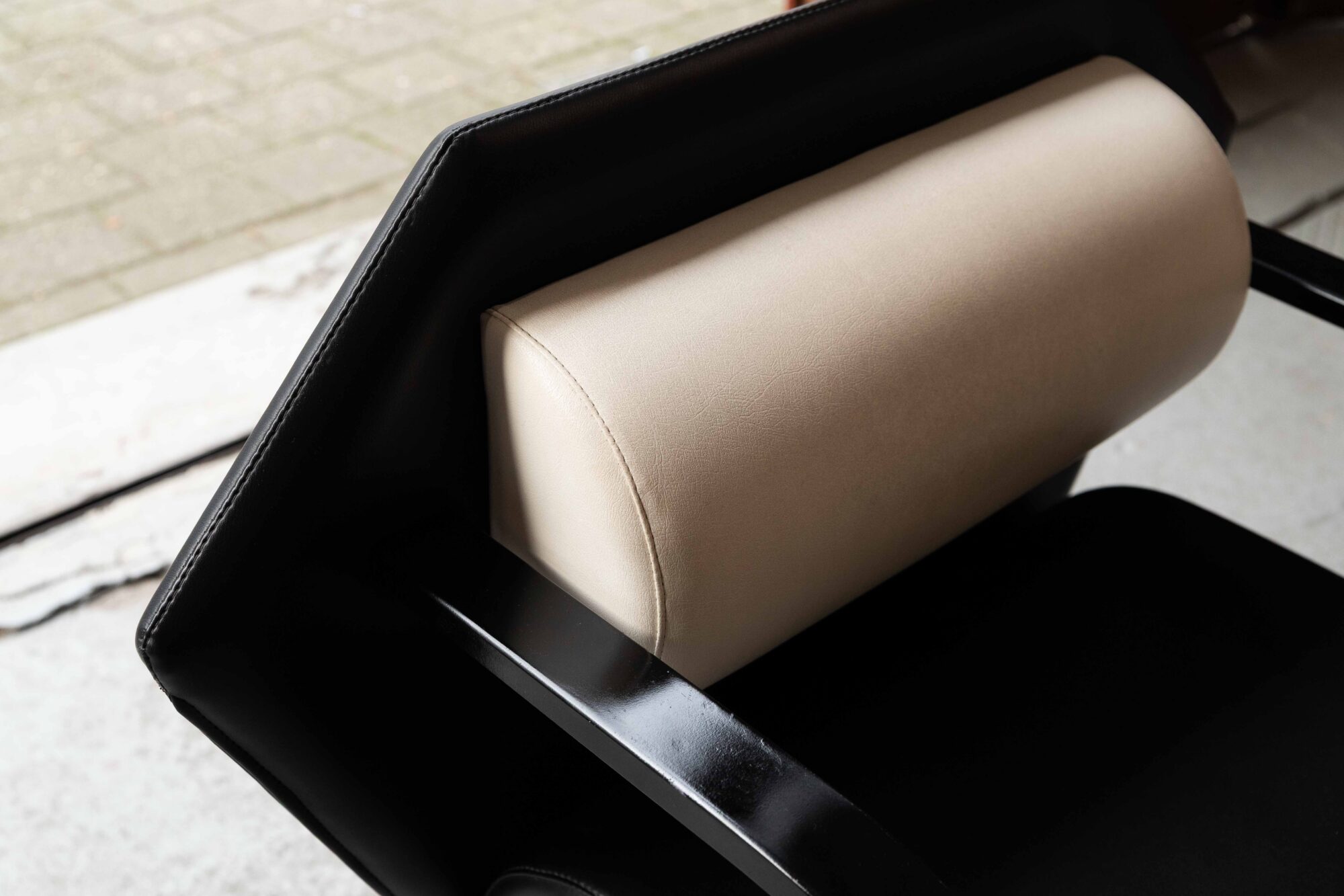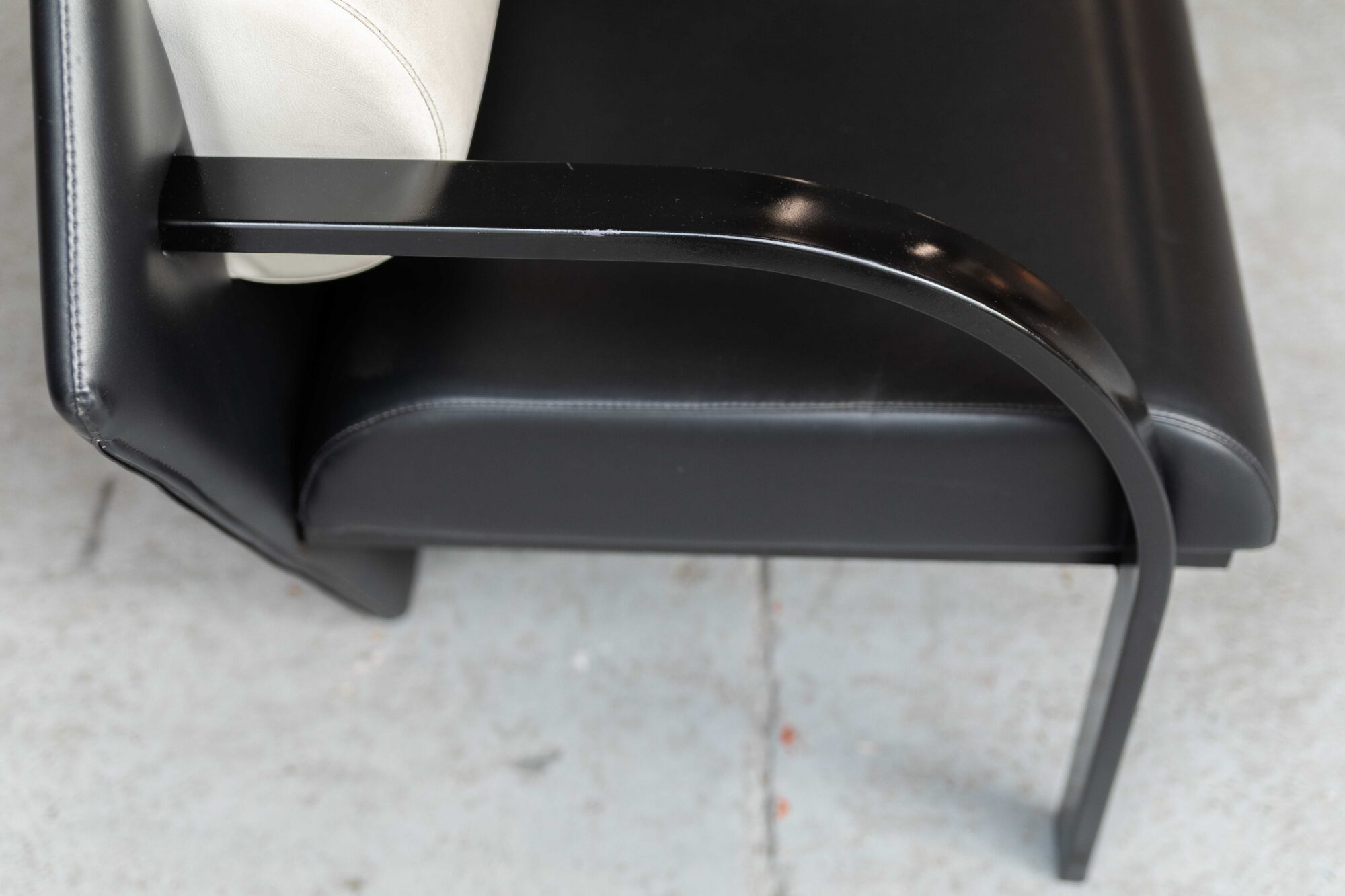 Postmodern side chairs, designed and produced in Italy in the 1980’s. The designer and producer are unknown to us but they surely are a rare find. The metal and skai leather chairs have an architectural appeal with their unusual diamond shaped backs and comfortable rounded cushions. The base and armrests were lacquered again in hi-gloss black lacquer. In very good condtion.