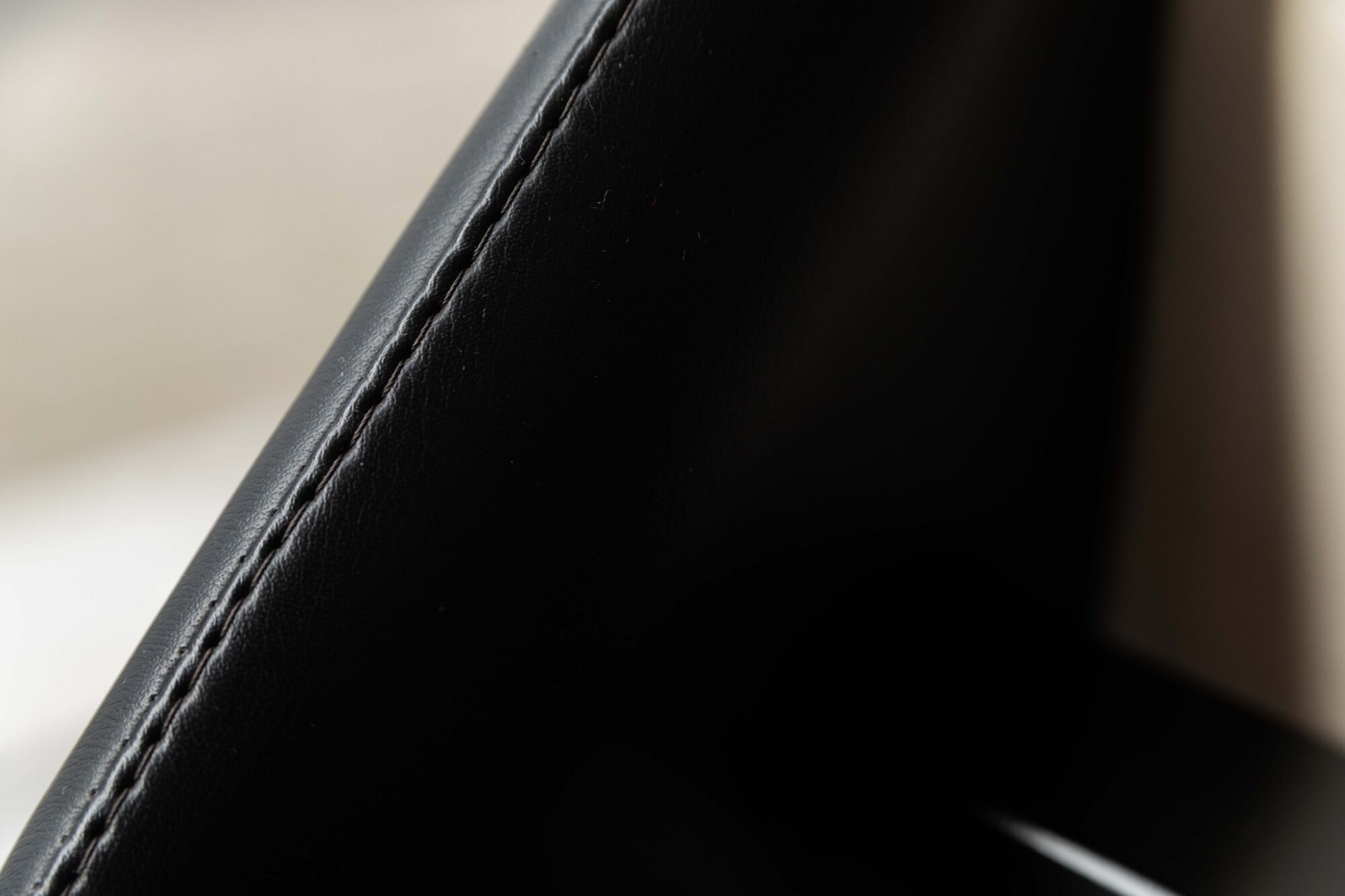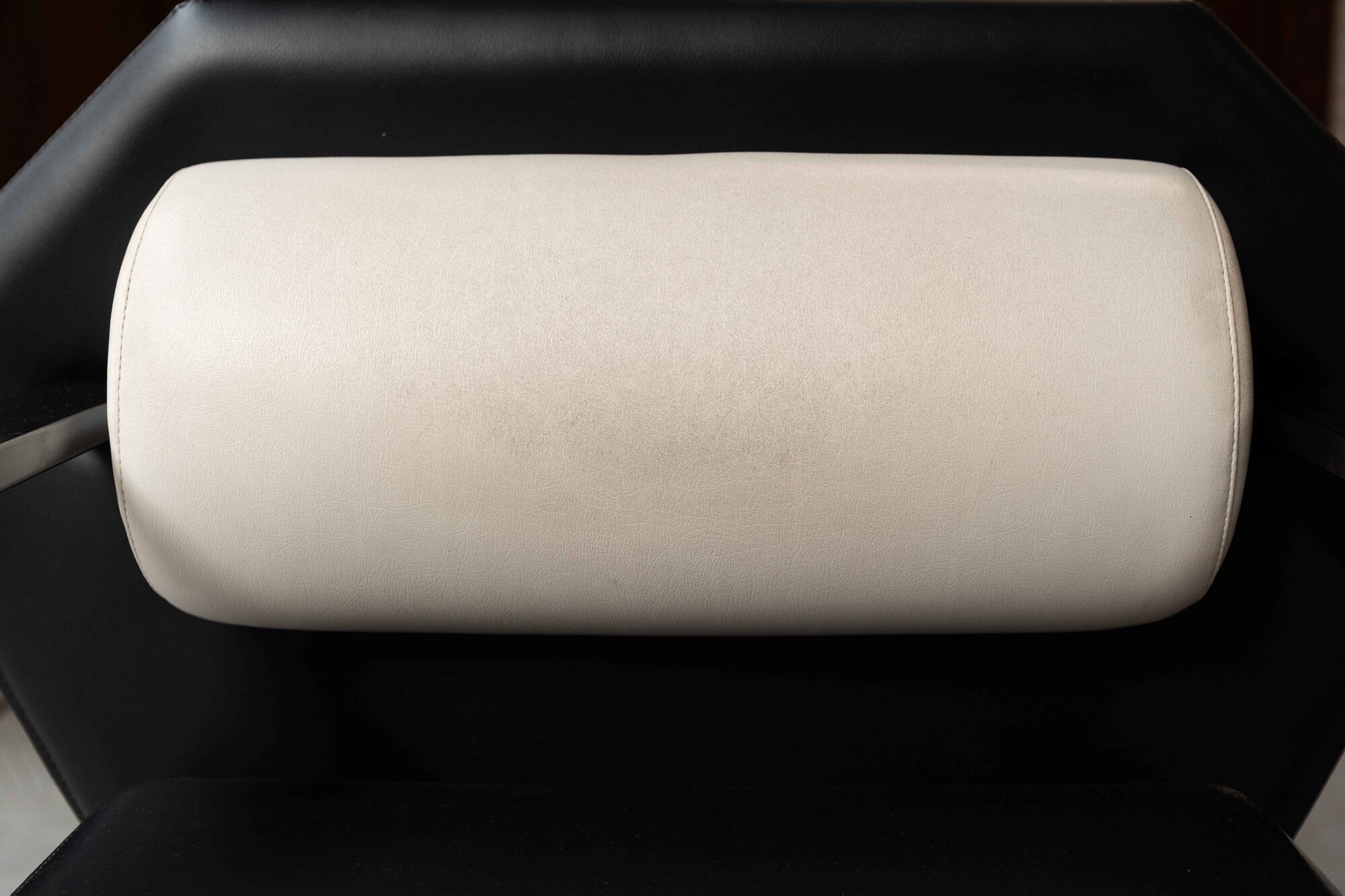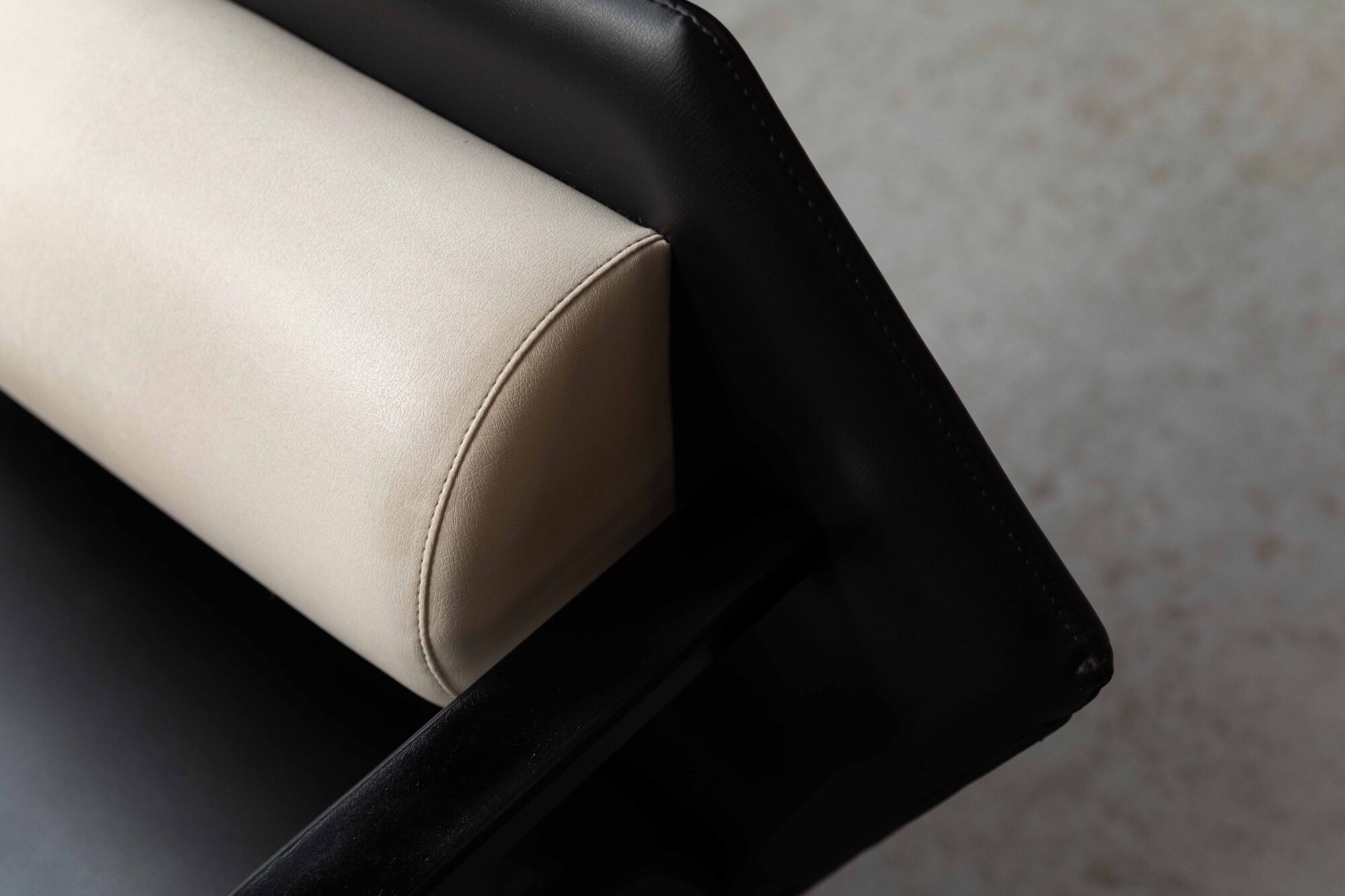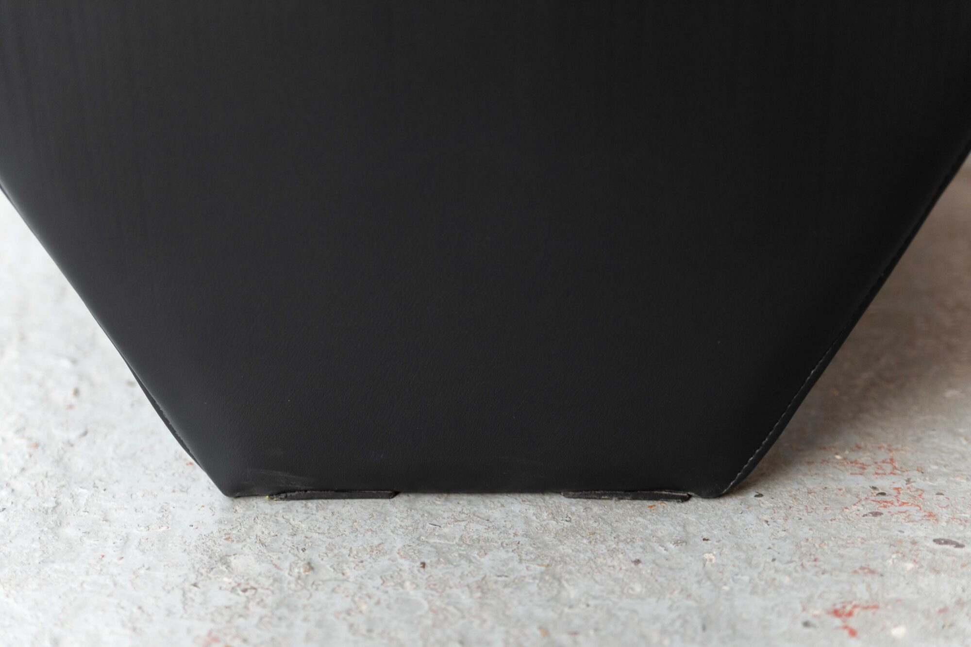Postmodern side chairs, designed and produced in Italy in the 1980’s. The designer and producer are unknown to us but they surely are a rare find. The metal and skai leather chairs have an architectural appeal with their unusual diamond shaped backs and comfortable rounded cushions. The base and armrests were lacquered again in hi-gloss black lacquer. In very good condtion.