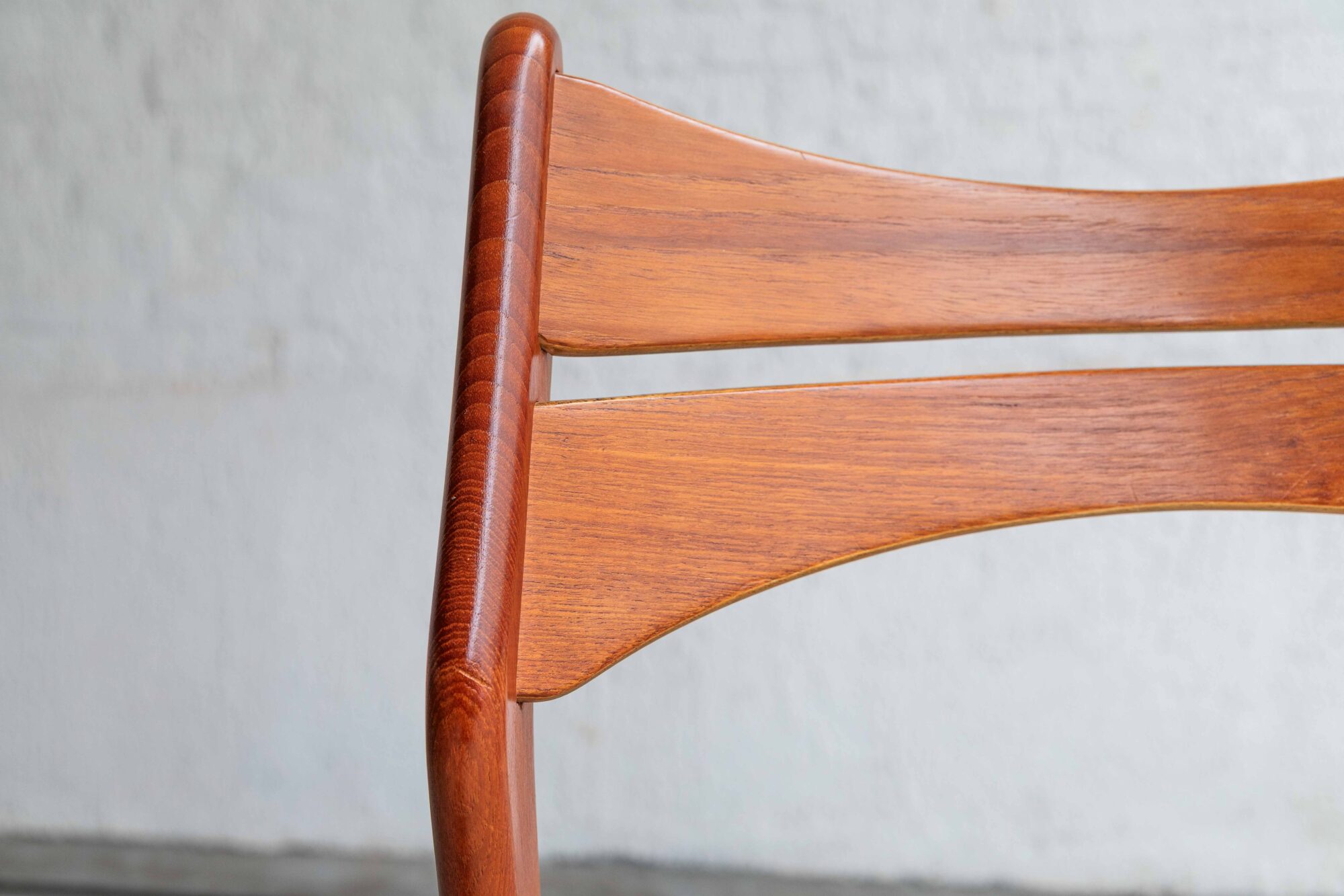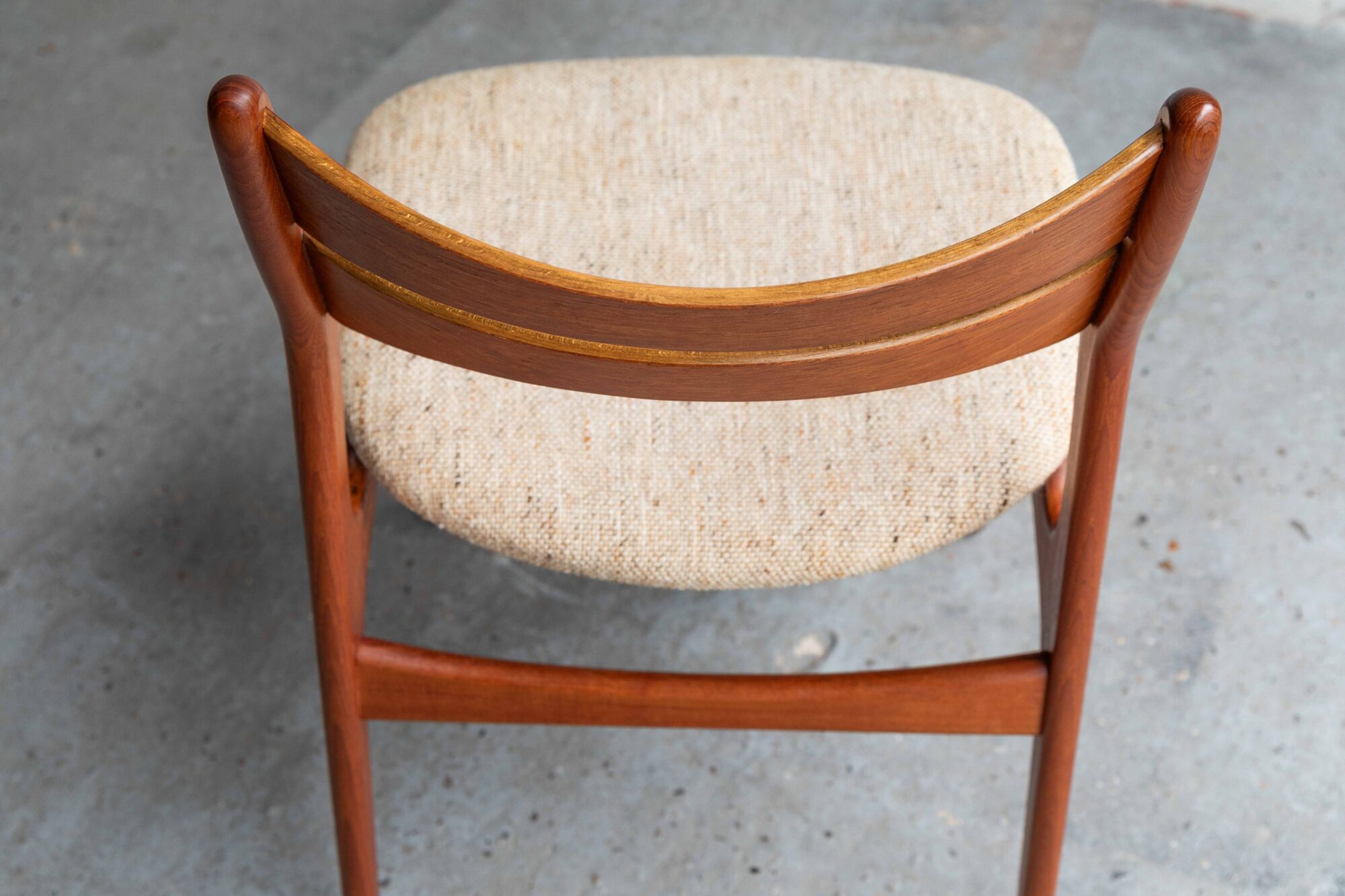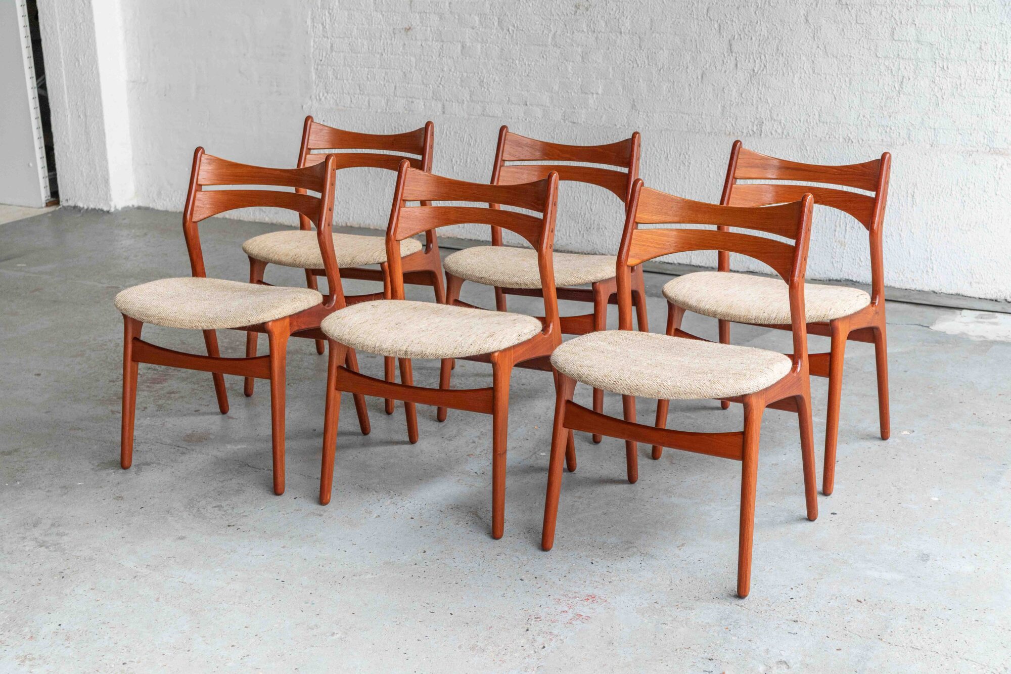 Set of 6 Danish teak dining chairs ‘model 310’ designed by Erik Buck and produced by Christian Christensens Møbelfabrik in Denmark in the 1960’s. The elegant design, and condition of the solid teak frames make this a very nice set. The woolen upholstery is original and therefore has a few darker stains. For the rest the whole set is in beautiful condition, as shown in the pictures.