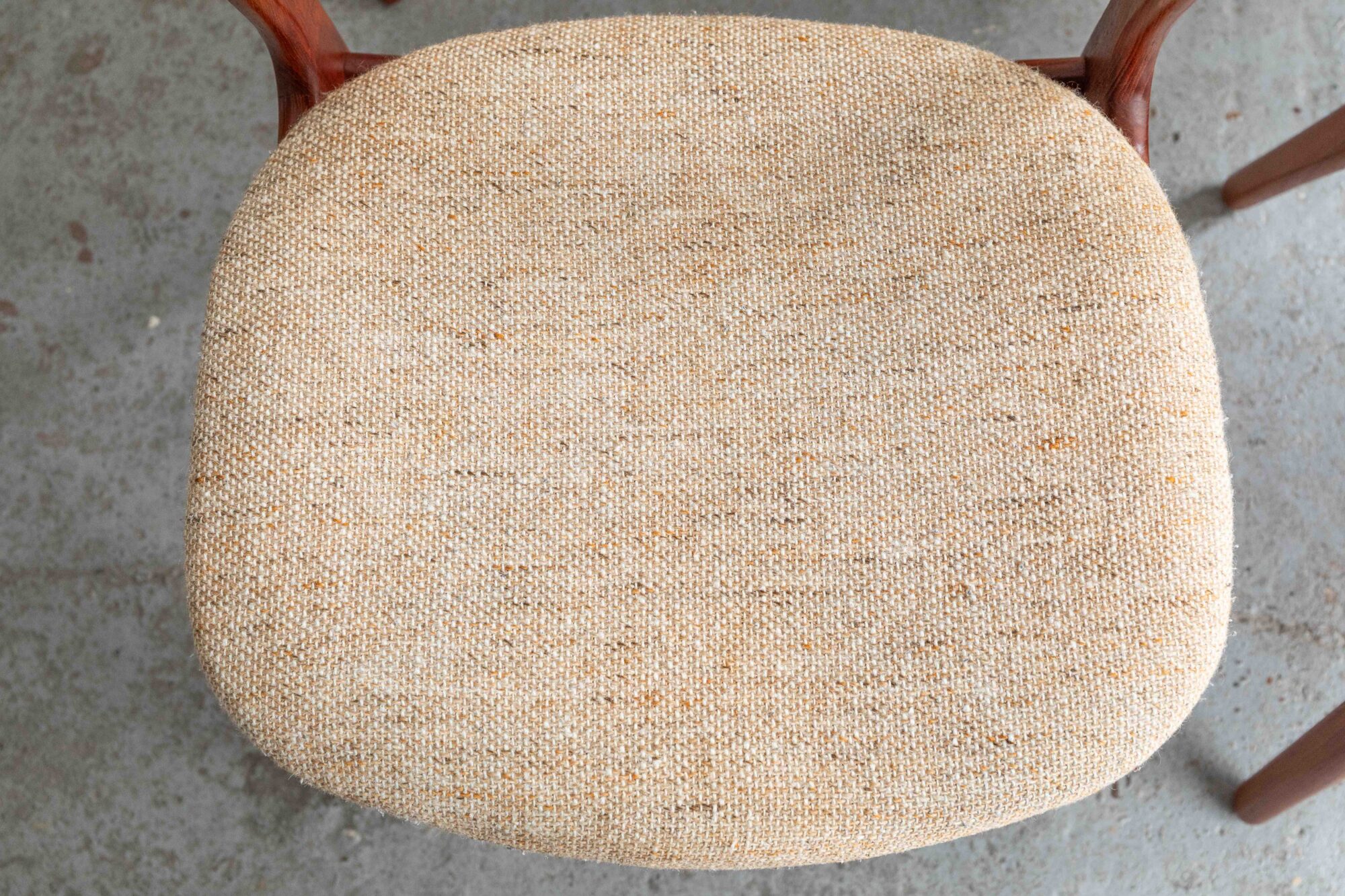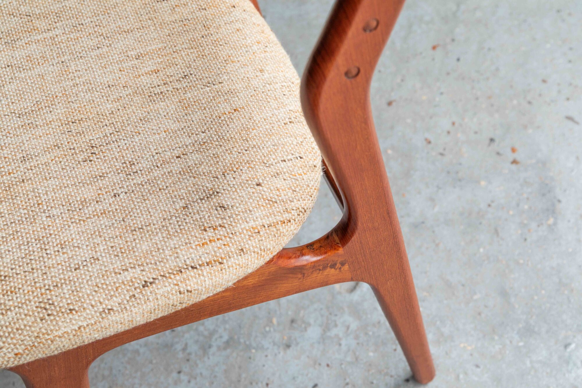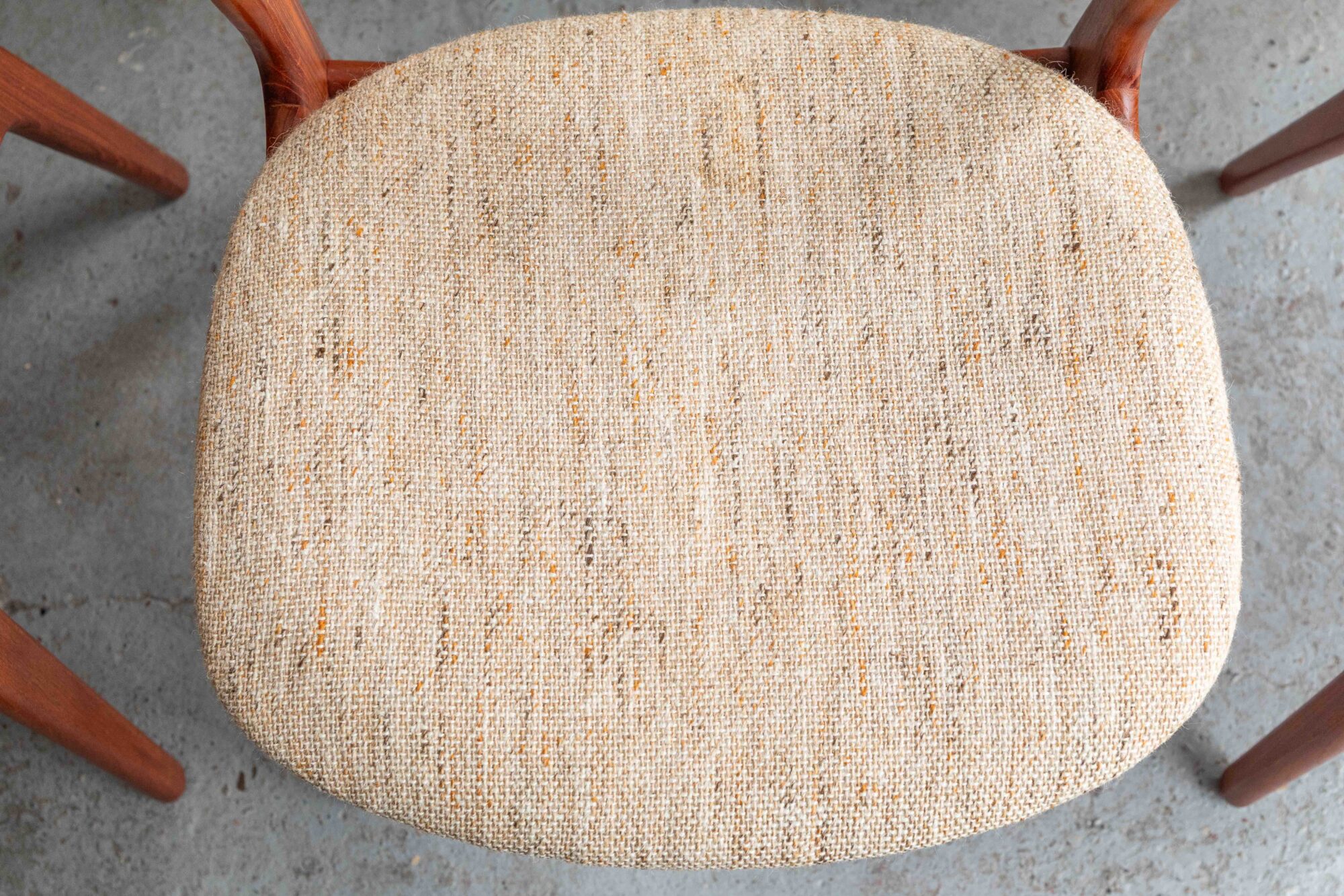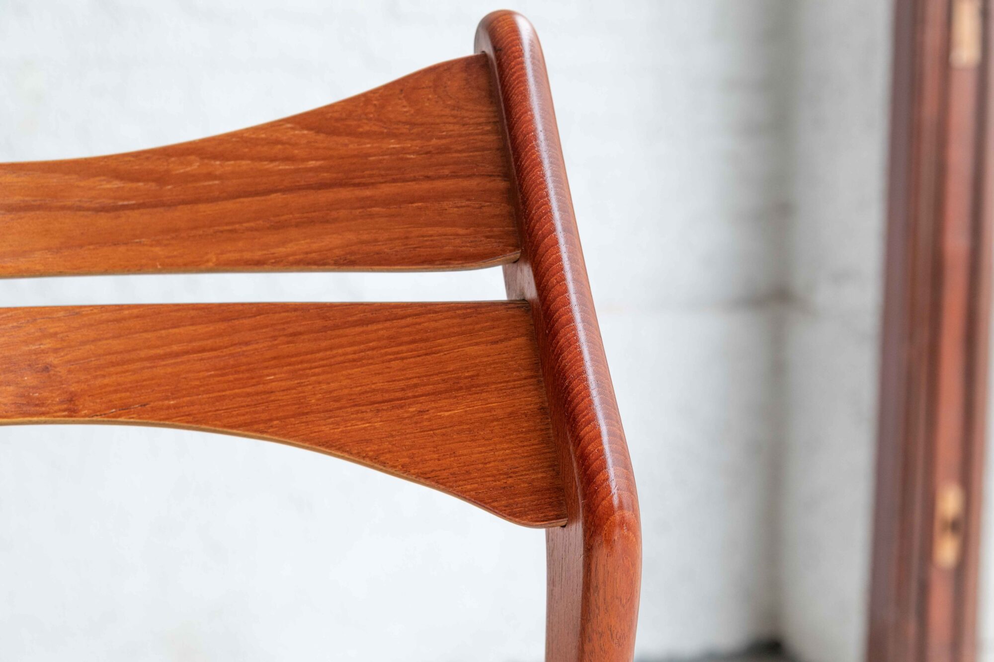 Set of 6 Danish teak dining chairs ‘model 310’ designed by Erik Buck and produced by Christian Christensens Møbelfabrik in Denmark in the 1960’s. The elegant design, and condition of the solid teak frames make this a very nice set. The woolen upholstery is original and therefore has a few darker stains. For the rest the whole set is in beautiful condition, as shown in the pictures.