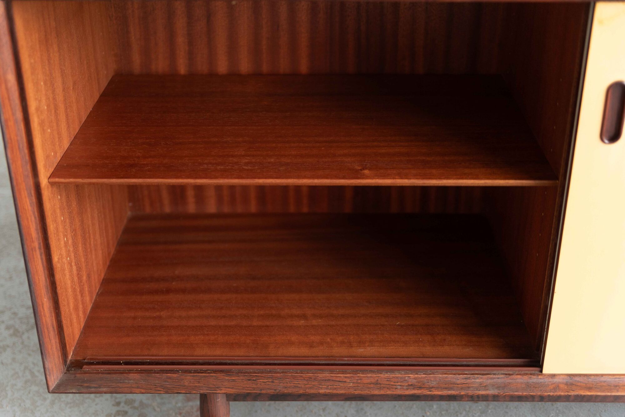 Rare sideboard designed by Arne Vodder and produced by Sibast Møbler in the 1950’s in Denmark. This credenza counts 2 doors and 6 drawers and has a playful, colourful appearance. The white and yellow sliding doors for instance can be taken out and flipped over to the rosewood side for a more sober look. The height of the slightly slanted shelves inside is adjustable and the bookmatched veneer on top shows a beautiful grain. No wonder this OS 29 is considered one of Vodder’s most beautiful sideboards. A small crack in the top left corner of the yellow door has been restored. There’s also a small chip of wood missing from this door near the pin that holds the door in place, but it’s not too remarkable. The system to take the door out and put it back in is undamaged. One darker area on the top . Further the whole sideboard is in an excellent condition with hardly any using marks. The drawers run very smooth and are marked with a maker’s label and Danish quality furniture label inside. This gem, especially this edition with the colourful façade, is considered a true collector’s item.