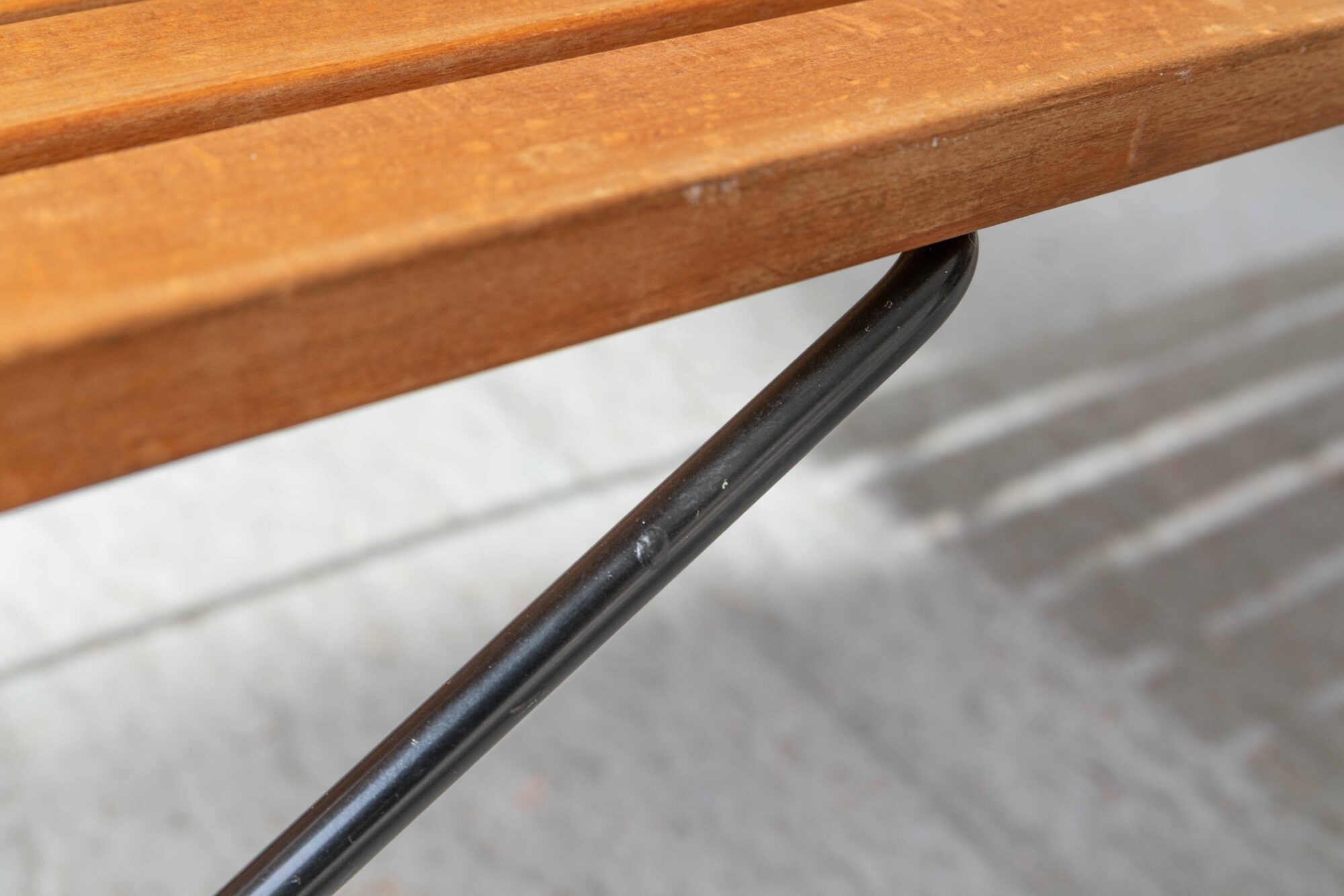 This modernist, solid beech slatted bench is a true design classic designed by Harry Bertoia for Knoll International USA in the 1950’s. The black steel legs are supporting 8 oiled solid beech wood slats. Can be used both as a bench or a coffee table. Slight scratches and age-appropriate signs of wear on the wood surface, the metal frame shows minimal paint abrasions. Overall in very good condition, stable and fully functional.