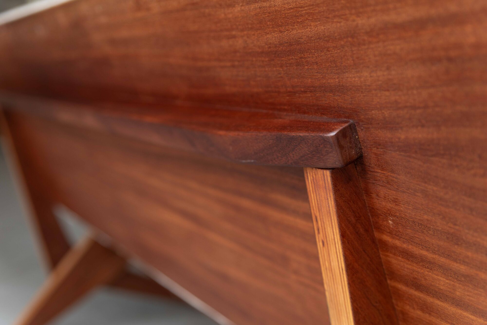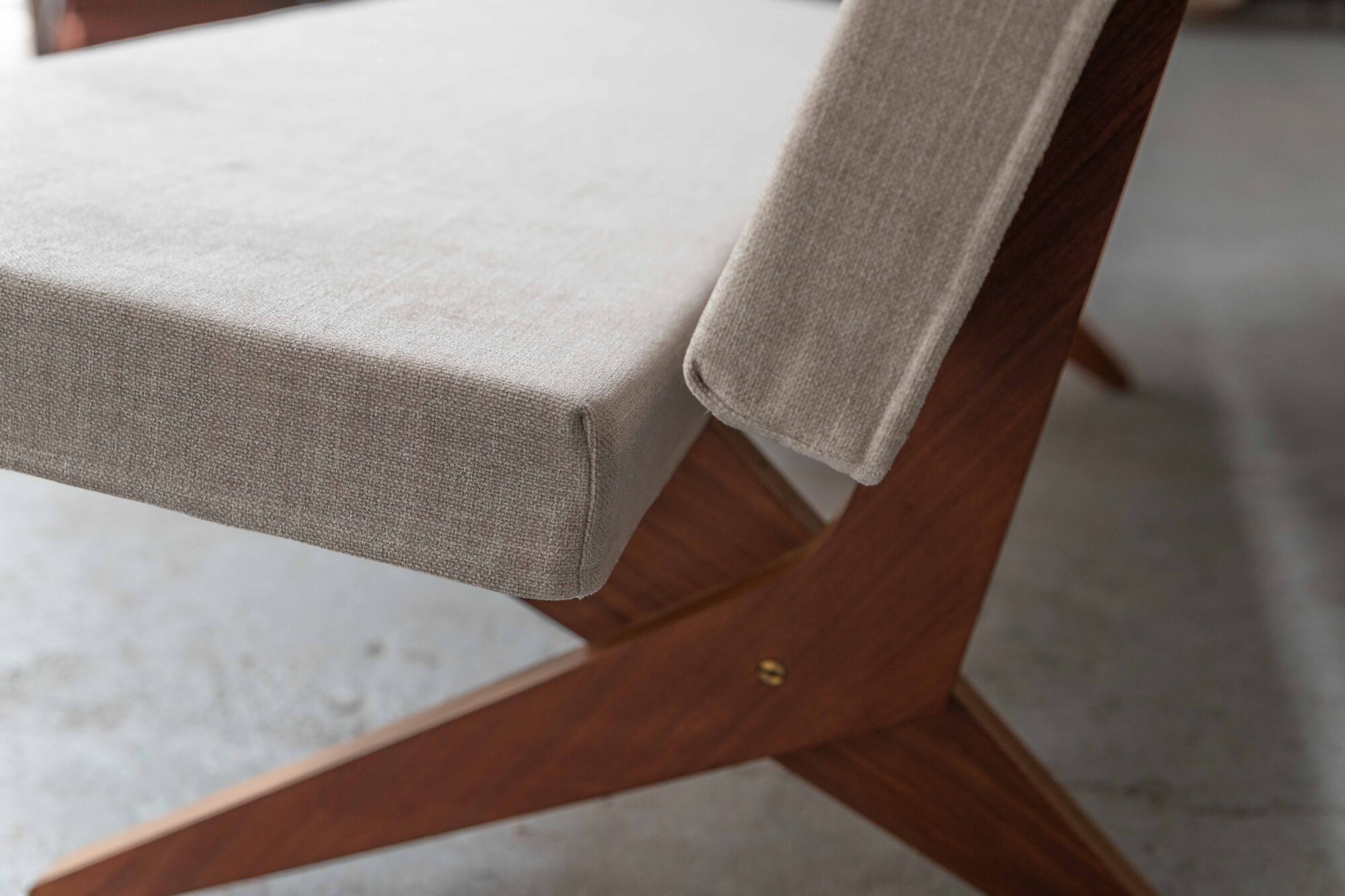 This very rare ‘Scissor settee’ was designed by Jan Van Grunsven in 1955 and produced by UMS Pastoe in the Netherlands. The MB18 was made in Utrecht as part of the Combex series when Van Grunsven was working for architect Gerrit Rietveld. The frame is made of laminated layers of plywood. The wood is in good condition. The chair was very recently re-upholstered in Melvin by Buvetex, a mousegrey, very soft yet very wear-resistant mélange of polyester and cotton. We have also the burgundy Scissor chair FB18 by the same designer available as well.