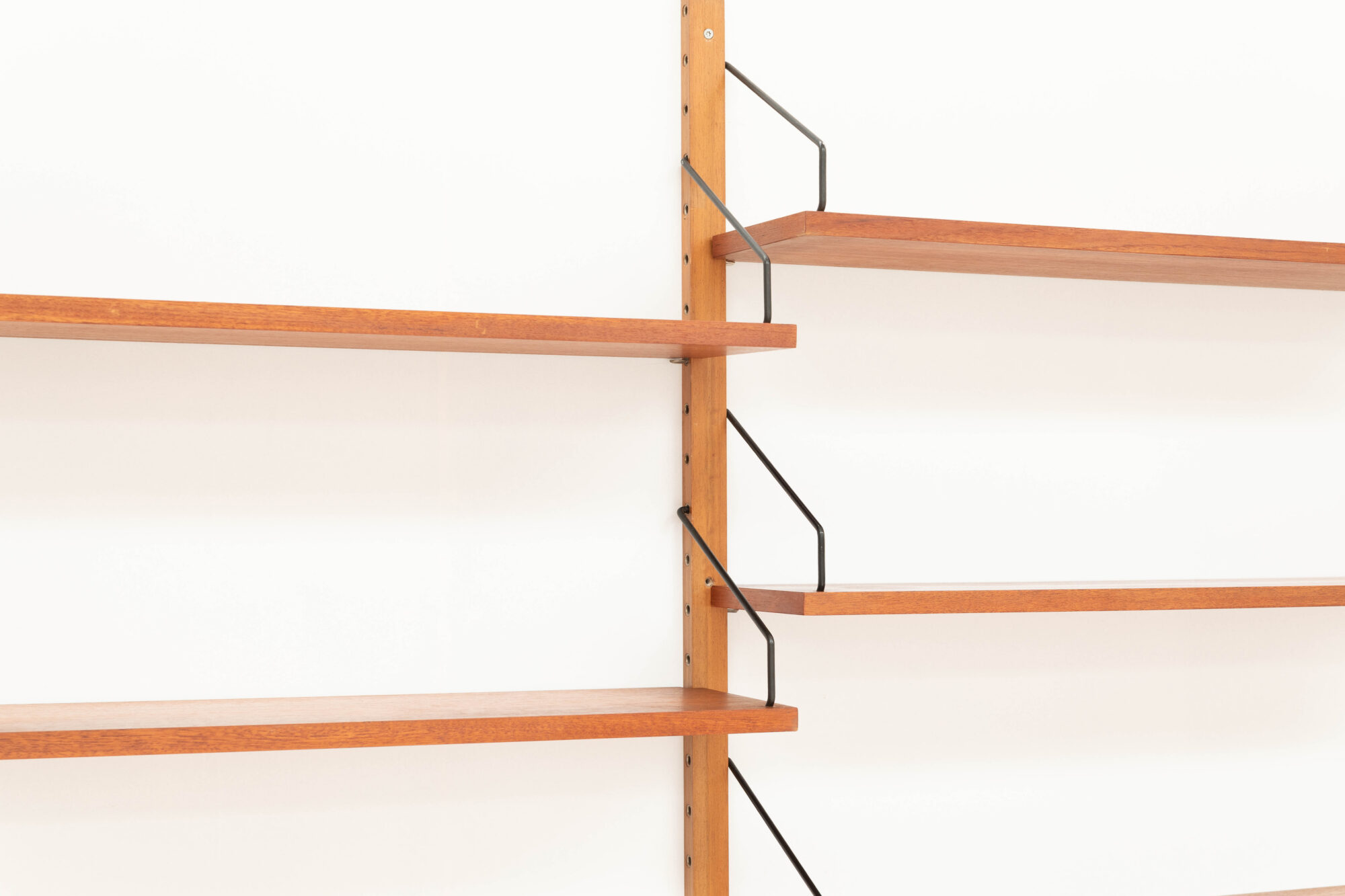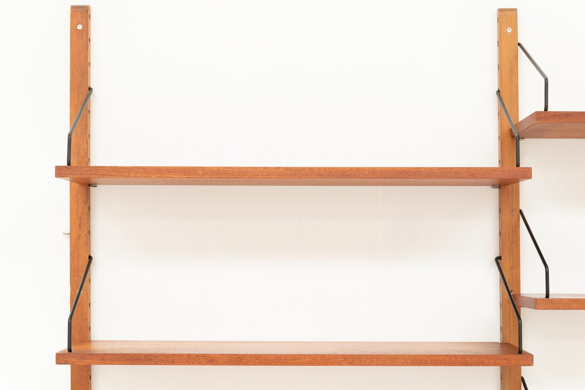 2-Bay teak wall unit, designed by Poul Cadovius and produced by Cadovius in Denmark, during the 1960’s. This Cado series system consists of three wooden floating supports, a, a Cado series desk cabinet with a fold down door and 2 neat little drawers. This cabinet has a depth of 37,5 cm (closed) and a height of 42 cm. The set includes also five shelves with a 20 cm depth, a desk shelf of 40 cm, and all the necessary metal hooks in black or brass colour. In very good condition. The pictured chair, artworks, books and deco are not included in the price.
