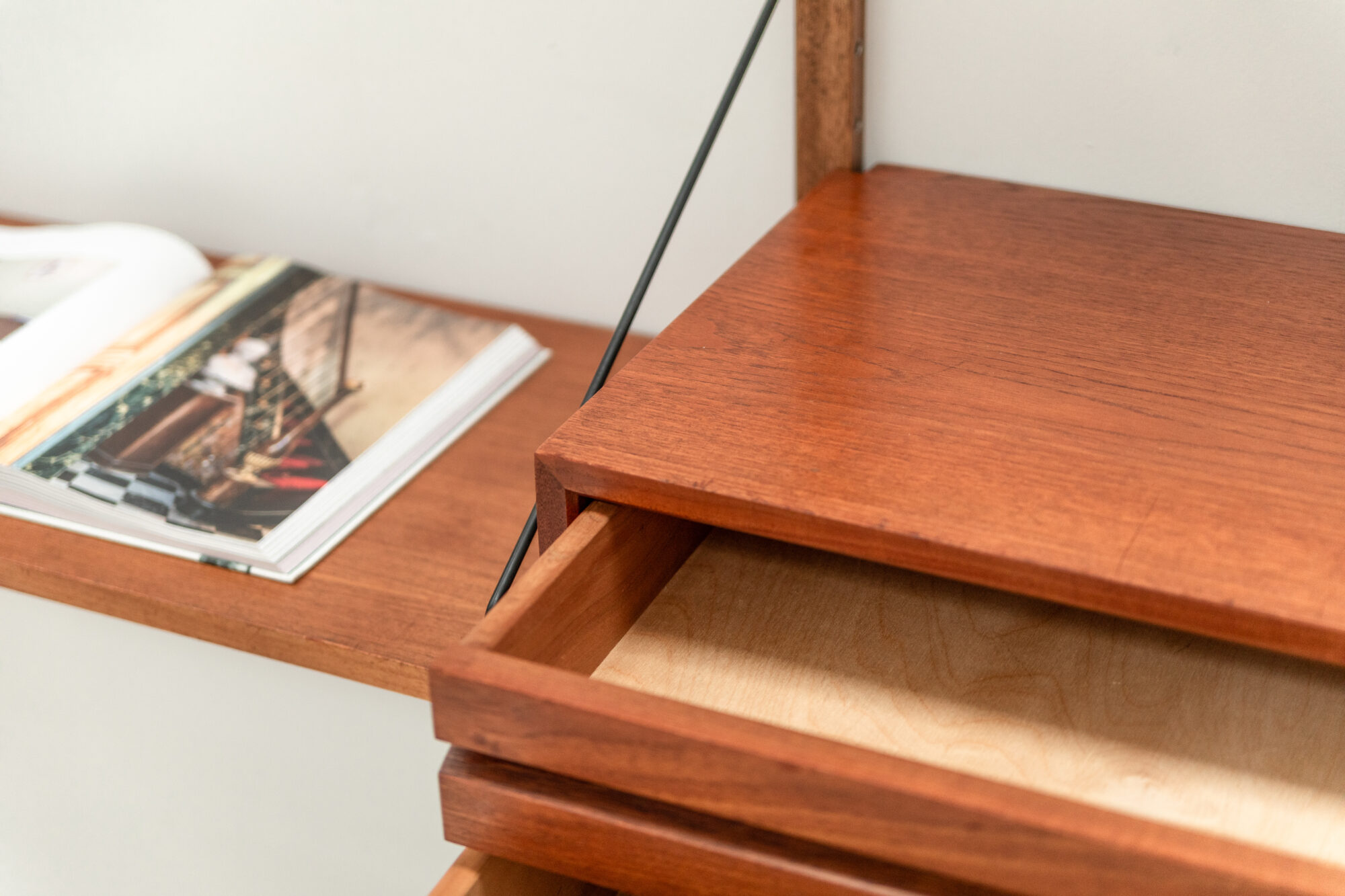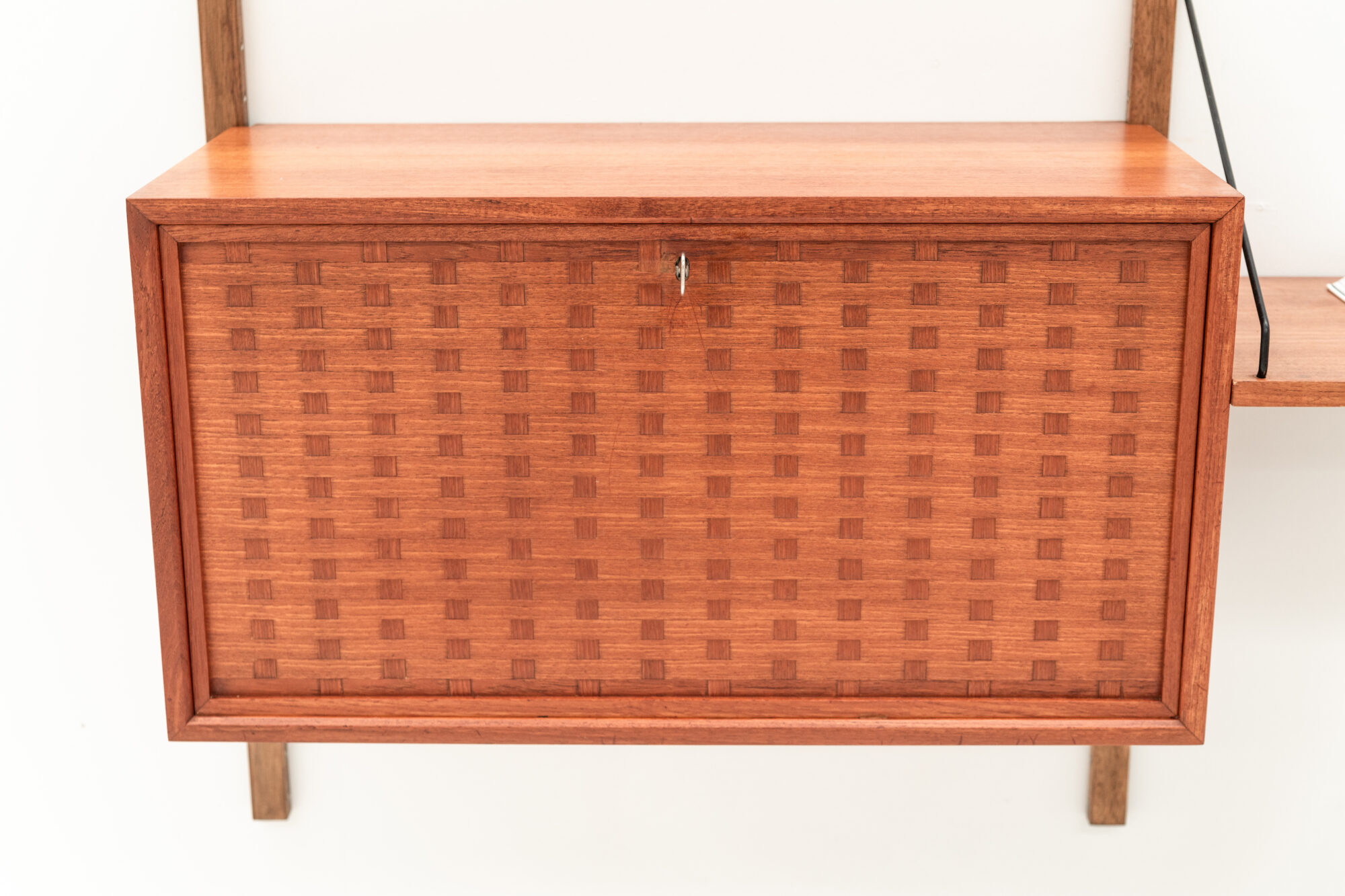 3-Bay teak wall unit, designed by Poul Cadovius and produced by Cadovius in Denmark, during the 1960’s. The system consists of four original wooden floating supports, two cabinets with a depth of 37,5 cm and height of 42 cm, a desk shelf with a depth of 37,5 cm and six shelves of 20 cm. The left cabinet has a fold down door with a key and braided front and a bar lay-out with metal bottle holder inside. The one on the right has three drawers for extra storage space. All black metal brackets and metal shelf and cabinet supports are included in the price. The Cadovius wall units are modular so you can organise the shelves and cabinets at will or expand your system later on. All the elements are in very good condition with few using marks, as shown in the pictures.