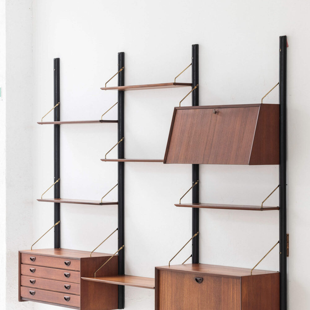 Three bay wall unit, designed by Louis van Teeffelen and produced by Wébé in The Netherlands during the 1960’s. The four wall supports in original black lacquered limba wood are mounted to the wall with 4 screws per rail. The system consists of one drawer cabinet with a key and one secretary cabinet and one cabinet with a handgrip and fold down door. There’s a big shelf with a depth of 40 cm and 5 shelves of 22 cm included. This is a modular wall unit system, so you can arrange all elements as desired. Some patina on the messing brackets, further in very good original condition, as shown in the pictures.