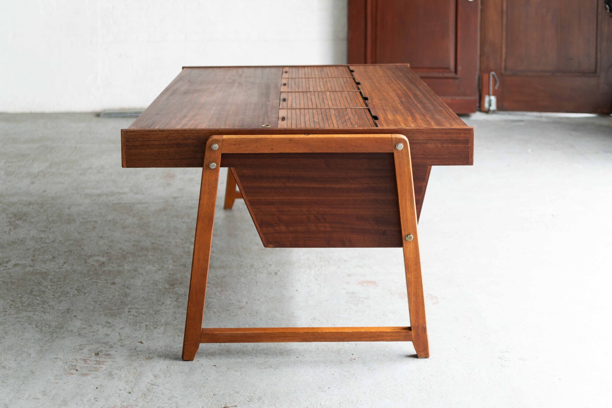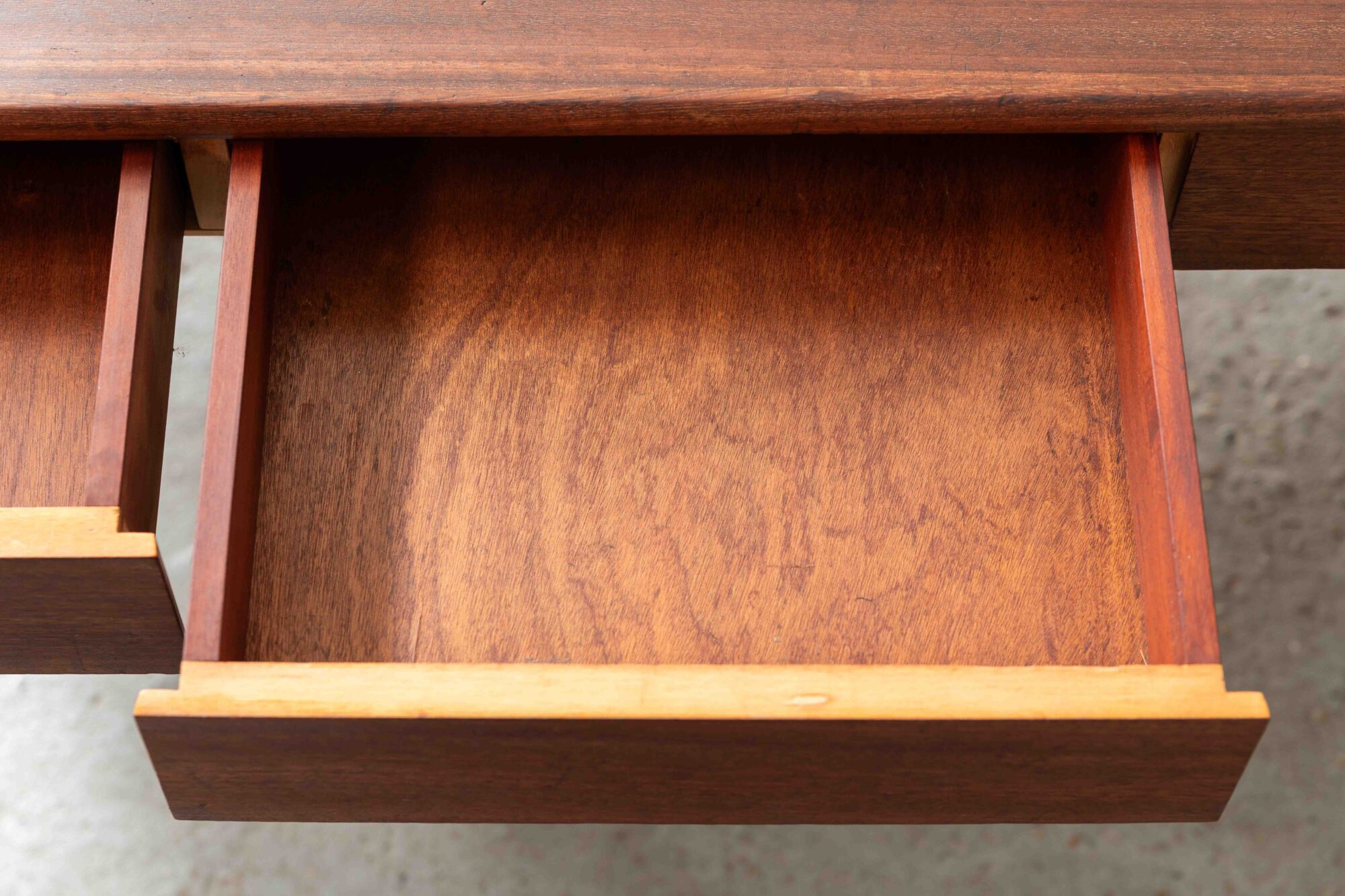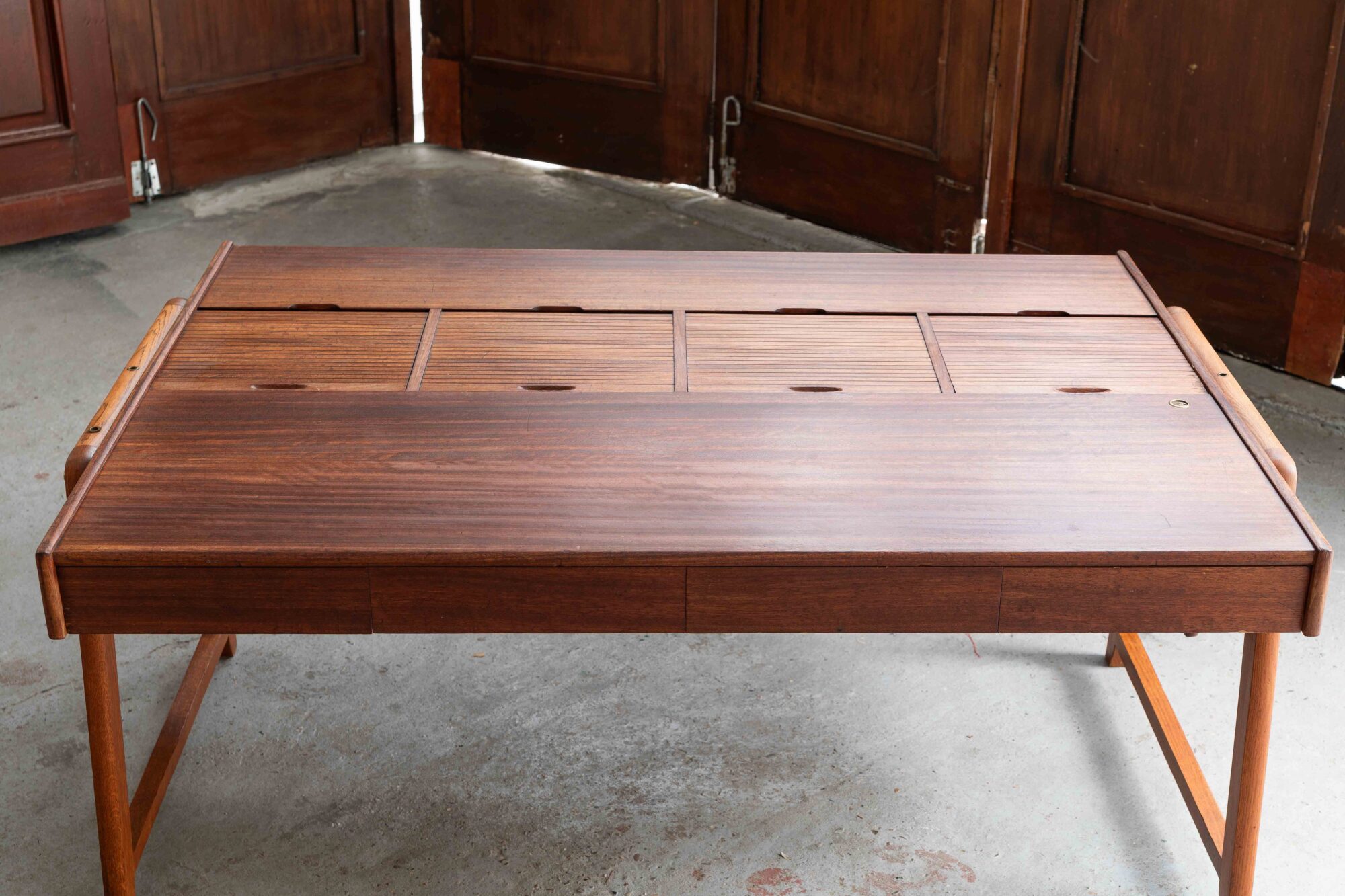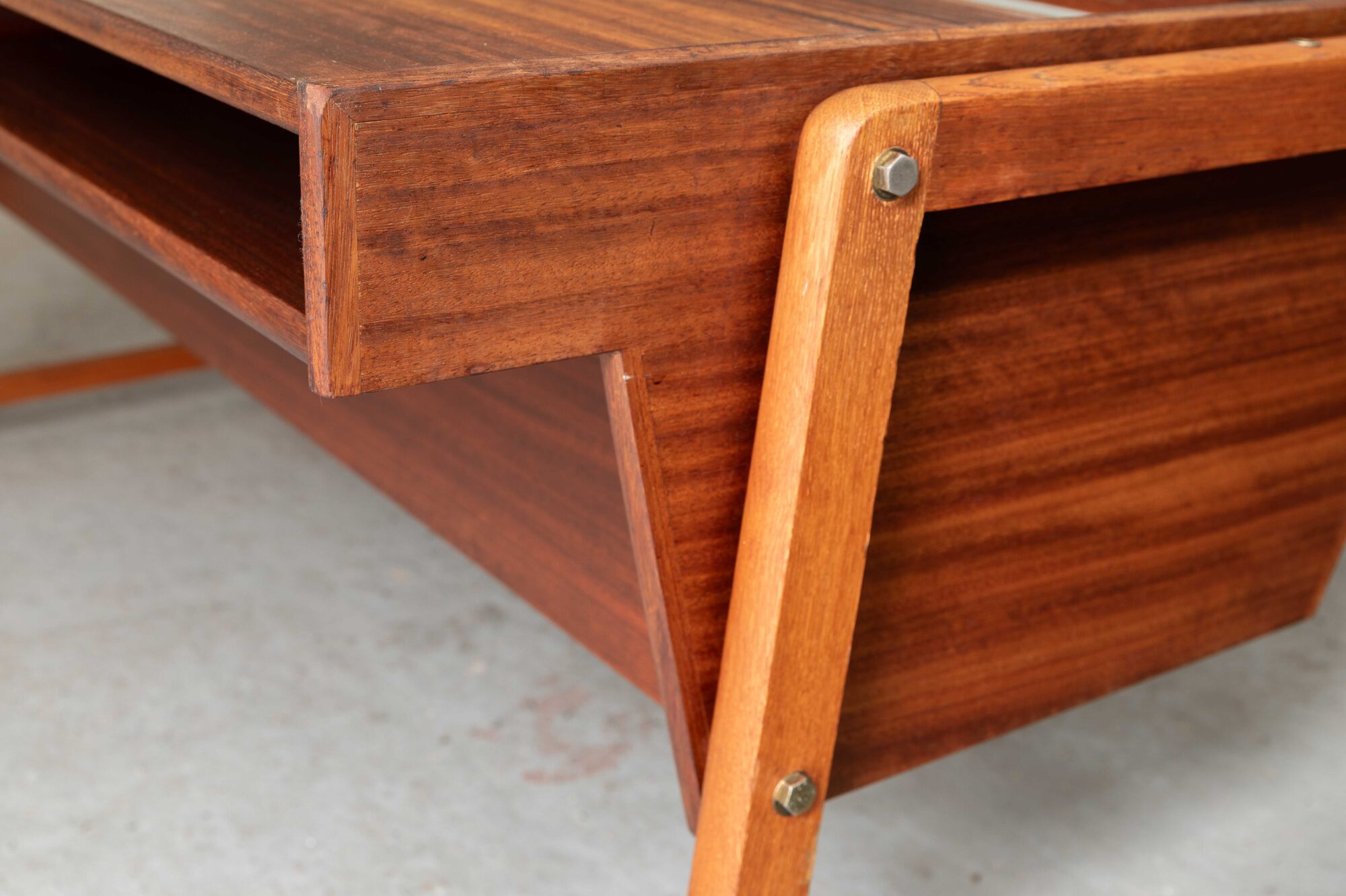 Large double sided architect desk designed by the Norish designer duo Clausen & Maerus, produced by Eden in Rotterdam in the 1960’s. This oak & mahogany desk has 4 drawers and 4 tambour door storage compartiments, that can all be closed with one lock and the two included, original keys. On the other side, there’s open storage compartiments. Behind the tambour doors there’s a few cardboard document classifiers. Some using marks as shown in the pictures, but overall in very good condition.