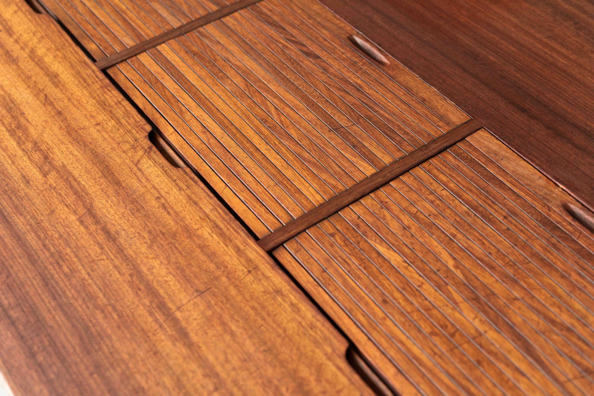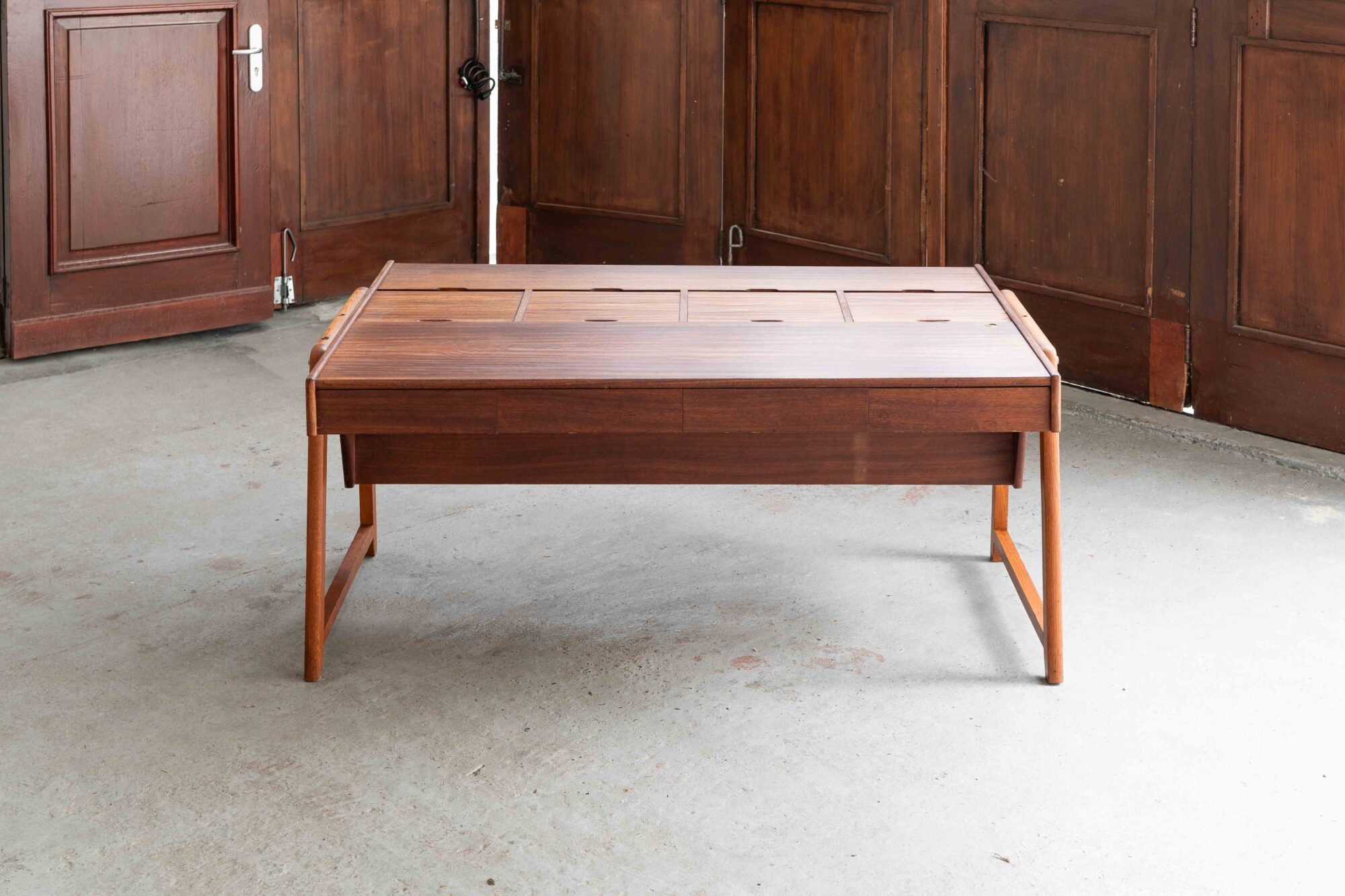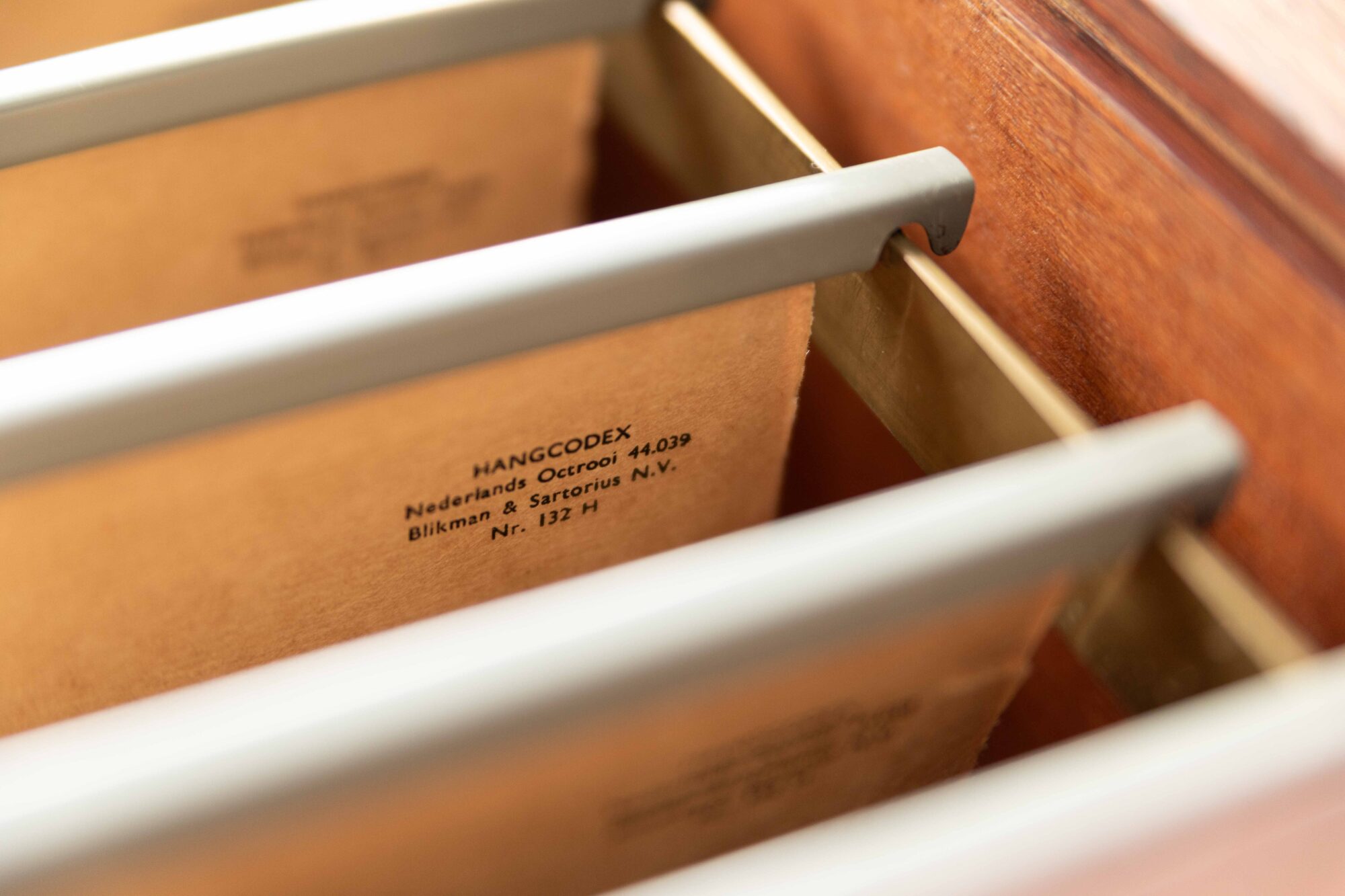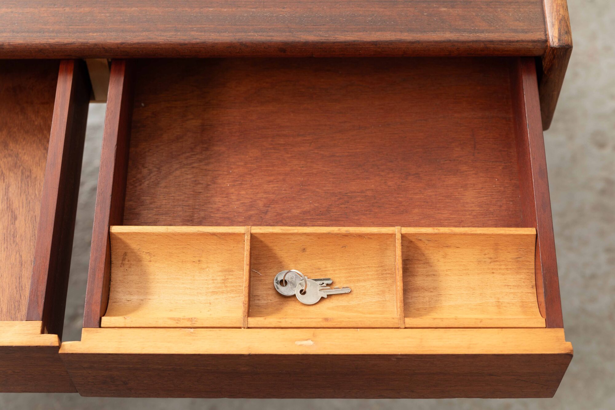 Large double sided architect desk designed by the Norish designer duo Clausen & Maerus, produced by Eden in Rotterdam in the 1960’s. This oak & mahogany desk has 4 drawers and 4 tambour door storage compartiments, that can all be closed with one lock and the two included, original keys. On the other side, there’s open storage compartiments. Behind the tambour doors there’s a few cardboard document classifiers. Some using marks as shown in the pictures, but overall in very good condition.