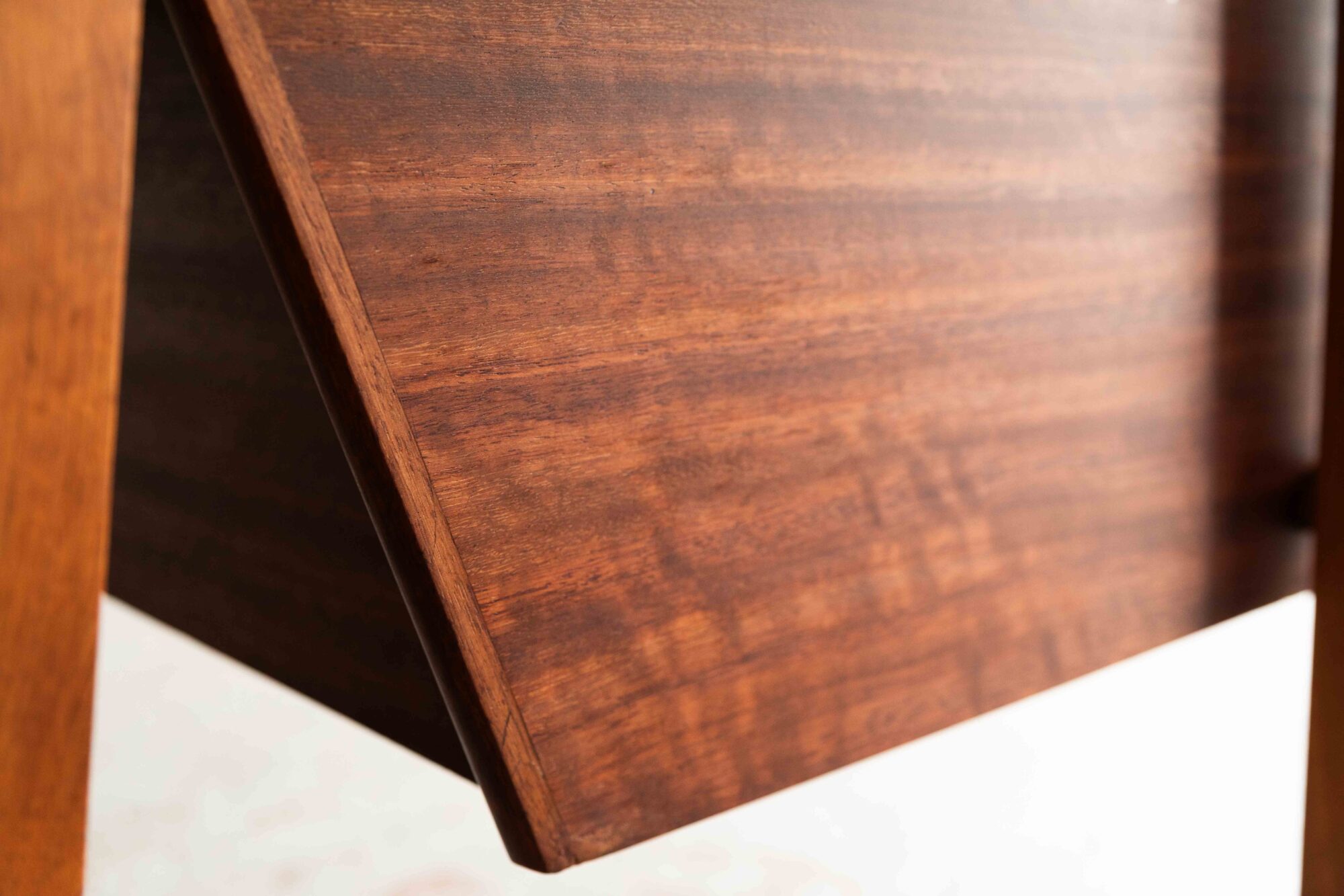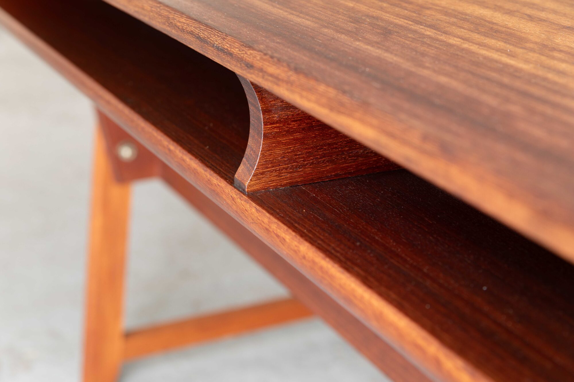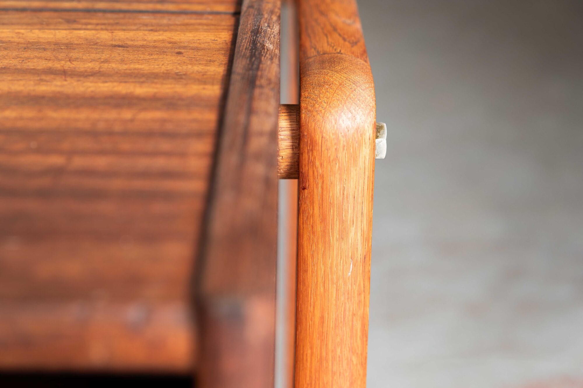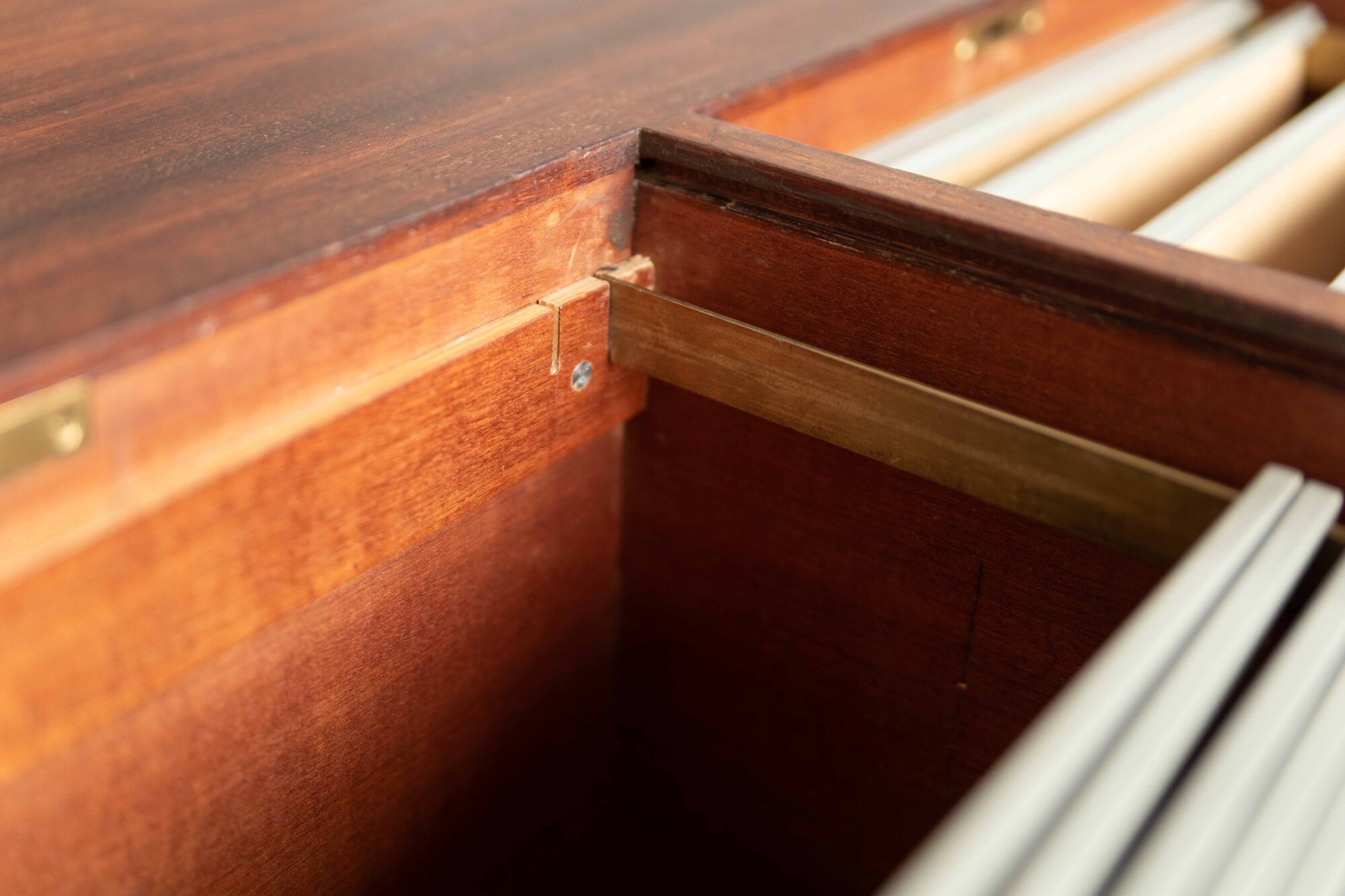 Large double sided architect desk designed by the Norish designer duo Clausen & Maerus, produced by Eden in Rotterdam in the 1960’s. This oak & mahogany desk has 4 drawers and 4 tambour door storage compartiments, that can all be closed with one lock and the two included, original keys. On the other side, there’s open storage compartiments. Behind the tambour doors there’s a few cardboard document classifiers. Some using marks as shown in the pictures, but overall in very good condition.