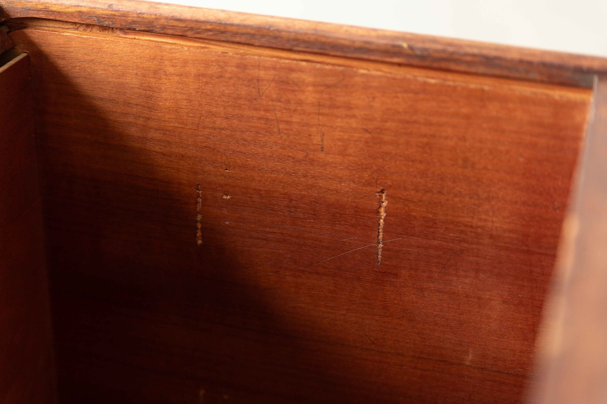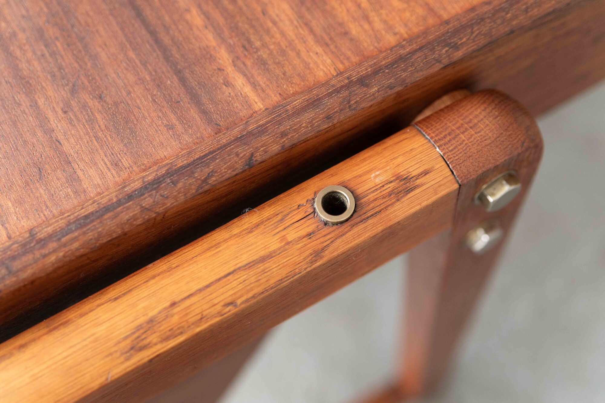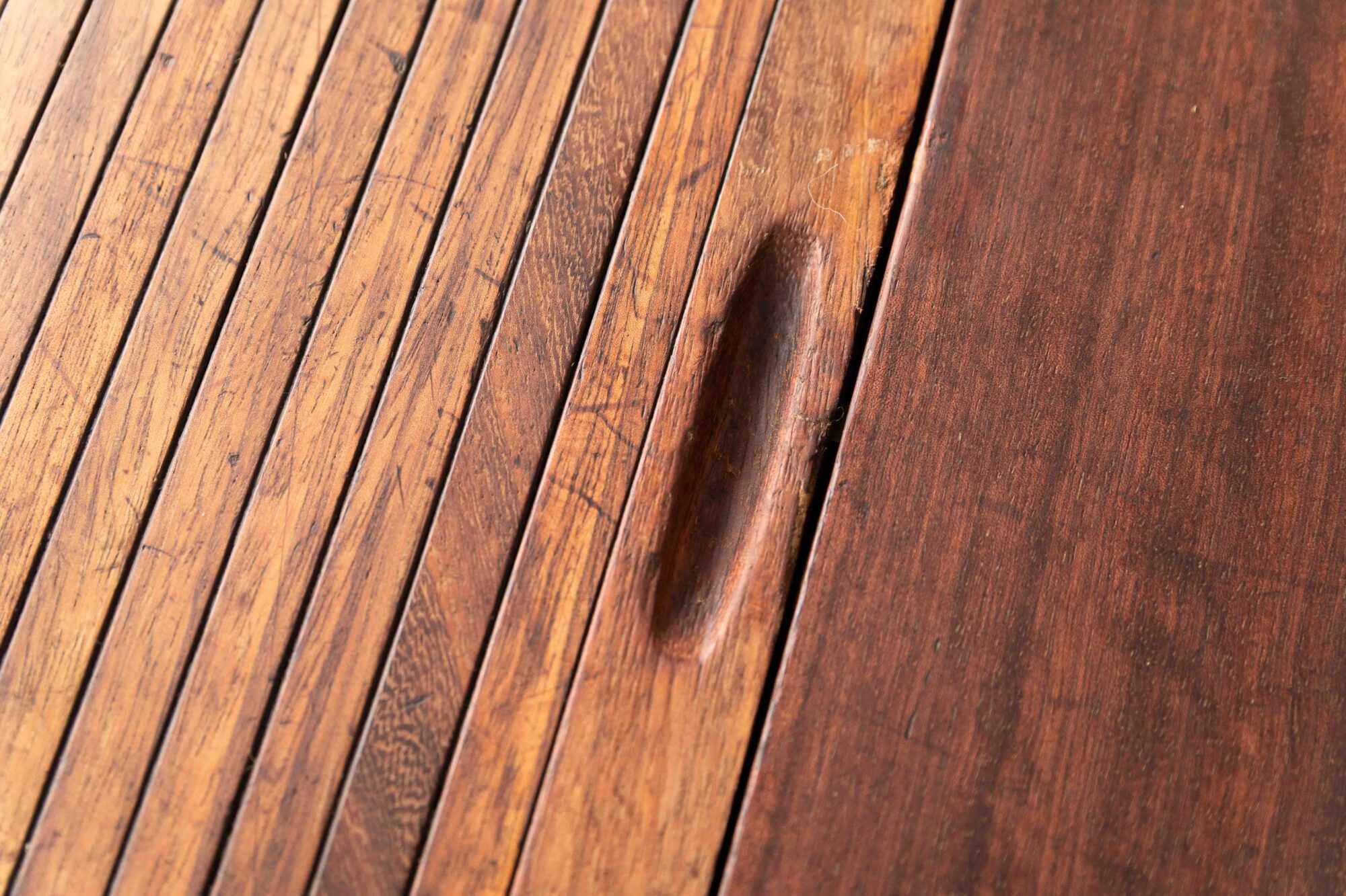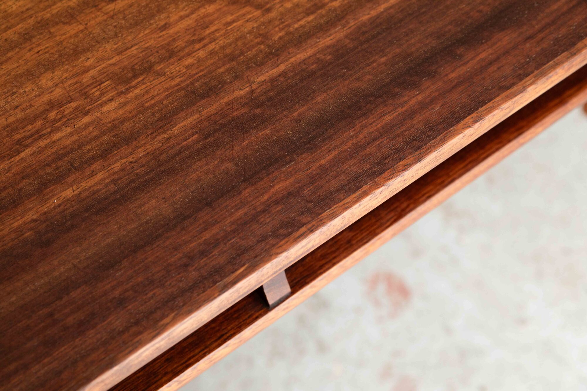 Large double sided architect desk designed by the Norish designer duo Clausen & Maerus, produced by Eden in Rotterdam in the 1960’s. This oak & mahogany desk has 4 drawers and 4 tambour door storage compartiments, that can all be closed with one lock and the two included, original keys. On the other side, there’s open storage compartiments. Behind the tambour doors there’s a few cardboard document classifiers. Some using marks as shown in the pictures, but overall in very good condition.