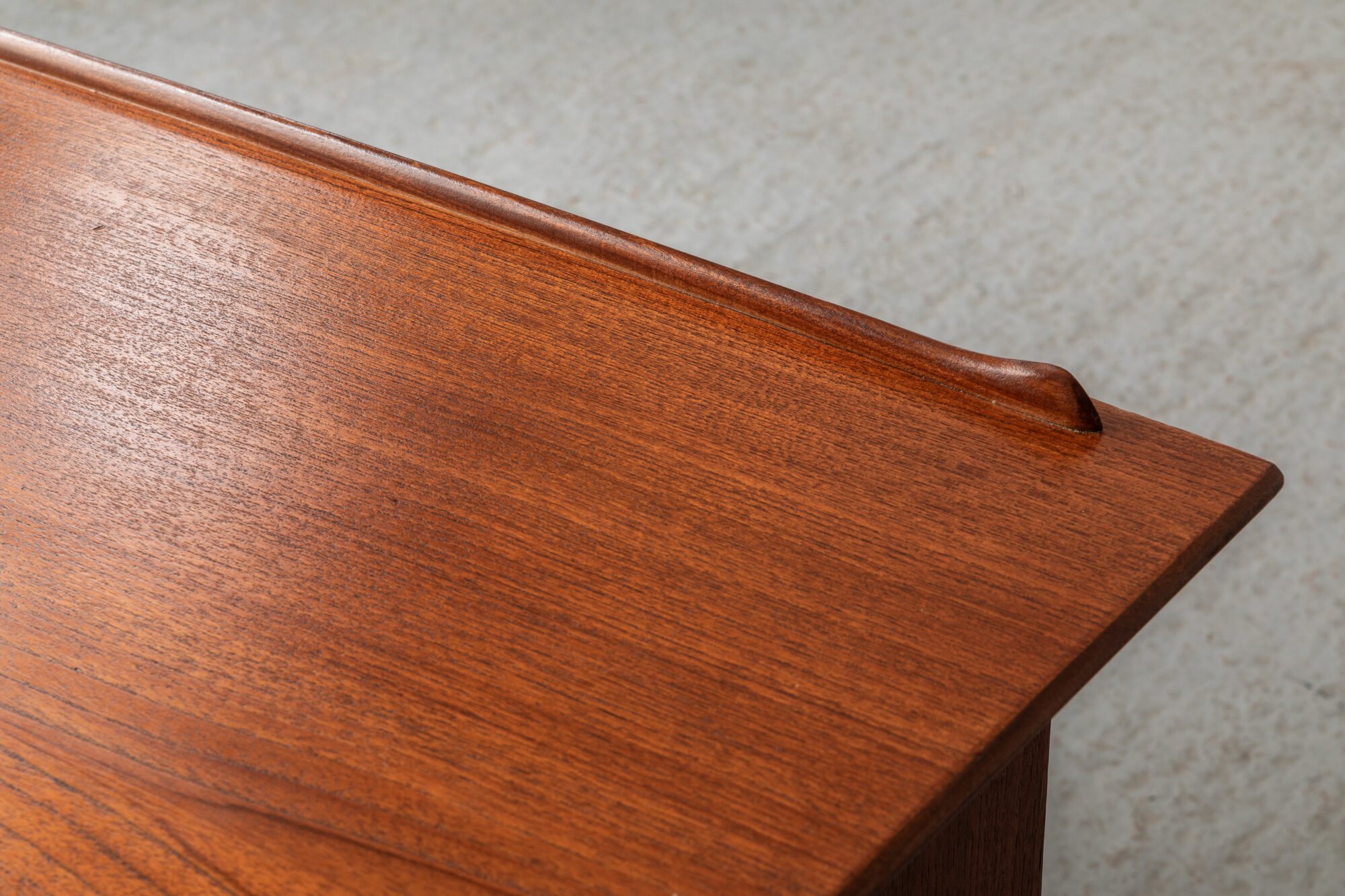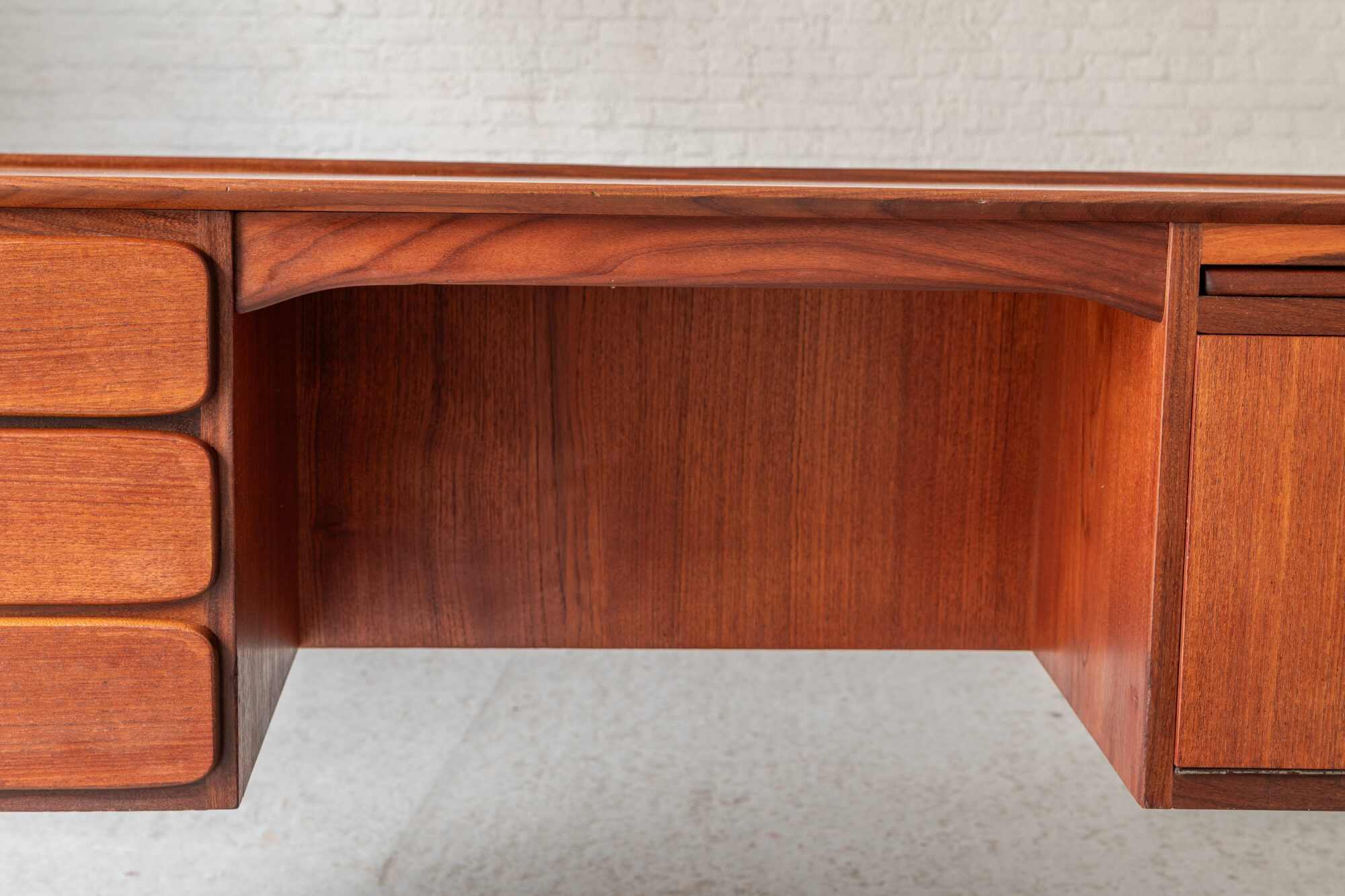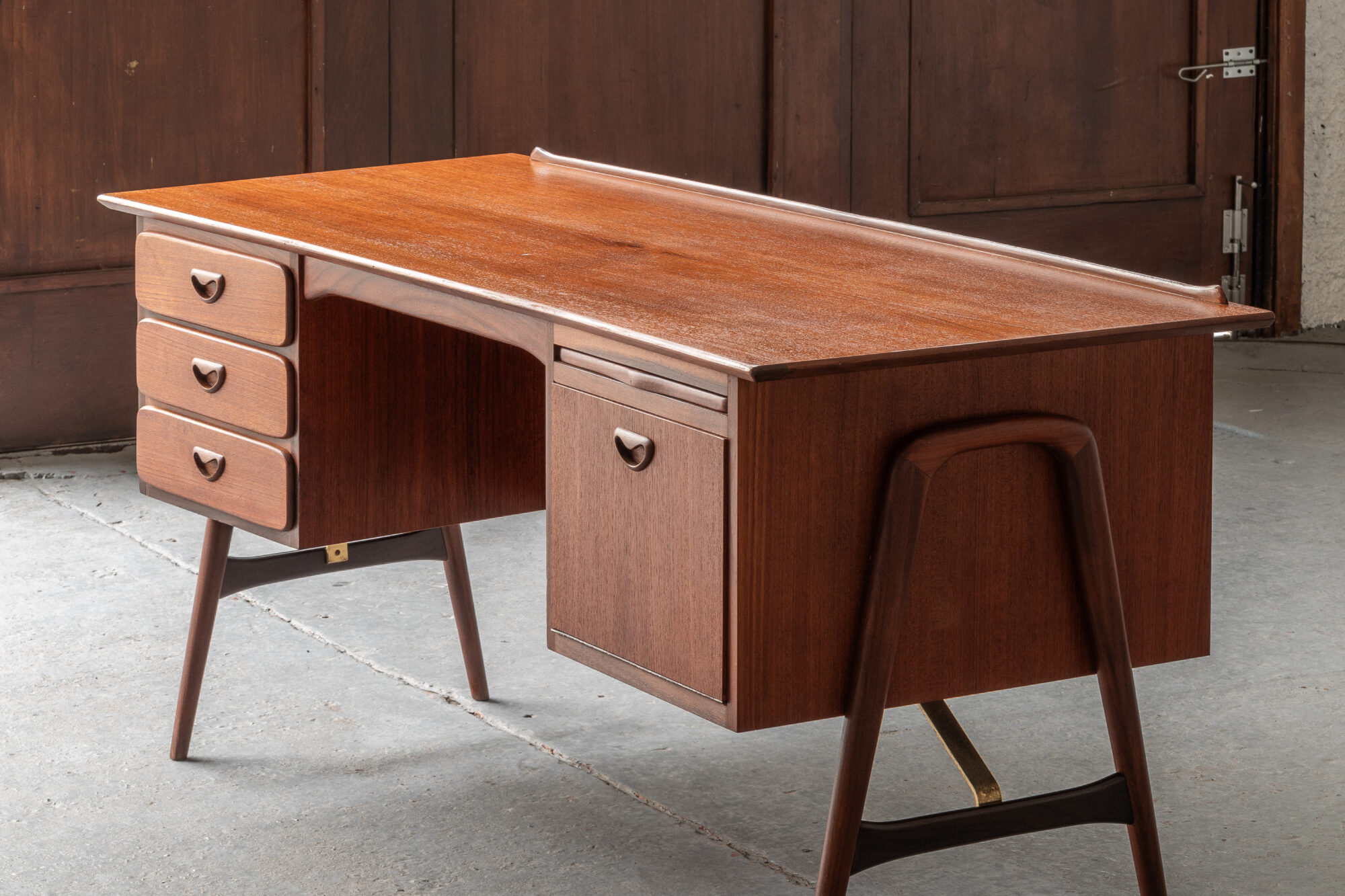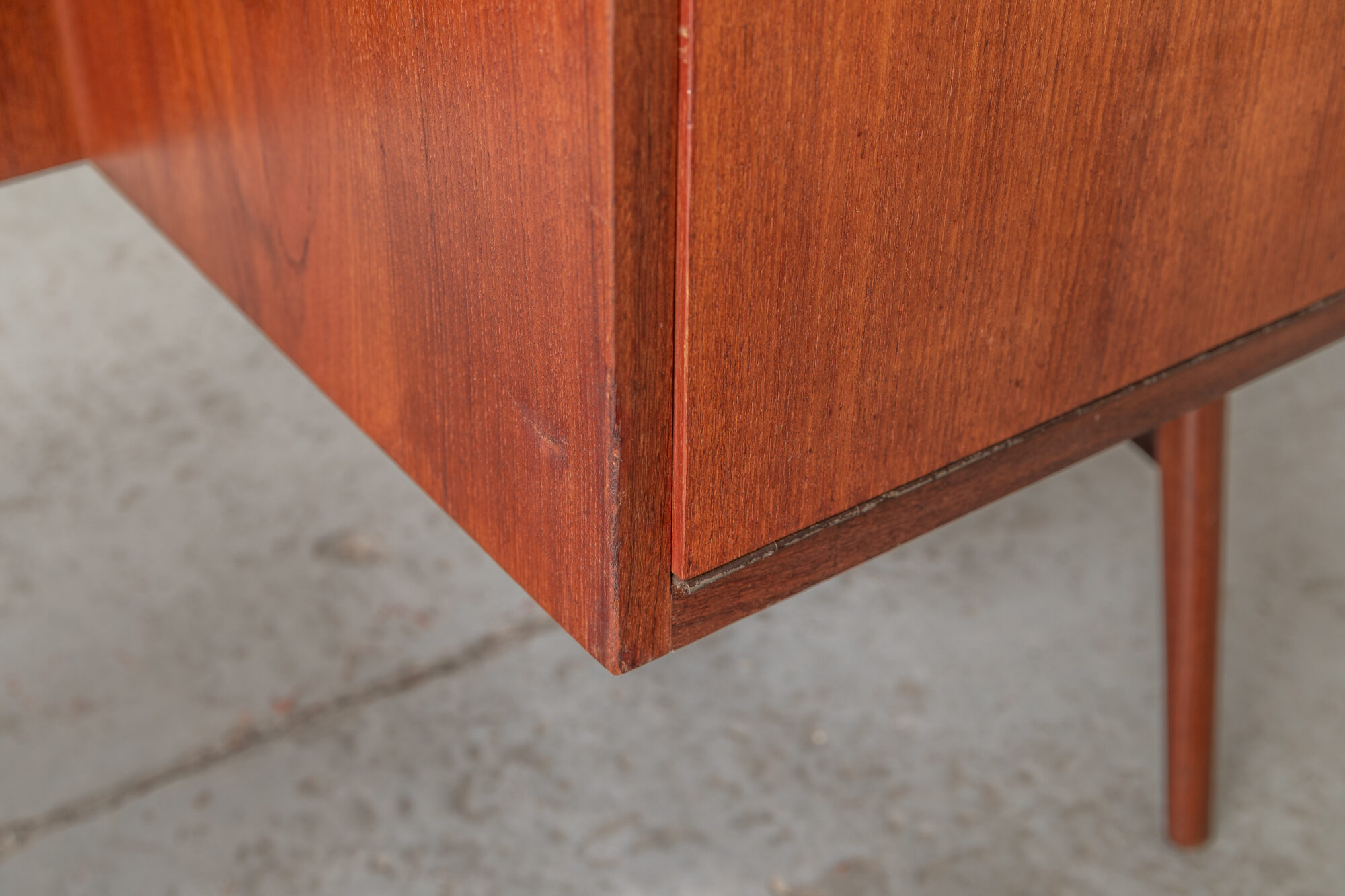 Writing desk, designed by Louis van Teeffelen and produced by Wébé in The Netherlands during the 1960’s. This curved beauty has the distuingished features of a real Van Teeffelen design: the organic handgrips, the slightly slanted legs and beautiful teak wood used for the solid construction and veneer top. With 3 drawers on the left and a storage compartment on the right, you have plenty of space for paper and utensils. There’s also a pull out leaf at the right hand side. The book shelf on the back makes this desk a freestanding piece by excellence. The patinated brass details supporting the cabinets finish it off in style. In good condition with one small dent in the top, as shown in the pictures.
